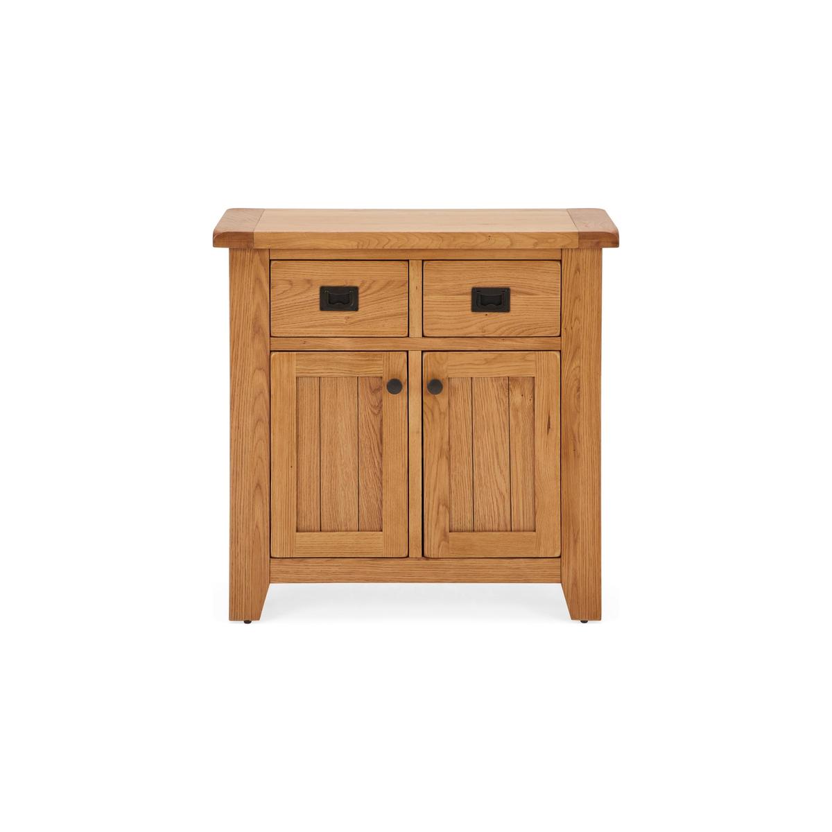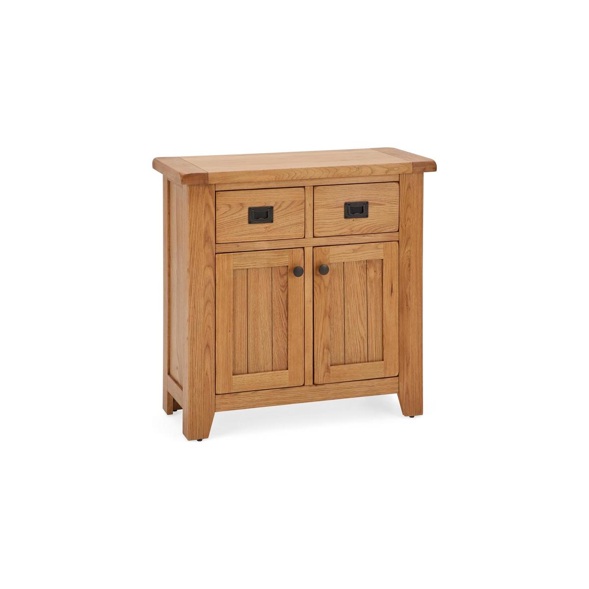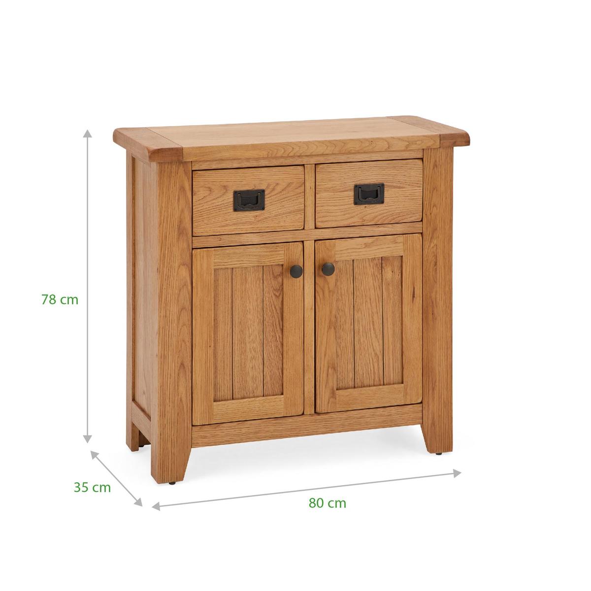Dunelm Exclusive - Designed and Developed by Dunelm. Crafted from solid oak and oak veneer, the timeless Oakville range is built to last and is perfect for busy households. Complete with a waxed finish to enhance and showcase its natural grain, this traditional furniture range features smooth, rounded corners and stunning antique style handles. Offering a great compact storage solution, the fully assembled Oakville mini sideboard has two handy drawers and a single large cupboard. Care Instructions: Wipe carefully with a clean, dry cloth to remove dust and maintain the furniture. Avoid common hazards such as harsh solvents or abrasives as this can damage the furniture. Mop up any spills with a dry cloth. Avoid exposure to direct sunlight or extreme conditions and avoid putting your furniture near heating sources or in highly air-conditioned spaces.