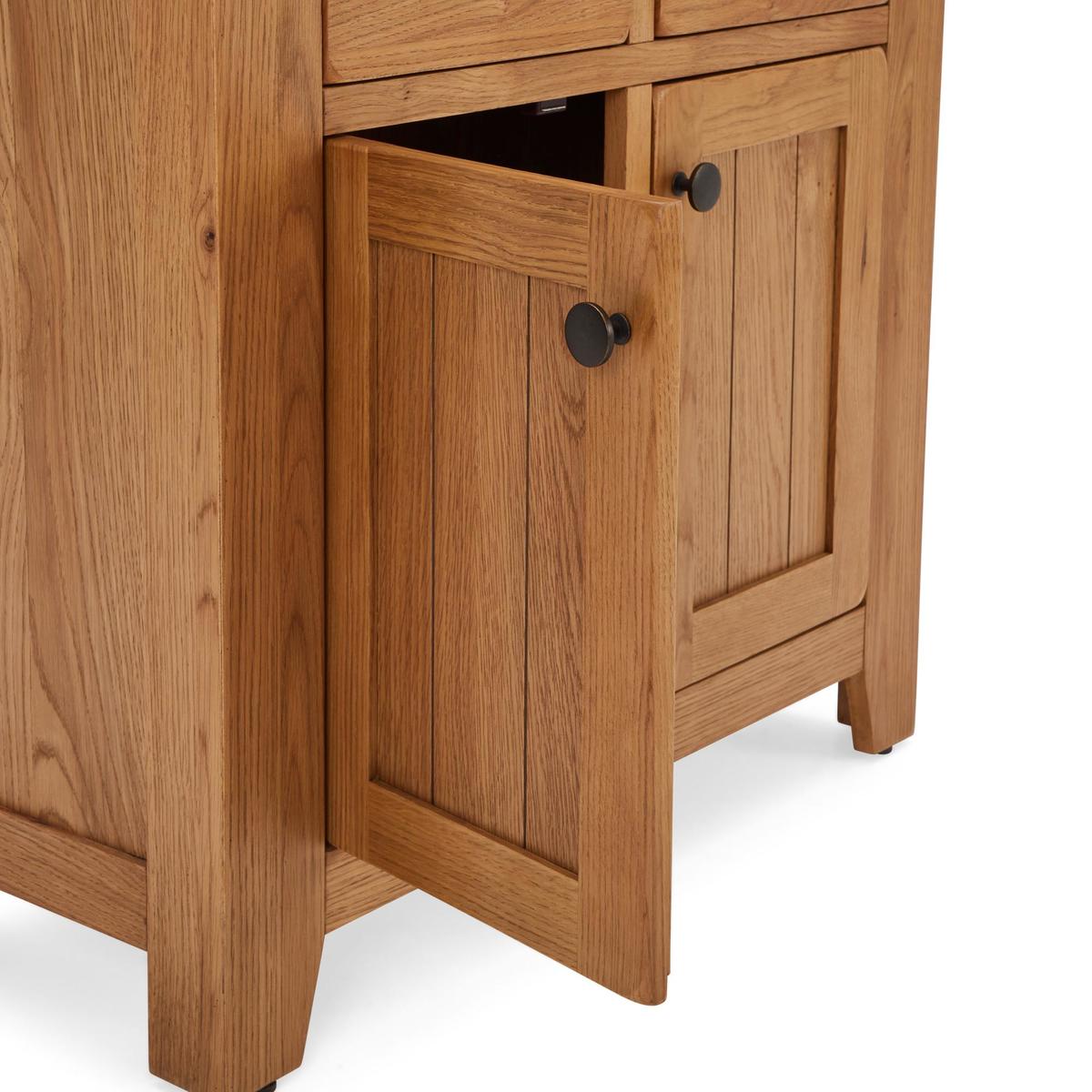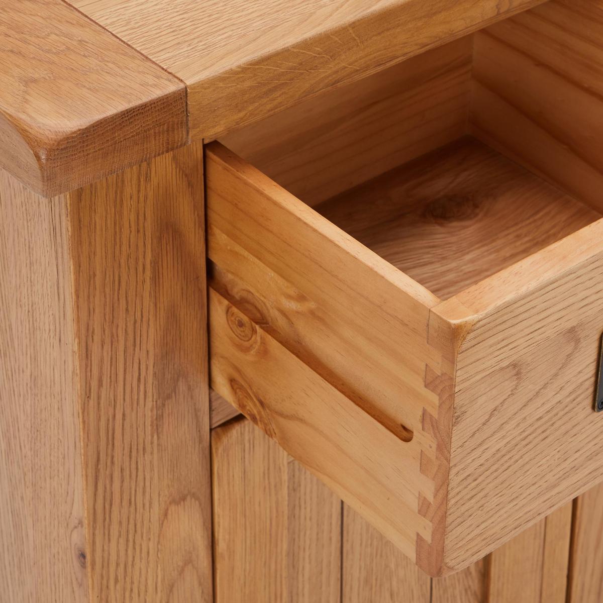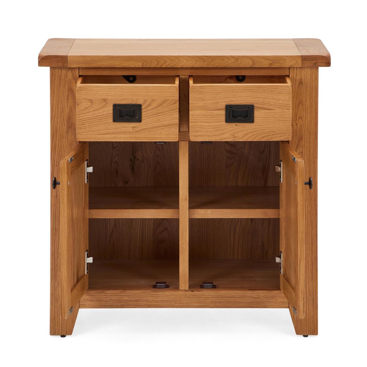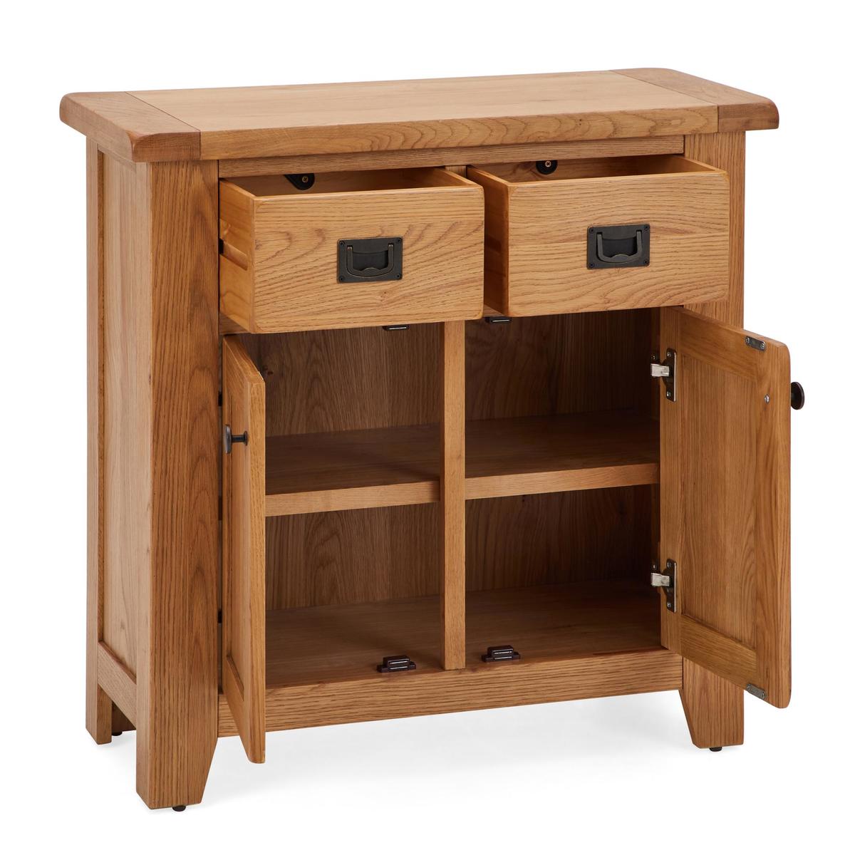 Dunelm Exclusive - Designed and Developed by Dunelm. Crafted from solid oak and oak veneer, the timeless Oakville range is built to last and is perfect for busy households. Complete with a waxed finish to enhance and showcase its natural grain, this traditional furniture range features smooth, rounded corners and stunning antique style handles. Offering a great compact storage solution, the fully assembled Oakville mini sideboard has two handy drawers and a single large cupboard. Care Instructions: Wipe carefully with a clean, dry cloth to remove dust and maintain the furniture. Avoid common hazards such as harsh solvents or abrasives as this can damage the furniture. Mop up any spills with a dry cloth. Avoid exposure to direct sunlight or extreme conditions and avoid putting your furniture near heating sources or in highly air-conditioned spaces.