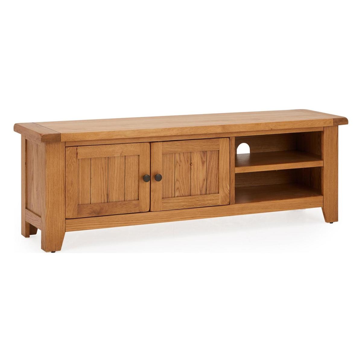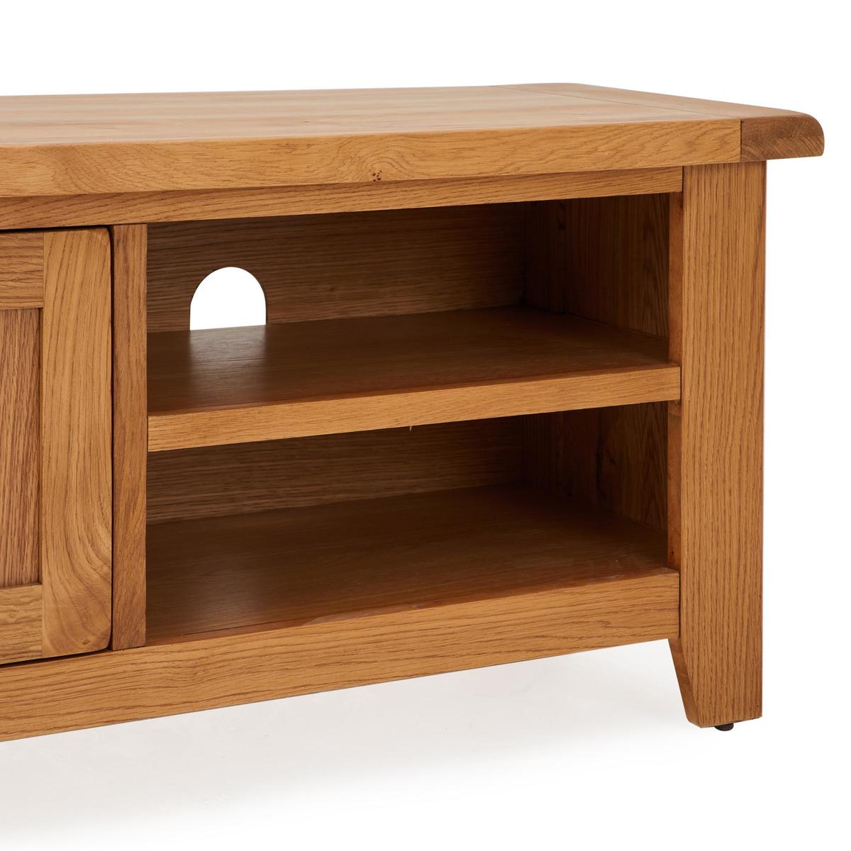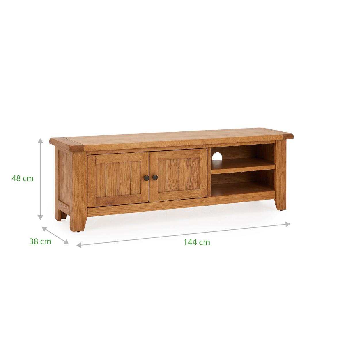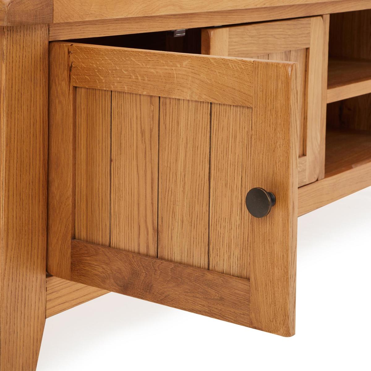 Dunelm Exclusive - Designed and Developed by Dunelm. Crafted from solid oak and oak veneer, the timeless Oakville range is built to last and is perfect for busy households. Complete with a waxed finish to enhance and showcase its natural grain, this traditional furniture range features smooth, rounded corners and stunning antique style handles. Providing plenty of storage space, this fully assembled TV stand features a spacious cupboard and two open shelves, complete with individual cable apertures.