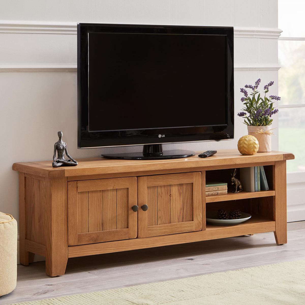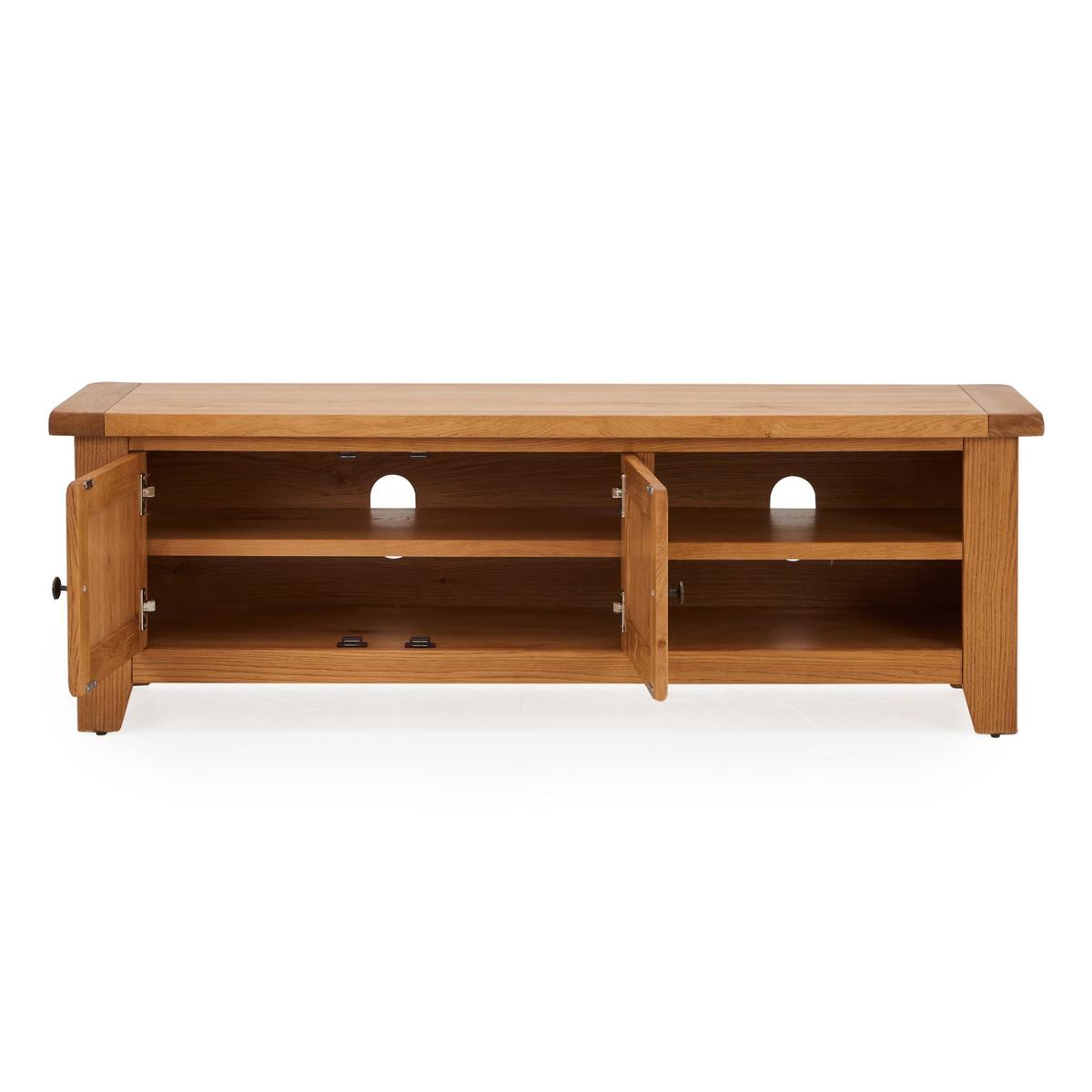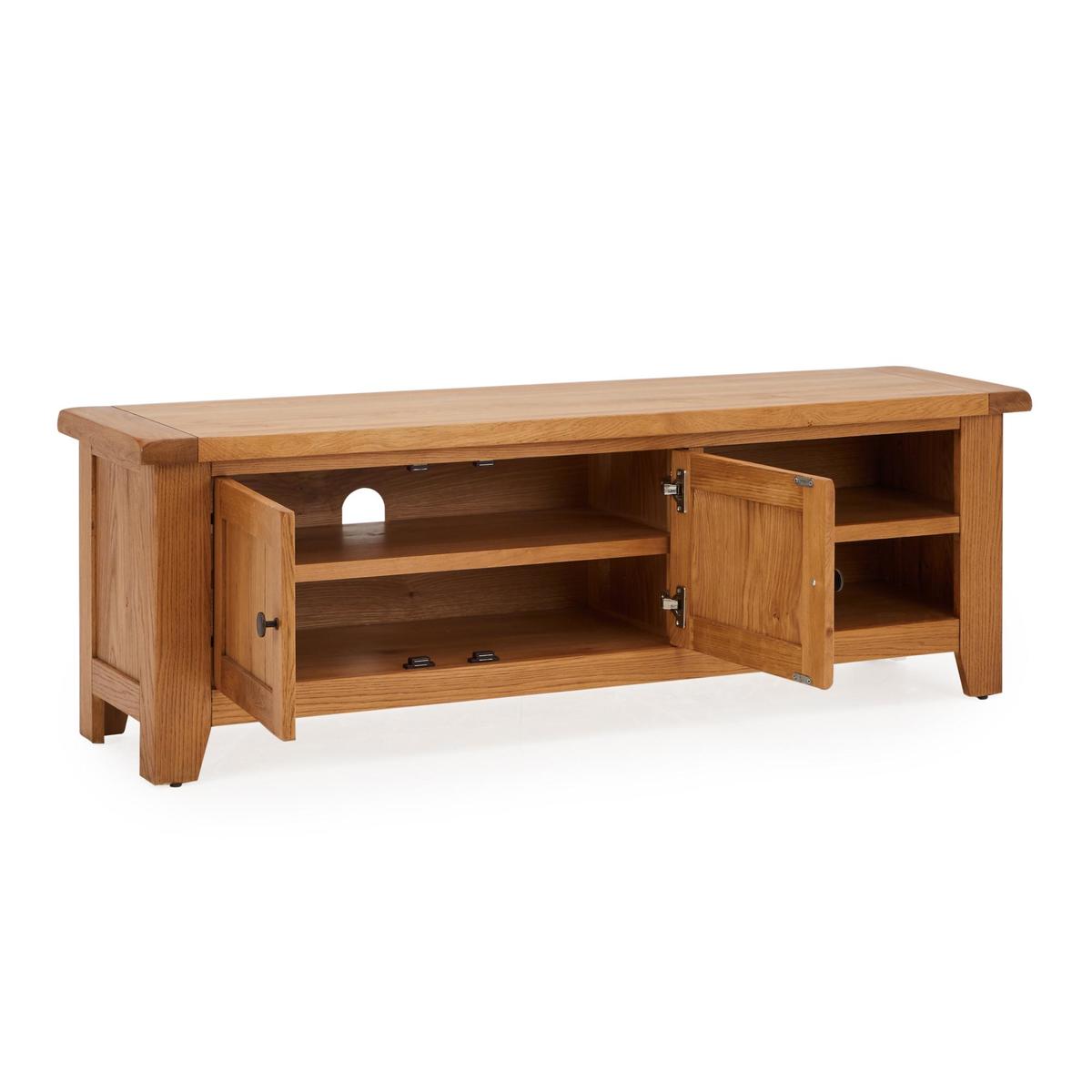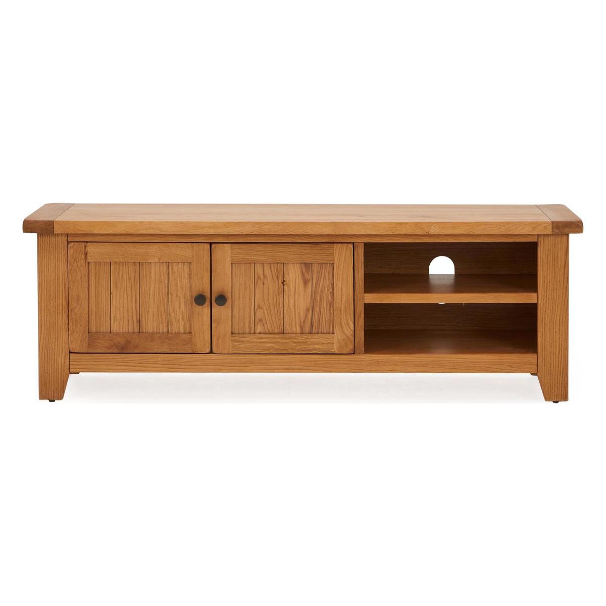 Dunelm Exclusive - Designed and Developed by Dunelm. Crafted from solid oak and oak veneer, the timeless Oakville range is built to last and is perfect for busy households. Complete with a waxed finish to enhance and showcase its natural grain, this traditional furniture range features smooth, rounded corners and stunning antique style handles. Providing plenty of storage space, this fully assembled TV stand features a spacious cupboard and two open shelves, complete with individual cable apertures.