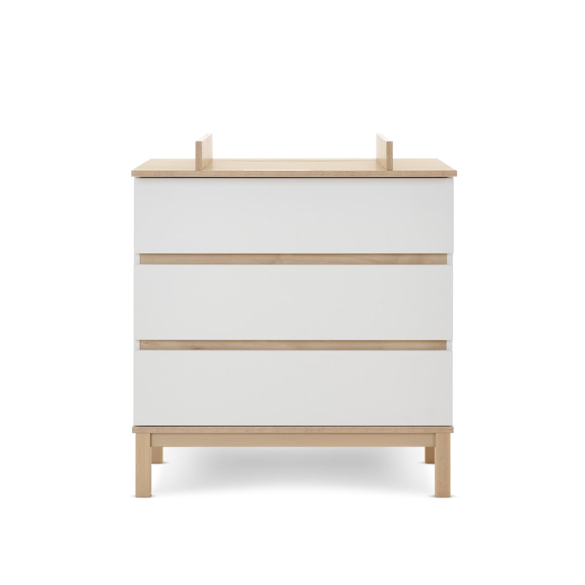 * Matching Cot Bed and Changing Unit* Bed Converts to Toddler Bed Crafted with sleek modern craftsmanship and offering two-tone colourways, this room set is a versatile and functional addition to your nursery. With an adjustable, three-position base height, the bed seamlessly transitions from a secure crib suitable from birth to a toddler bed accommodating children up to approximately five years old. The removable side and safety rail ensure a smooth evolution as your child grows. Please note, a mattress measuring 140 x 70cm, available separately, perfectly complements this set. The matching Changing Unit features three large drawers with a chic no-handle design, offering ample storage. The cleverly positioned changing top facilitates precious one-to-one time with your baby, and once the changer is no longer required, the removable top converts it into a stylish chest of drawers, complementing any room decor for years to come.