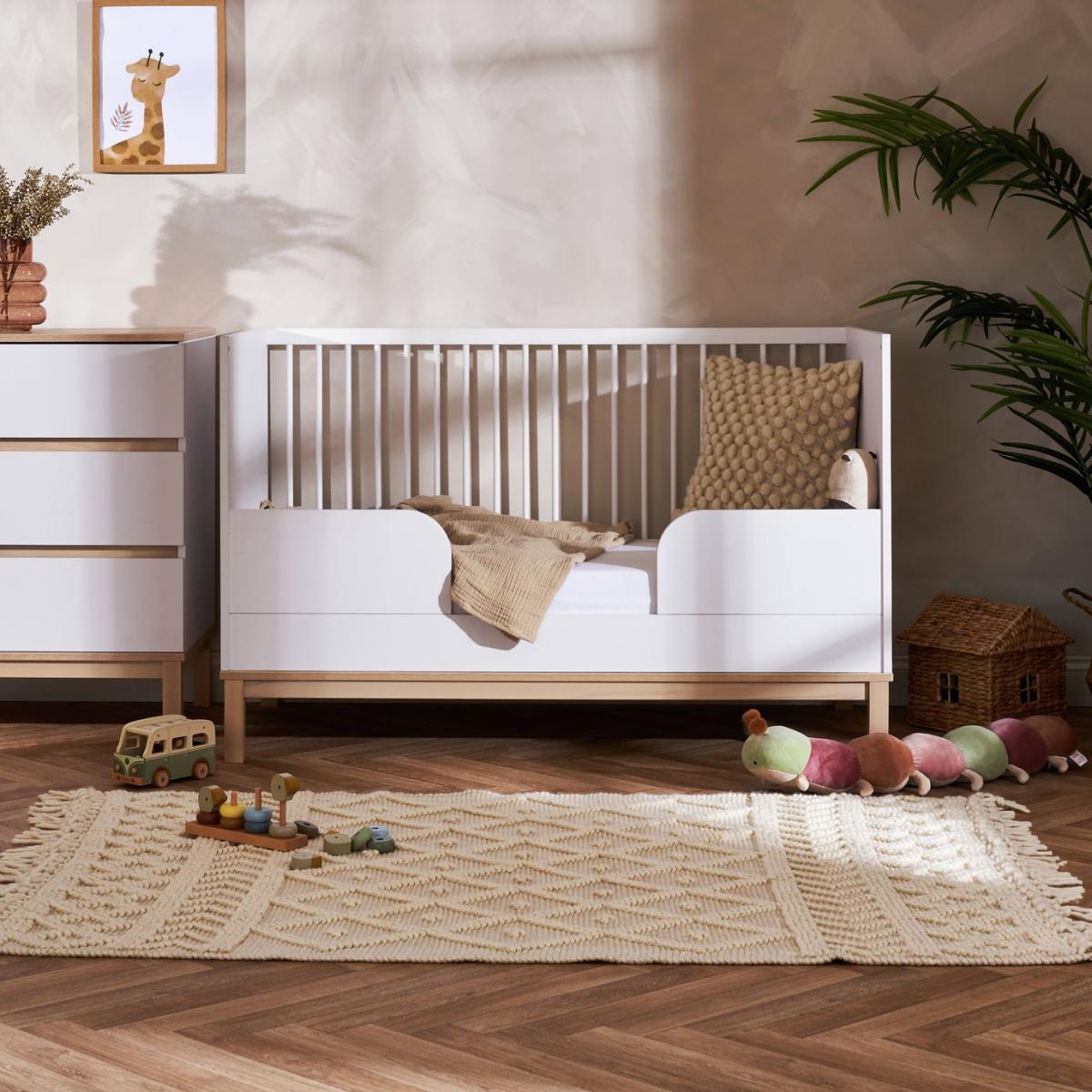 The name Astrid is of Scandinavian origin and means "divinely beautiful". With sleek lines, a two-tone colourway in a choice of white or Satin and super modern handle-less drawers and doors this collection certainly lives up to its name. With both practicality and style, The Astrid is the perfect addition to any dream nursery. Part of the Astrid collection. Suitable from birth. Toddler bed suitable for ages 2 year to 5 year. Made from wood. Cot Features Size L144, W75, H93cm. Weight 39.5kg. 3 position adjustable mattress base - allows you to lower the height of the mattress as your baby learns to sit and stand. Mattress base adjustable height 30cm, 46cm, 46cm. Height under cot 14cm. Converts to toddler bed. General information Self-assembly. Manufacturer's 2 year guarantee.