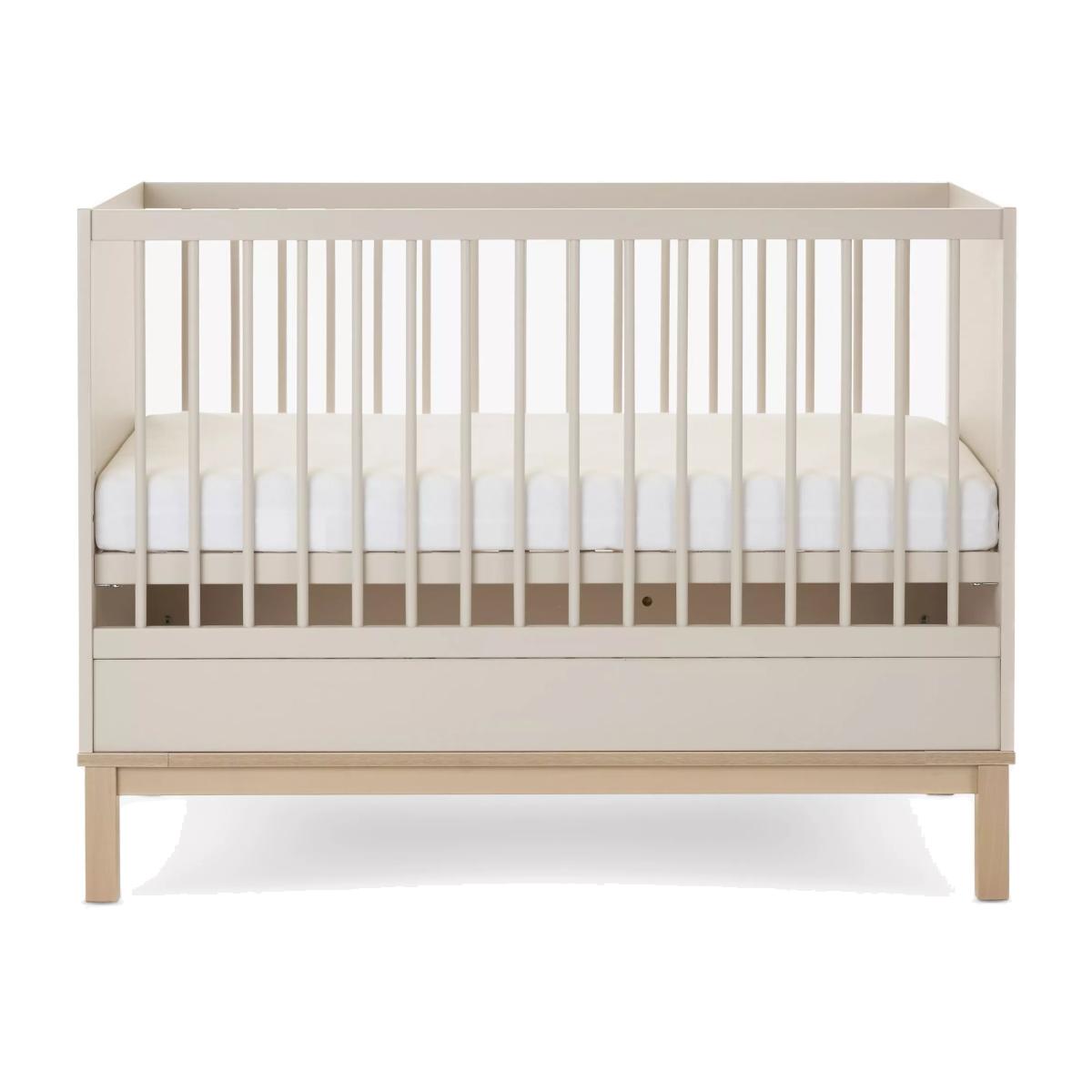 The Astrid mini cot bed will grow with your little one. Suitable from birth until approximately 4 years old, the 3-position base height ensures there is a setting for each of your child’s milestones. When it's time to transition to a big bed the included dual ended safety rail will provide reassurance and familiarity during an often-daunting time. This cot bed requires an Obaby 120 x 70cm mattress, (available separately).