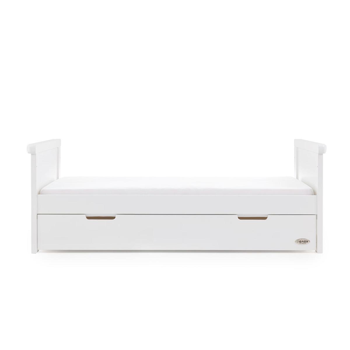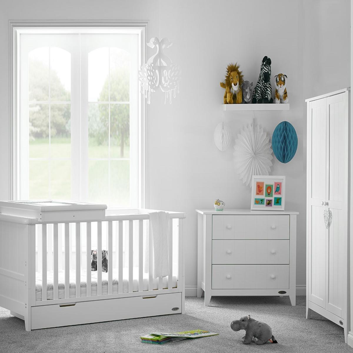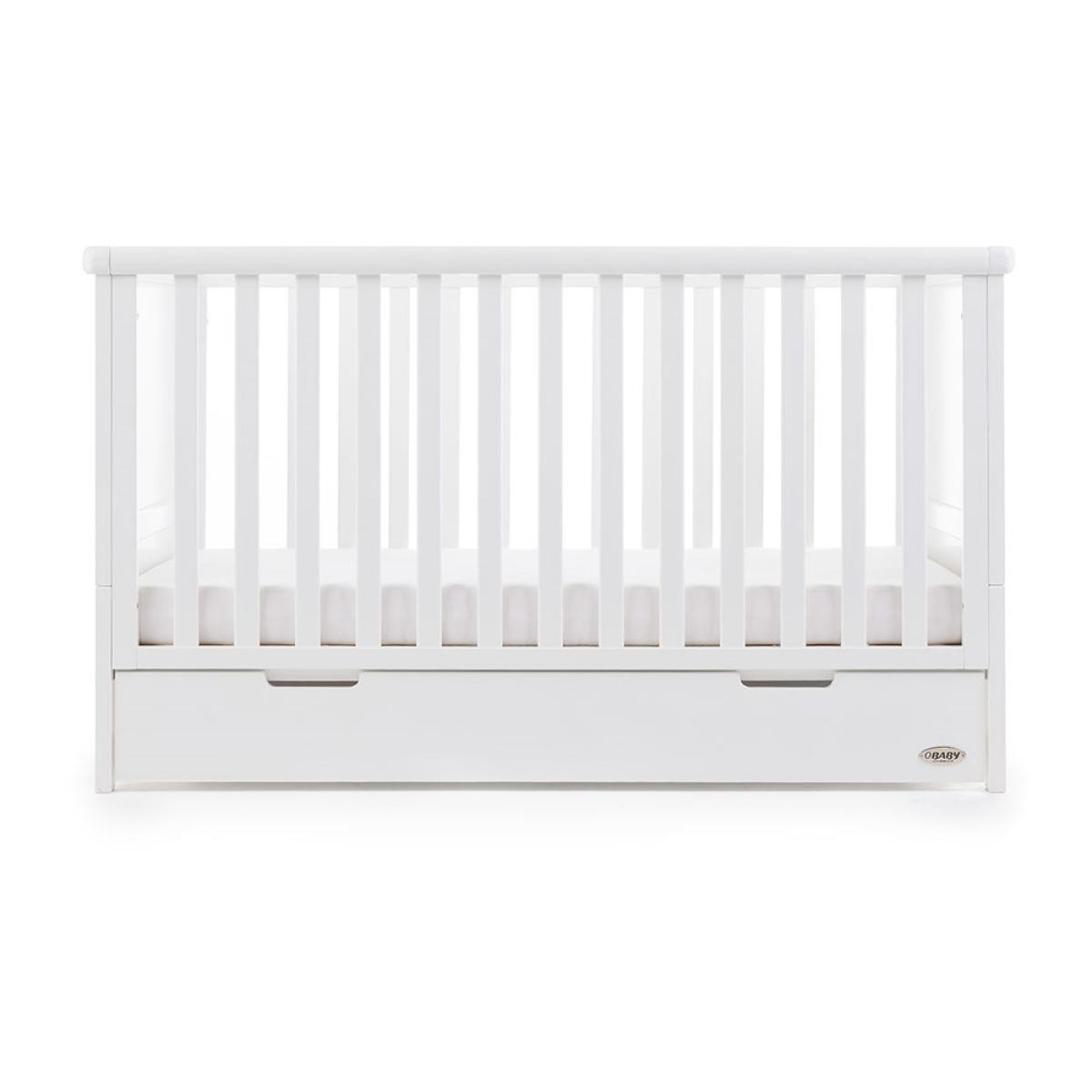 Ticking every box, the Obaby Belton Cot Bed 3 Piece Nursery Furniture Set is perfect for your little one! Suitable from birth to 4 years,the stylish cot bed can be adjusted to suit the needs of your little one as they continue to grow! Featuring 3 height settings, when your baby starts sitting and standing independently, the mattress base can easily be lowered. And when they've outgrown their baby bed, remove the sides and convert the bed frame from a cot to a junior bed and continue using this gorgeous design for years to come! Boasting a spacious under-bed drawer, nursery essentials and toys can be neatly stowed away. The matching dresser features 3 full length drawers with traditional handles and smooth gliding runners; making it practical and stylish. And with the option to add a multi changer top, quickly convert the dresser into a baby changing table and utilise your space. The double wardrobe features soft close doors for safety and when opened up they reveal a full length shelf and two hanging rails. There's plenty of space for essentials and of course keeping their adorable outfits neat and tidy! Your little one has everything they could possibly need!.