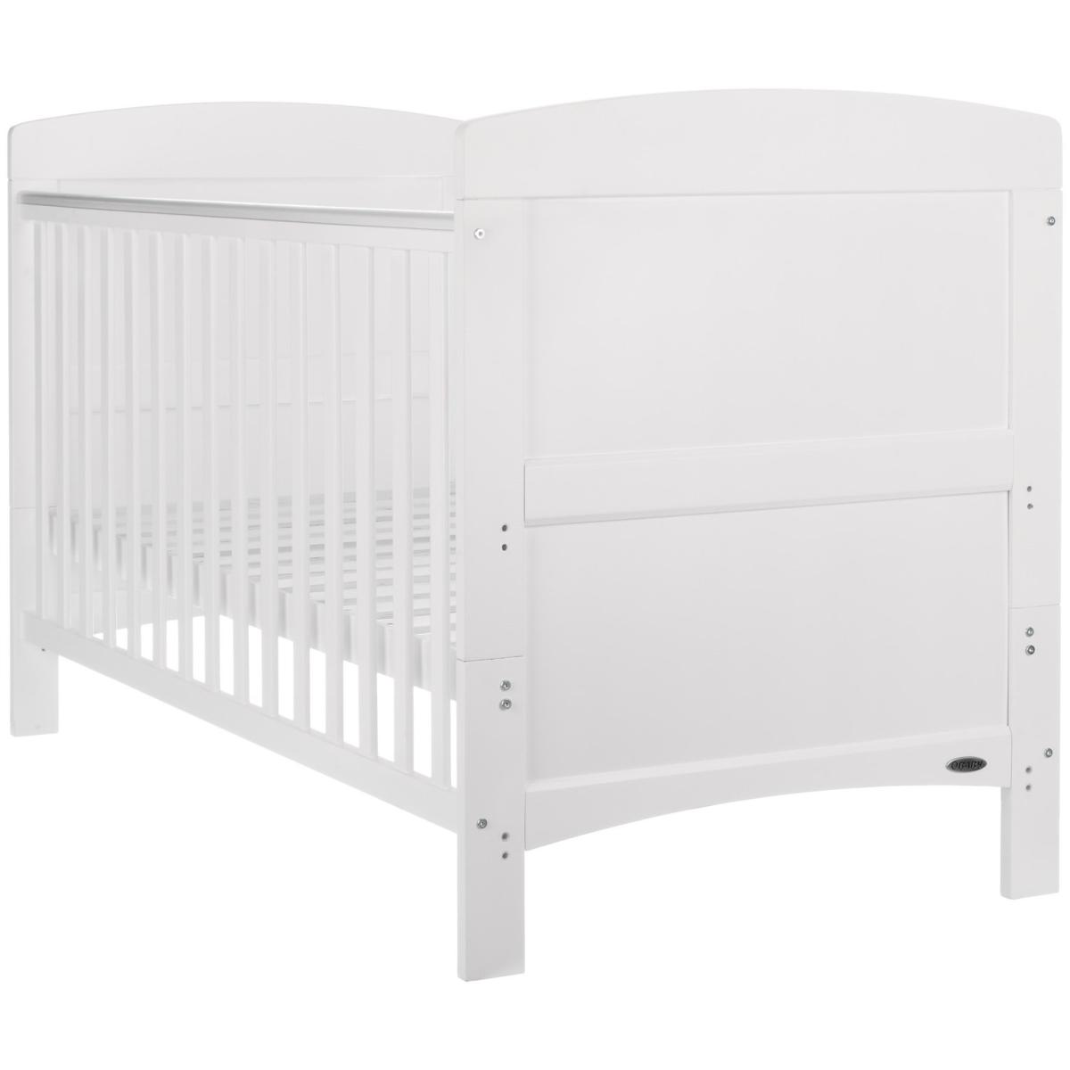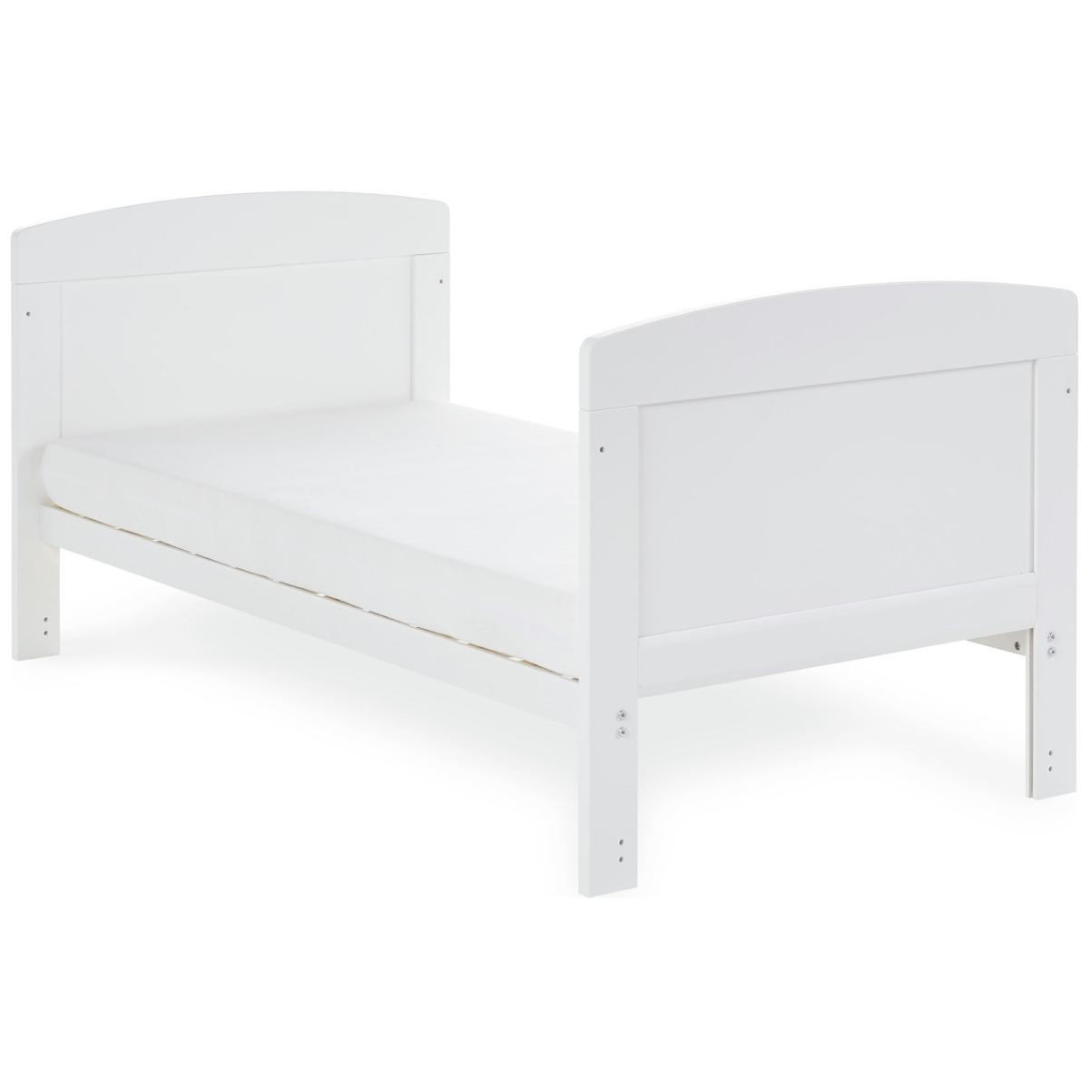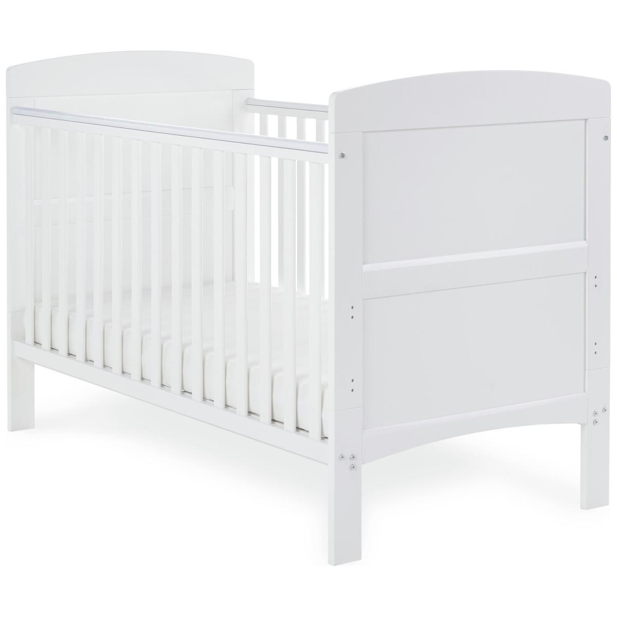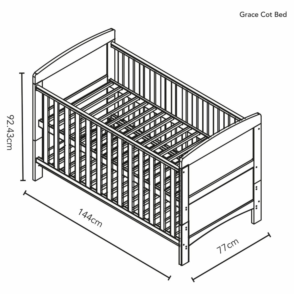 The Obaby Grace cot bed balances simplicity and elegance with a selection of valuable features. Open slatted sides and teething rails add peace of mind and, as your child grows, the mattress base can be lowered, with three base heights available in total, providing extra reassurance. Once your little one is ready, the cot bed can convert into a stylish junior bed suitable for a child up to approximately four years old. Includes a perfect fitting, 10cm thick, water-resistant, fully breathable and hypo-allergenic polyester fibre pad mattress. Part of the Obaby collection. Suitable from birth. Made from wood. Cot Features Size L144, W78, H93cm. Weight 19kg. Teething rails - protects your baby's gums once they are teething and have started to chew. 3 position adjustable mattress base - allows you to lower the height of the mattress as your baby learns to sit and stand. Height under cot 17cm. Converts to toddler bed. Mattress Features Mattress included - Mattress size L140, W70, D10cm. Firm mattress. Hypoallergenic. Removable washable cover. General information Self-assembly. Manufacturer's 2 year guarantee.