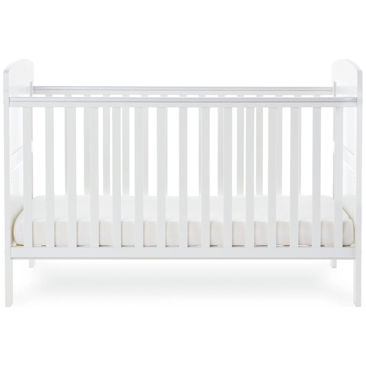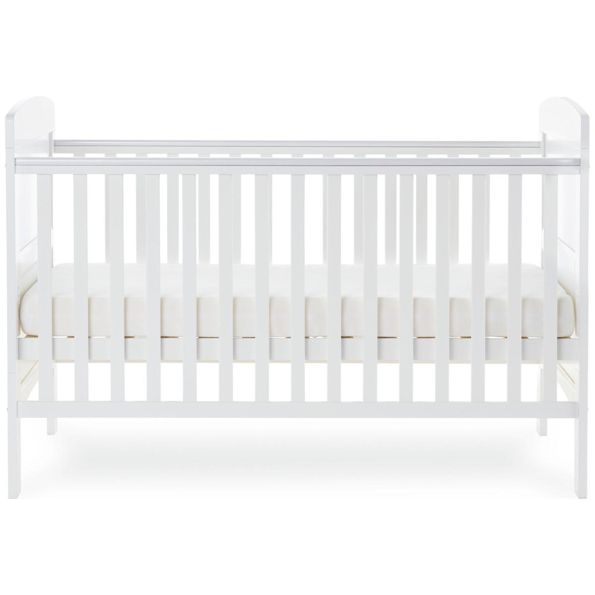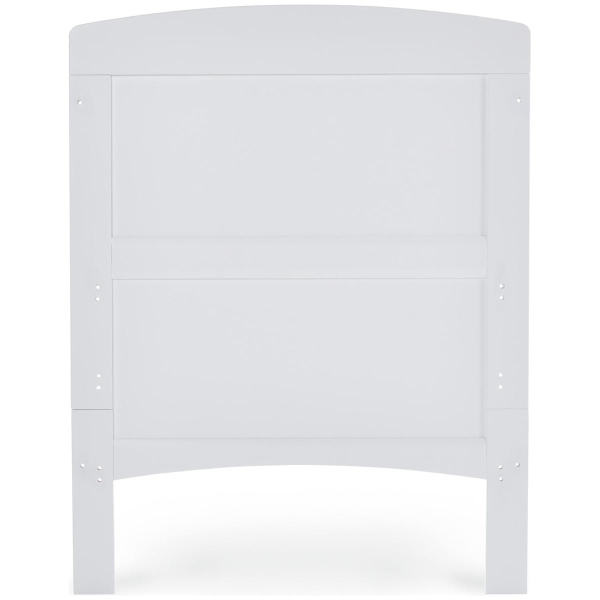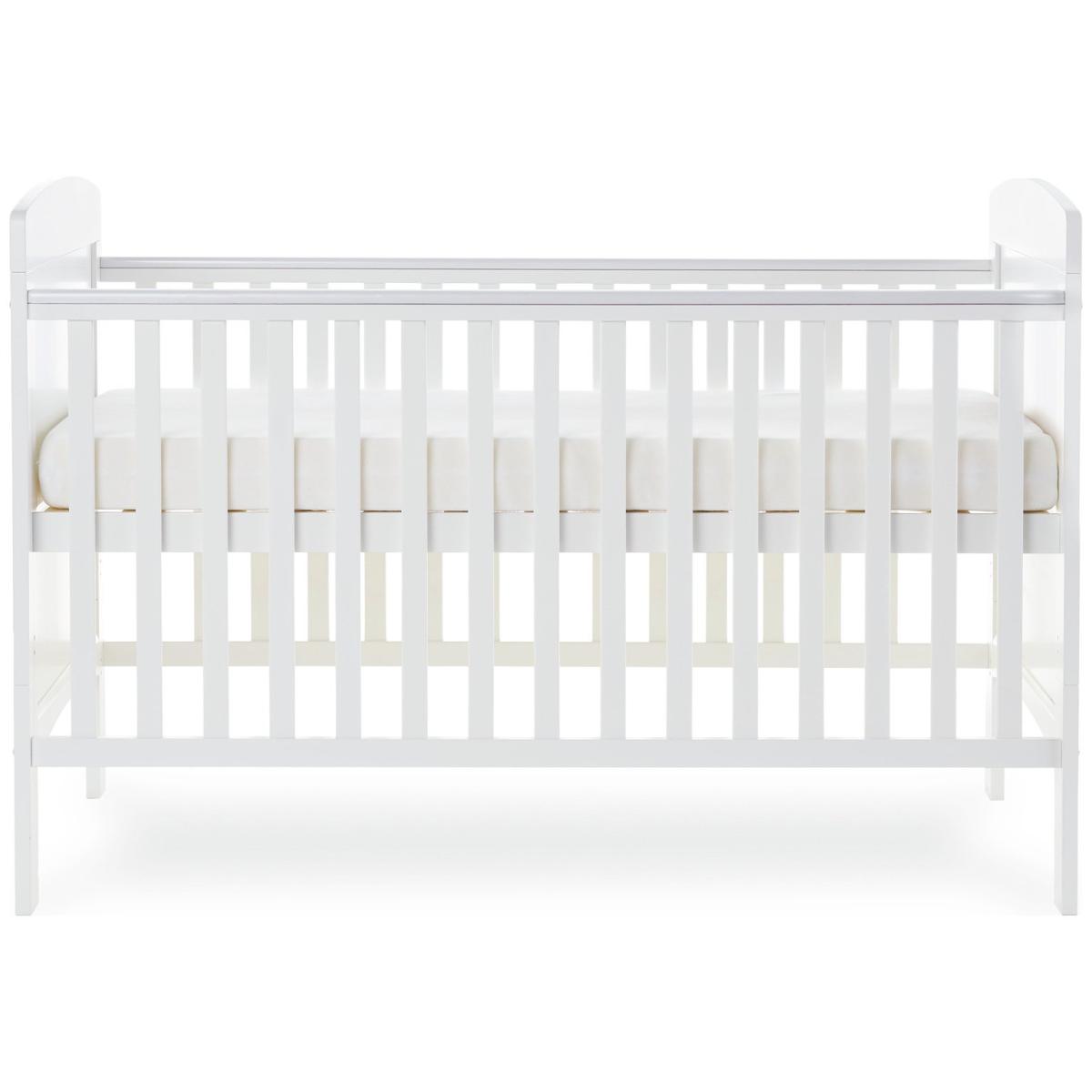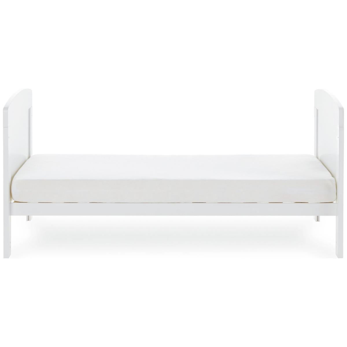 The Obaby Grace cot bed balances simplicity and elegance with a selection of valuable features. Open slatted sides and teething rails add peace of mind and, as your child grows, the mattress base can be lowered, with three base heights available in total, providing extra reassurance. Once your little one is ready, the cot bed can convert into a stylish junior bed suitable for a child up to approximately four years old. Includes a perfect fitting, 10cm thick, water-resistant, fully breathable and hypo-allergenic polyester fibre pad mattress. Part of the Obaby collection. Suitable from birth. Made from wood. Cot Features Size L144, W78, H93cm. Weight 19kg. Teething rails - protects your baby's gums once they are teething and have started to chew. 3 position adjustable mattress base - allows you to lower the height of the mattress as your baby learns to sit and stand. Height under cot 17cm. Converts to toddler bed. Mattress Features Mattress included - Mattress size L140, W70, D10cm. Firm mattress. Hypoallergenic. Removable washable cover. General information Self-assembly. Manufacturer's 2 year guarantee.