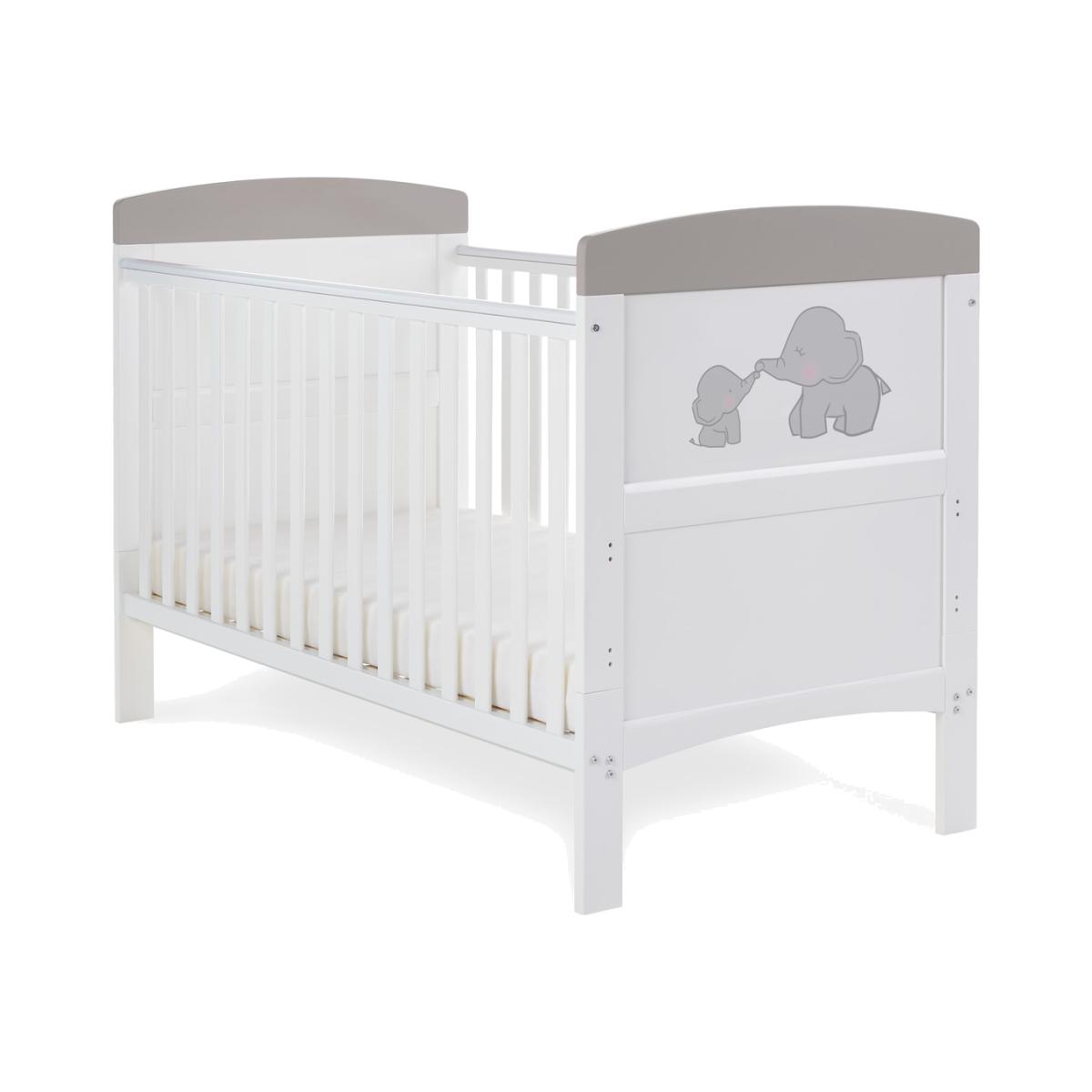 Dimensions H93 x W78 x D144cm Features. OBABY Grace Inspire Cot Bed. Adjustable three-position mattress height. Converts into a stylish toddler bed. Protective teething rails along both side rails. Suitable from birth to approximately four years old. Requires 140 x 70cm mattress Illustrations on the bed end adds character to any nursery Balancing simplicity and style with a selection of valuable features the Grace Inspire range of cot beds from Obaby are the perfect option for parents wanting to add a splash of colour and unique designs to little one’s first room. Symbolise the special bond between you and your “Mini Me” with the Me and; Mini Me Elephants cot bed featuring a cute design and soothing grey end tops. The Grace Inspire features an adjustable three-position base the top setting allows your baby to be taken in and out of the cot bed without unnecessary bending then as your child learns to sit and stand you can adjust the base by a further two positions to keep them safe and secure. The presence of teething rails ensure their delicate first teeth are protected at all times. Once your little one is ready to progress to a bed the Grace Inspire cot bed can convert seamlessly into a cosy and stylish junior bed suitable for a child up to approximately four years old meaning the Grace offers maximum durability and great value. .