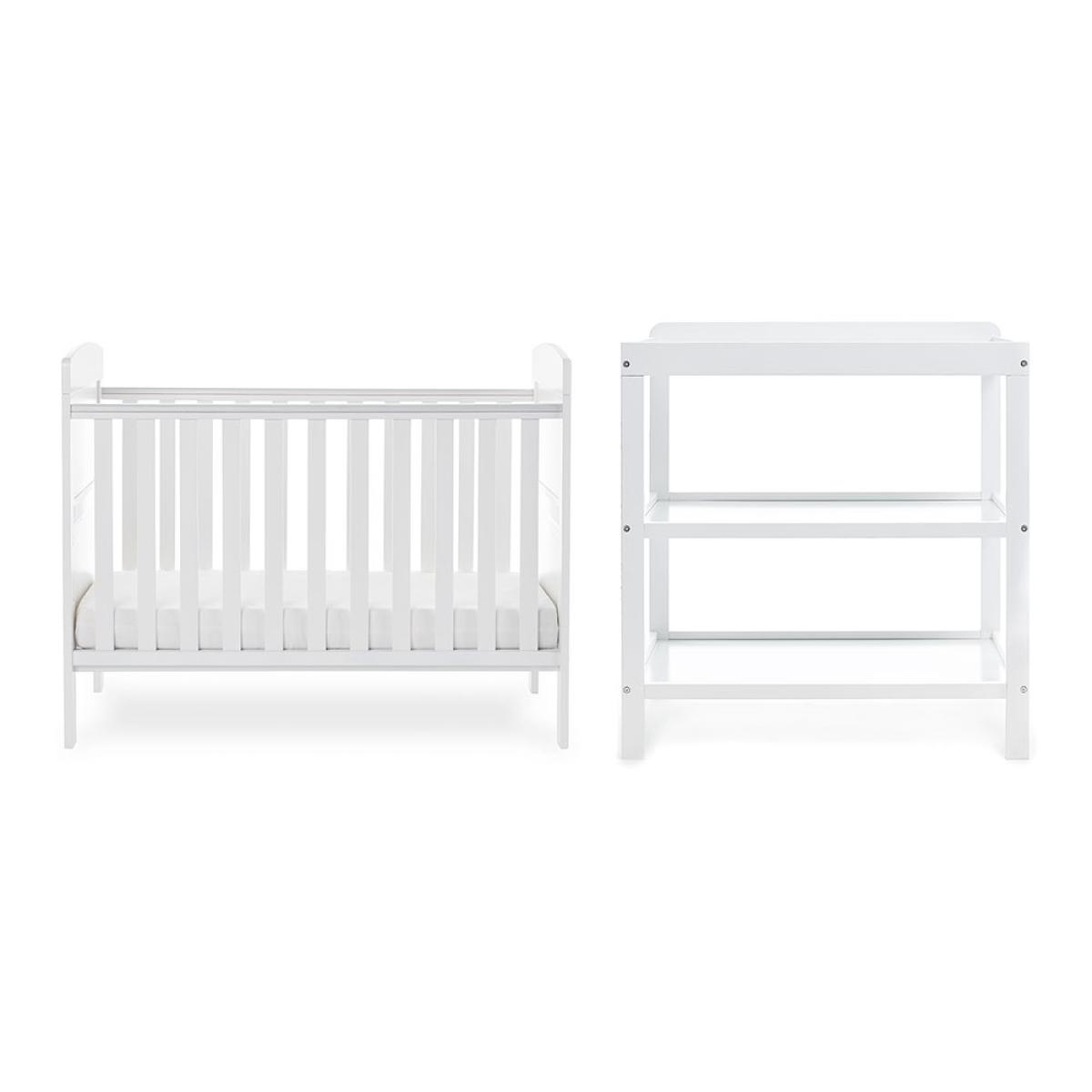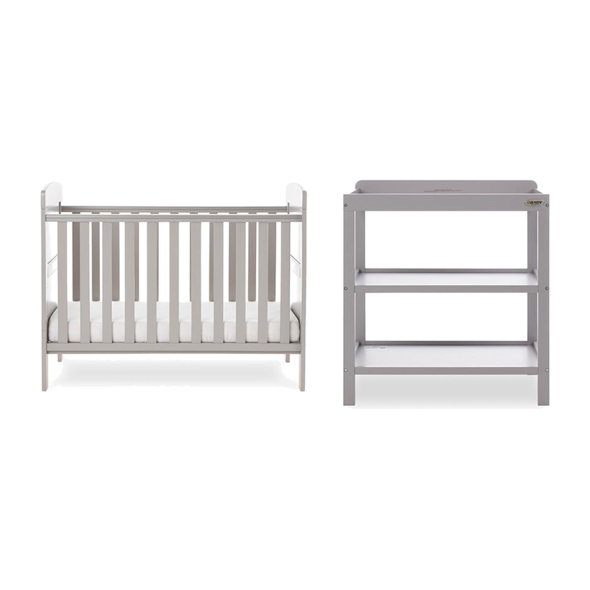 They say great things come in small packages and with the Obaby Grace Mini Cot Bed 2 Piece Nursery Furniture Set that's certainly true! The mini cot bed has 3 varying base heights; ensuring that as your baby continues to grow they're kept safe and sound as they start to gain confidence with sitting and standing independently. And with the addition of teething rails, their tiny little teeth are protected too! Designed to be convertible, simply transform the cot to a toddler bed. Including an open changing table, the spacious top has been designed to fit a changing mat and set at a height for added convenience. Featuring open storage shelves; nursery essentials can be kept close-by, making night time changes that bit easier. Available in a choice of colours, select the set to suit your mini man or miss!.
