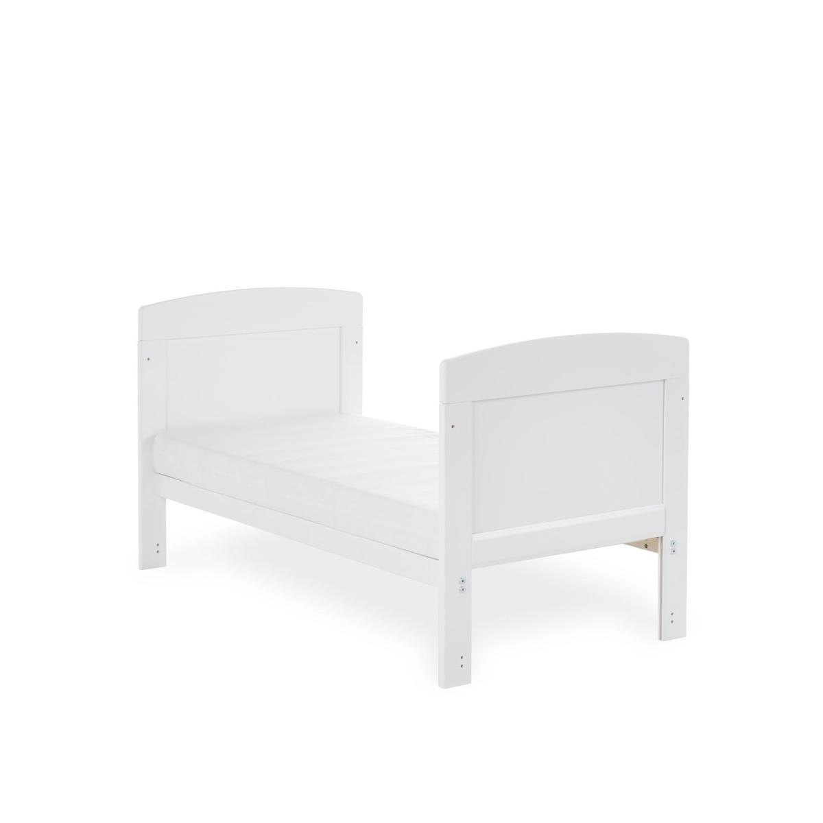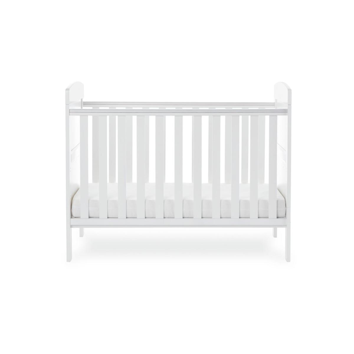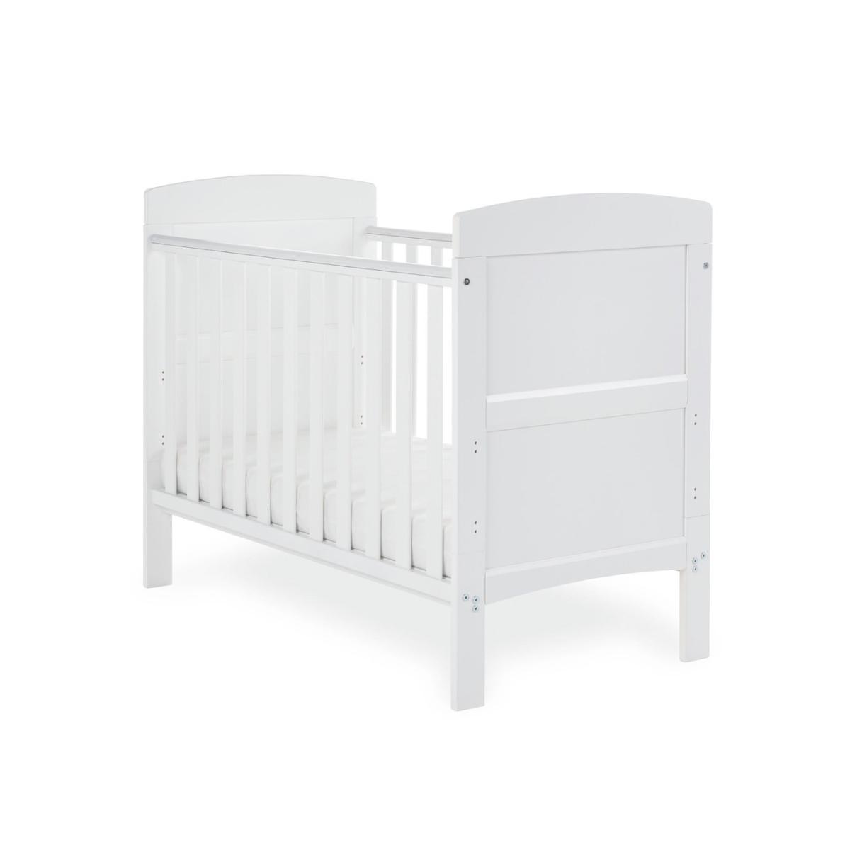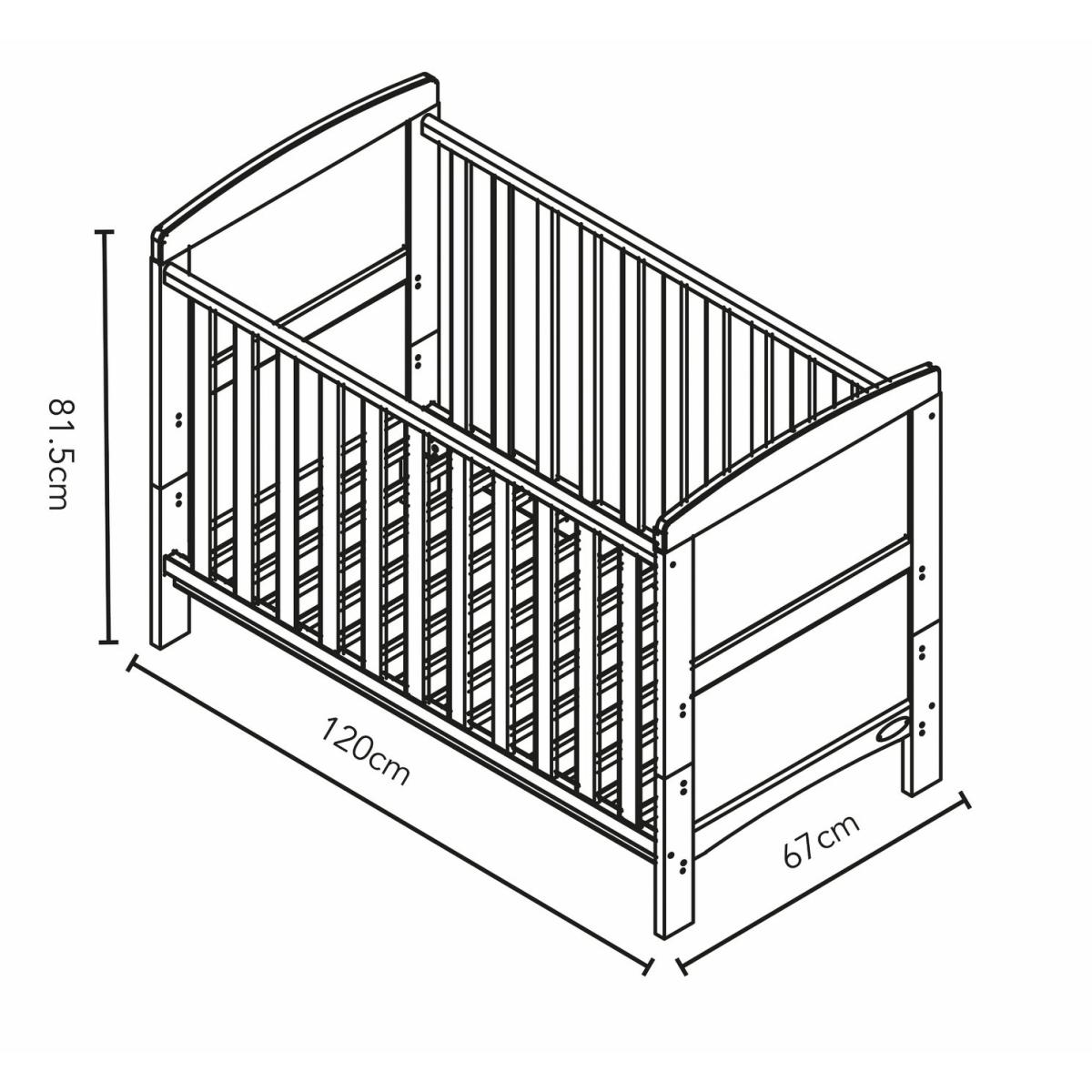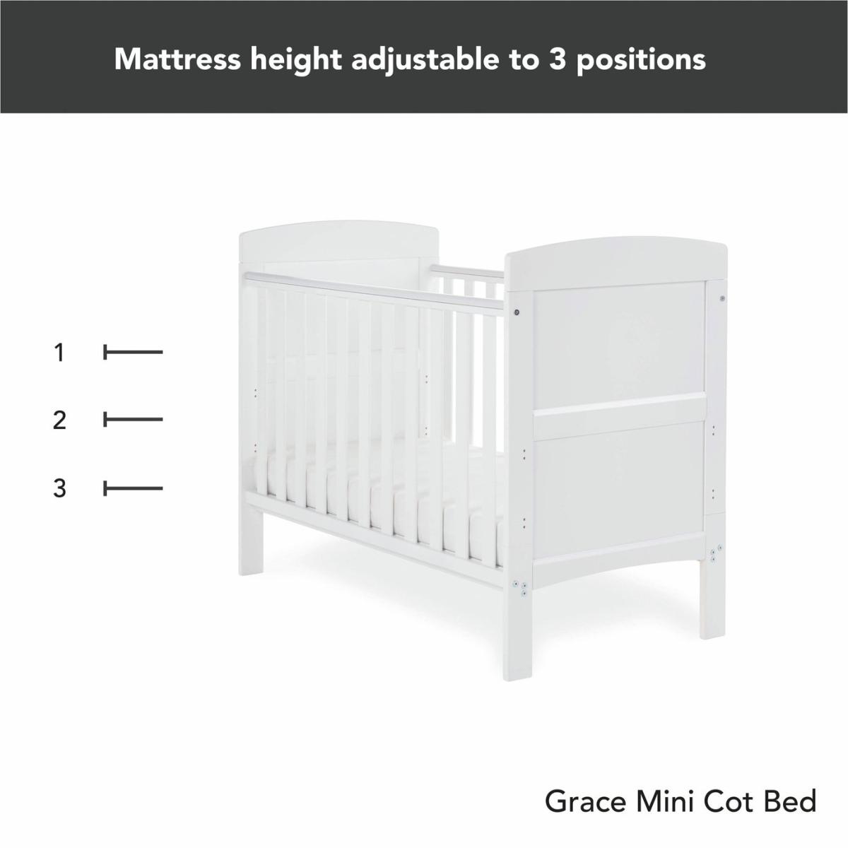 The Obaby Grace Mini cot bed features a compact design yet maintains the same valuable features of the full-sized version. The open slatted sides and teething rails add peace of mind and as your child grows, learning to sit and stand, the mattress base can be lowered, with three base heights available in total, providing extra security and reassurance. Once your little one is ready to progress, the cot bed can convert into a cosy and stylish junior bed suitable for a child up to approximately three years old. Part of the Obaby collection. Suitable from birth to 3 years. Suitable for babies up to 20kg. Made from wood. Self-assembly. Cot Features Size L124, W66.5, H92cm. Weight 16kg. Teething rails - protects your baby's gums once they are teething and have started to chew. 3 position adjustable mattress base - allows you to lower the height of the mattress as your baby learns to sit and stand. Mattress base adjustable height 49.5cm, 33cm, 21cm. Height under cot 18.5cm. Converts to toddler bed. to 3 years. Mattress Features Mattress size L120, W60, D10cm. Mattress not included.
