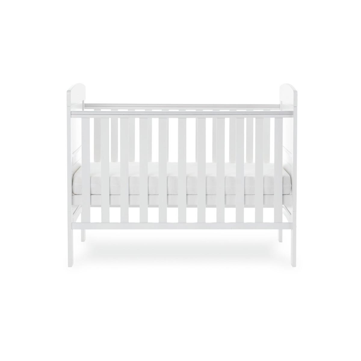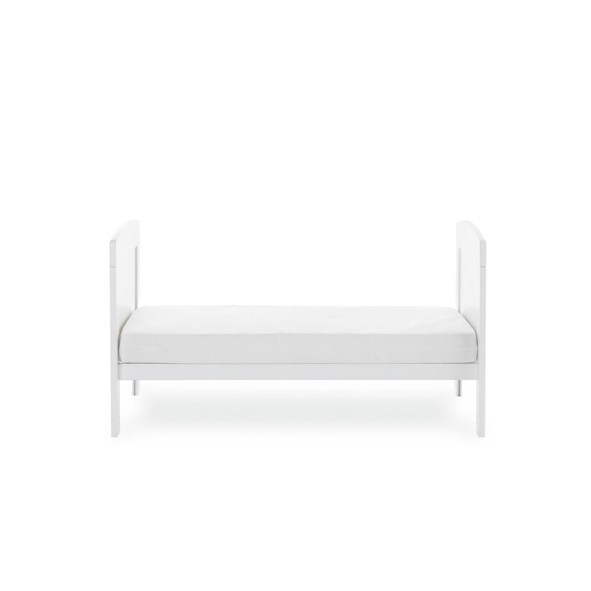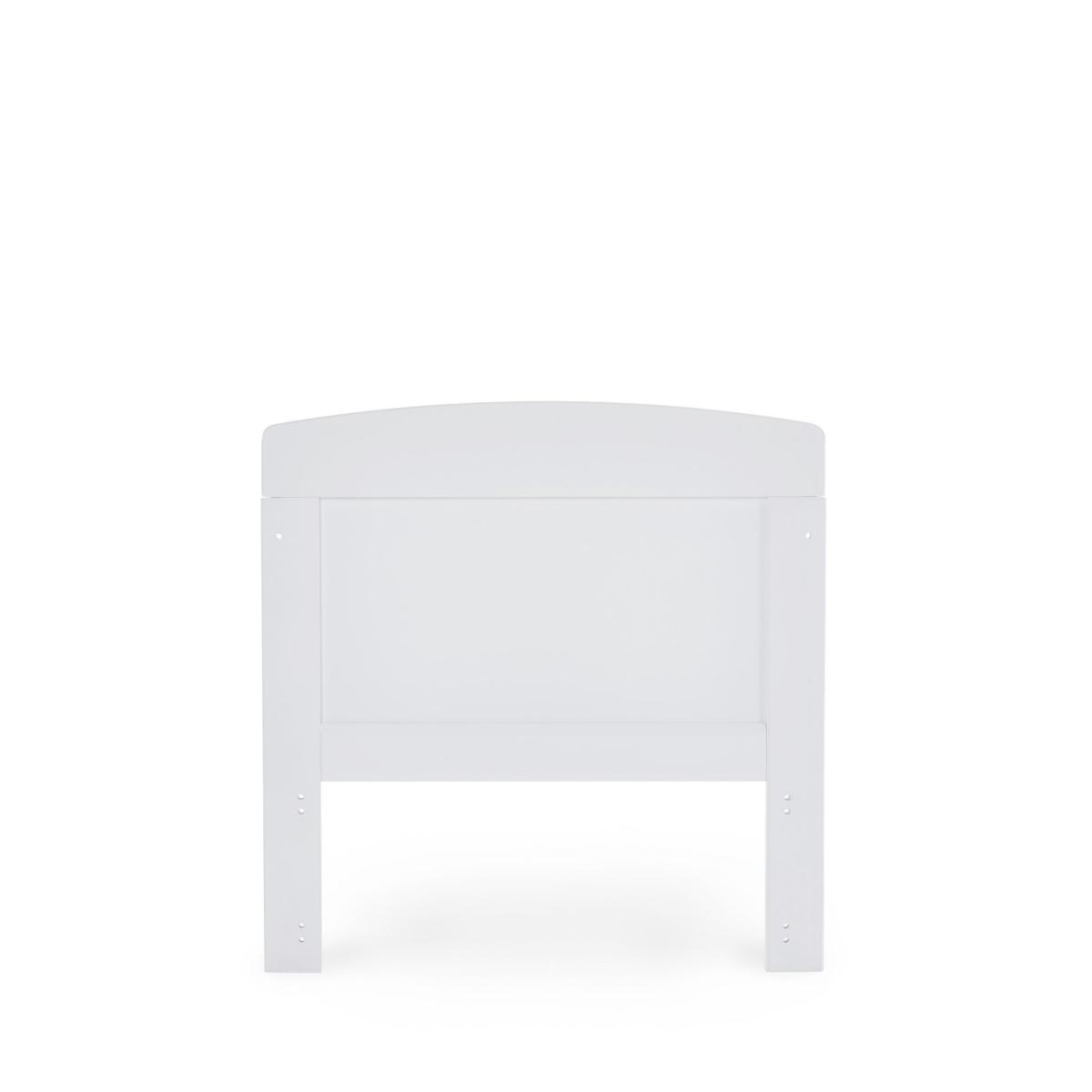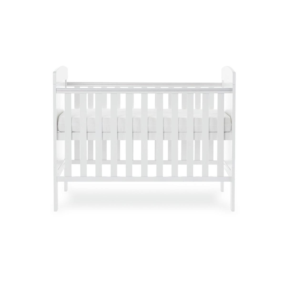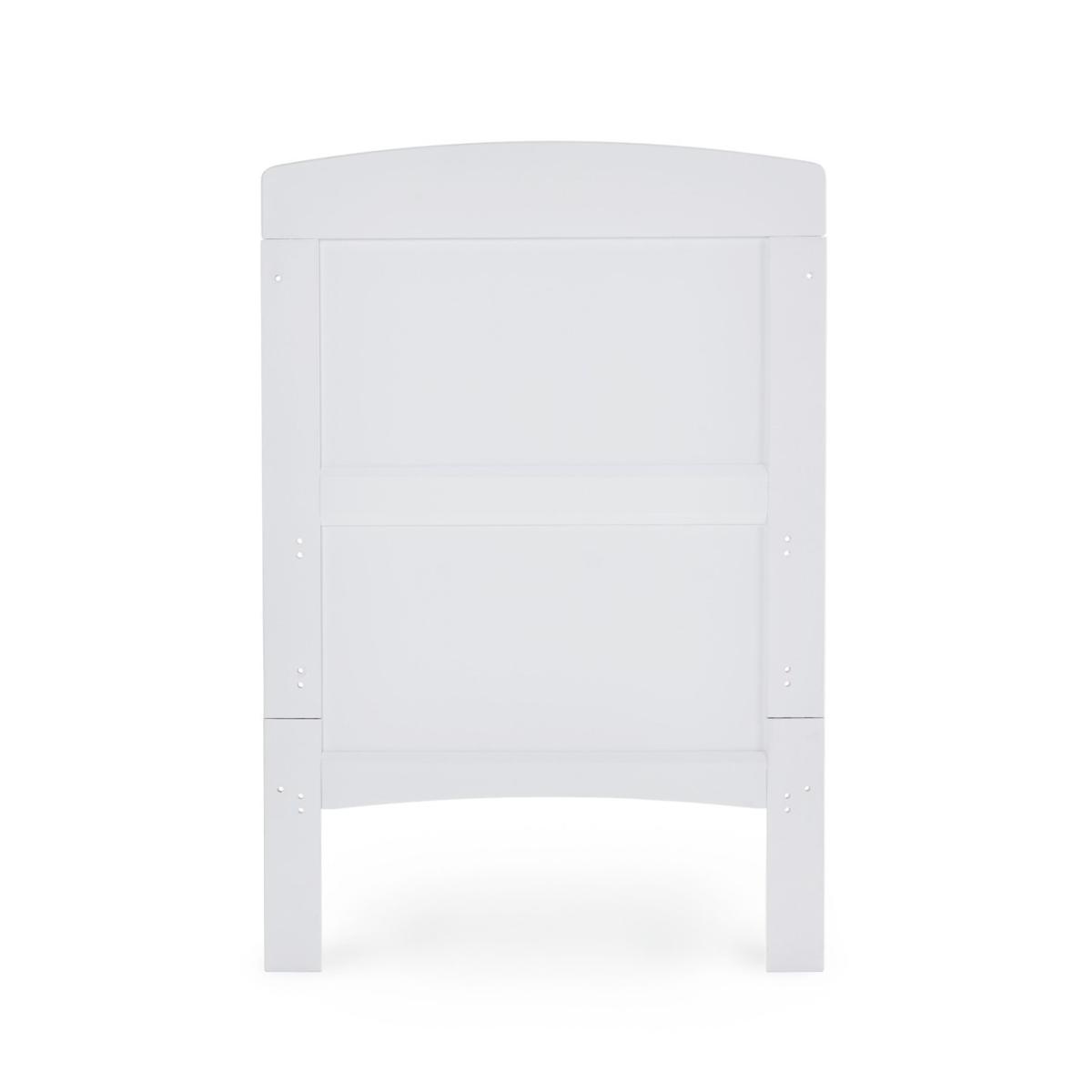 The Obaby Grace Mini cot bed features a compact design yet maintains the same valuable features of the full-sized version. The open slatted sides and teething rails add peace of mind and as your child grows, learning to sit and stand, the mattress base can be lowered, with three base heights available in total, providing extra security and reassurance. Once your little one is ready to progress, the cot bed can convert into a cosy and stylish junior bed suitable for a child up to approximately three years old. Part of the Obaby collection. Suitable from birth to 3 years. Suitable for babies up to 20kg. Made from wood. Self-assembly. Cot Features Size L124, W66.5, H92cm. Weight 16kg. Teething rails - protects your baby's gums once they are teething and have started to chew. 3 position adjustable mattress base - allows you to lower the height of the mattress as your baby learns to sit and stand. Mattress base adjustable height 49.5cm, 33cm, 21cm. Height under cot 18.5cm. Converts to toddler bed. to 3 years. Mattress Features Mattress size L120, W60, D10cm. Mattress not included.
