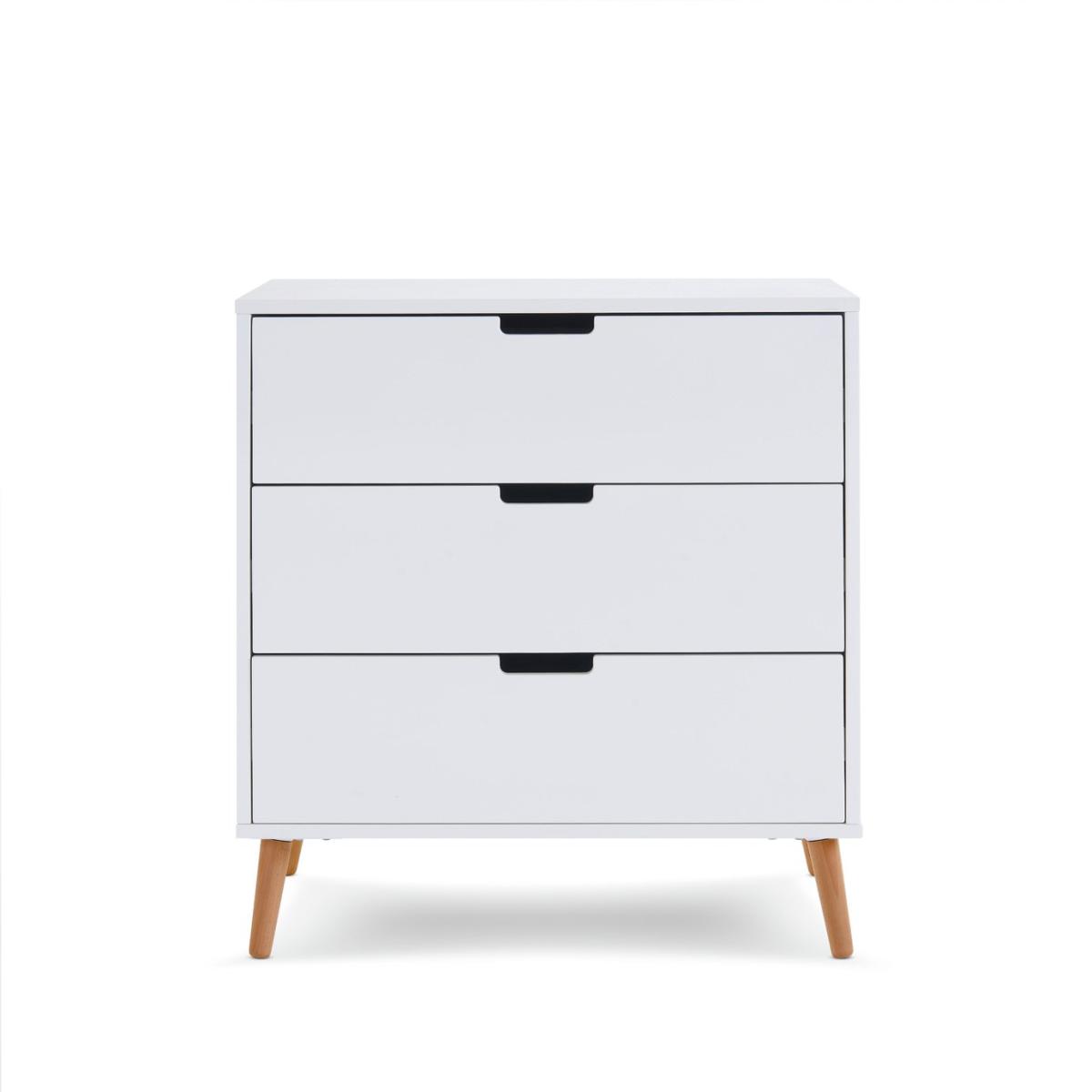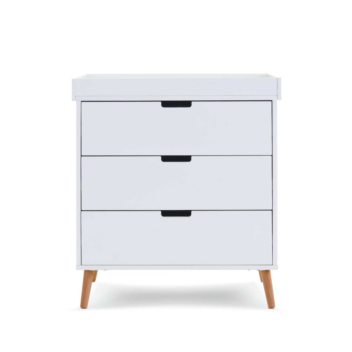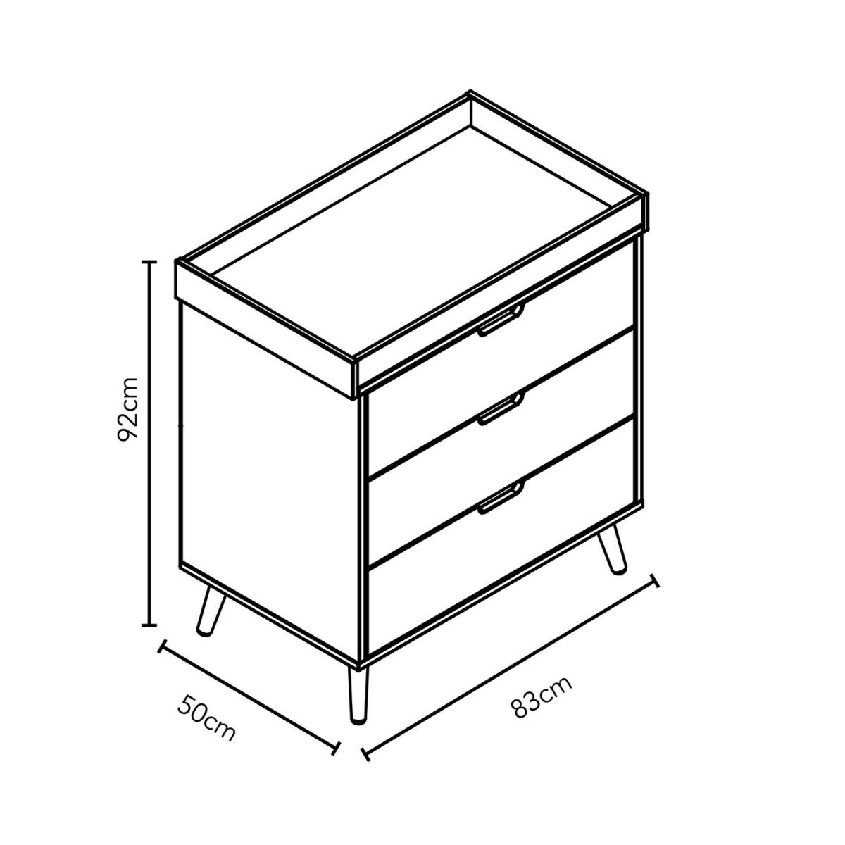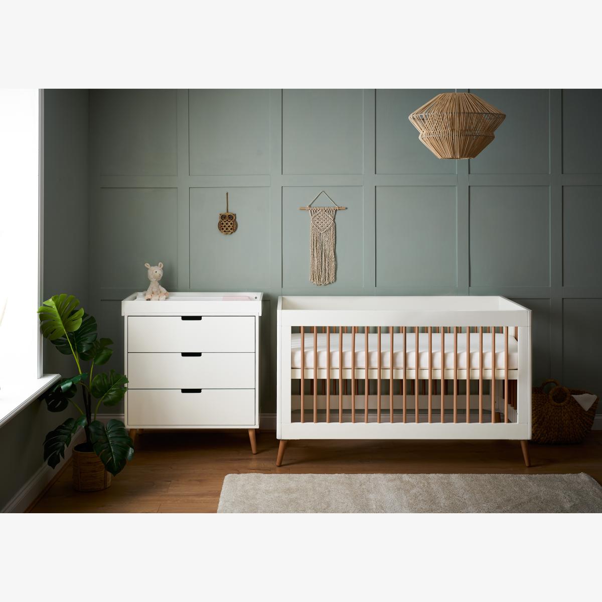 The Maya 2 piece room set includes a Maya cot bed and a changing unit. The range is heavily inspired by scandinavian design. Part of the Maya collection. 2 piece set, including: cot bed, chest of drawers, changing unit, changer top. Made of wood. Self-assembly. If the product is over 60cm high it must be securely attached to the wall to prevent overturning. - 2 people recommended. Suitable from birth to 4 years. Cot features Cot L145, W75, H89cm. Weight 31.6kg. 3 position adjustable mattress to lower the baby as they grow. Cot suitable from birth until baby is able to climb out. Converts to toddler bed. 4 years. Height under cot 15.8cm. Dresser features Dresser H91.5, W83, D49.5cm. Chest of drawers features Drawers H91.5, W83, D49.5cm. Weight 48.8kg. 3 drawers. Chest of drawers internal drawer H12, W70, D38cm. Integrated changer top. Changer features Changer top internal H7, W80, D46.5cm. Packaging Comes in 3 boxes. Largest box H158.5, W80, D15cm. Package Dimensions: Package 1 dimensions: H158.5, W80, D15cm. Package 1 weight: 33.6kg. Package 2 dimensions: H80, W60, D12cm. Package 2 weight: 26.7kg. Package 3 dimensions: H90, W60, D10.5cm. Package 3 weight: 24.7kg.