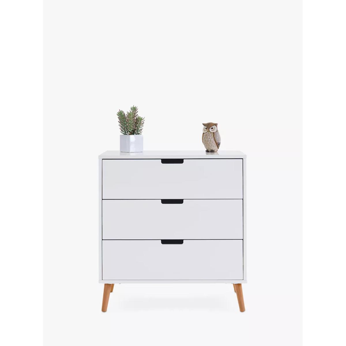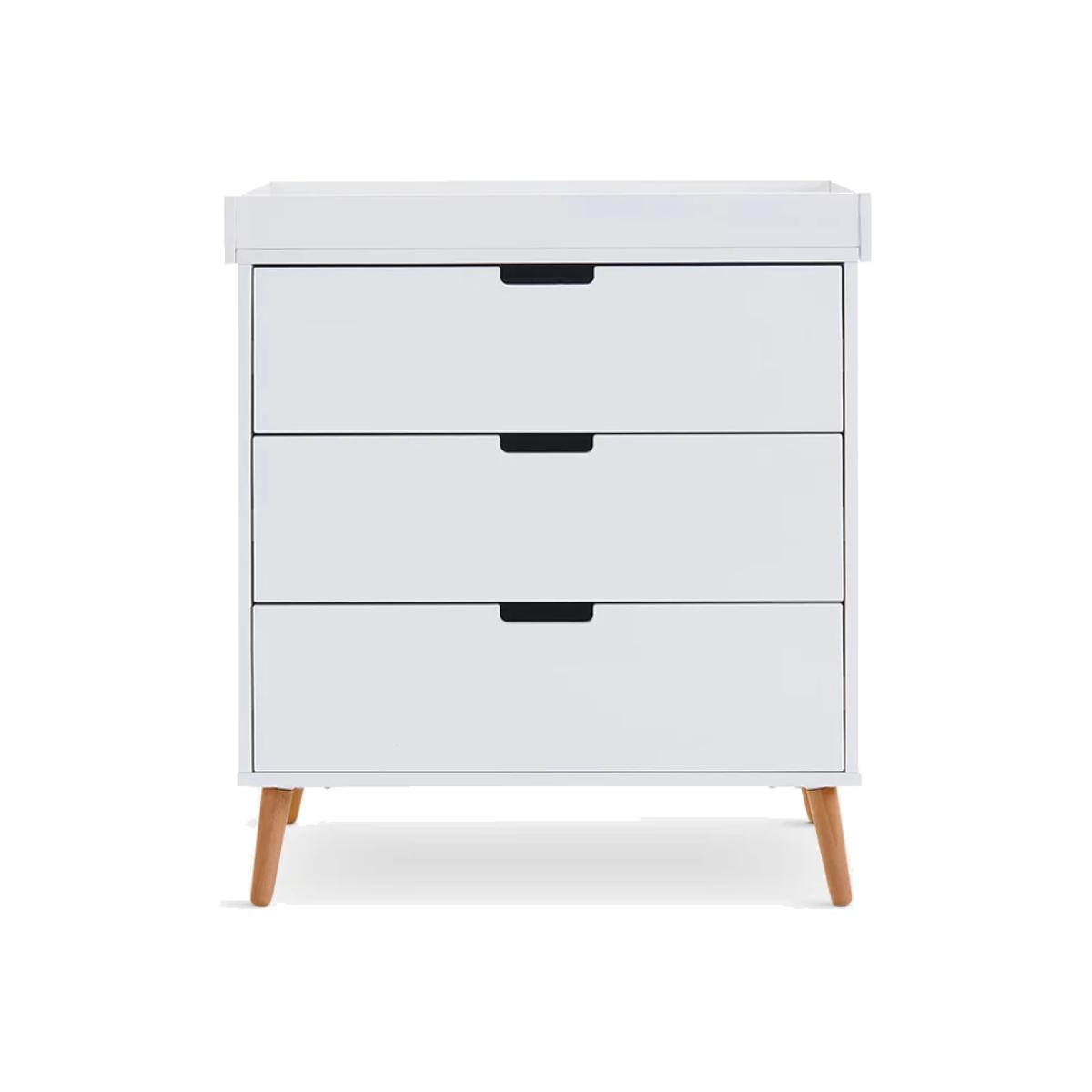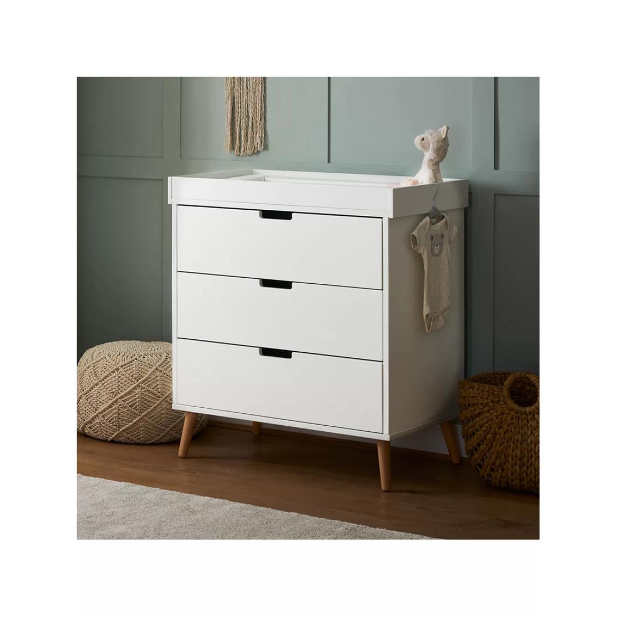 The Maya range, inspired by Scandinavian design, features a clean-cut finish and two-tone colourway, making it the perfect addition for families looking to create a modern and stylish nursery. The perfect storage companion, it features three 34. L capacity drawers with recessed handles that enable you to easily put away and quickly locate your little one's belongings. On top of the unit is a changing area capable of fitting a changing mat up to 80 x 46.5cm. Once the changing area is no longer required it can be removed to create a stylish, flat-top chest of drawers that can be used for years to come. For this item, our supplier can deliver to your doorstep, but the drivers cannot enter your property. If you live in a flat, the delivery driver will be able to bring the boxes to the main entrance of the building, but they will not be able to take them up to the door of your flat. Therefore, we recommend having someone with you who can take in the boxes.