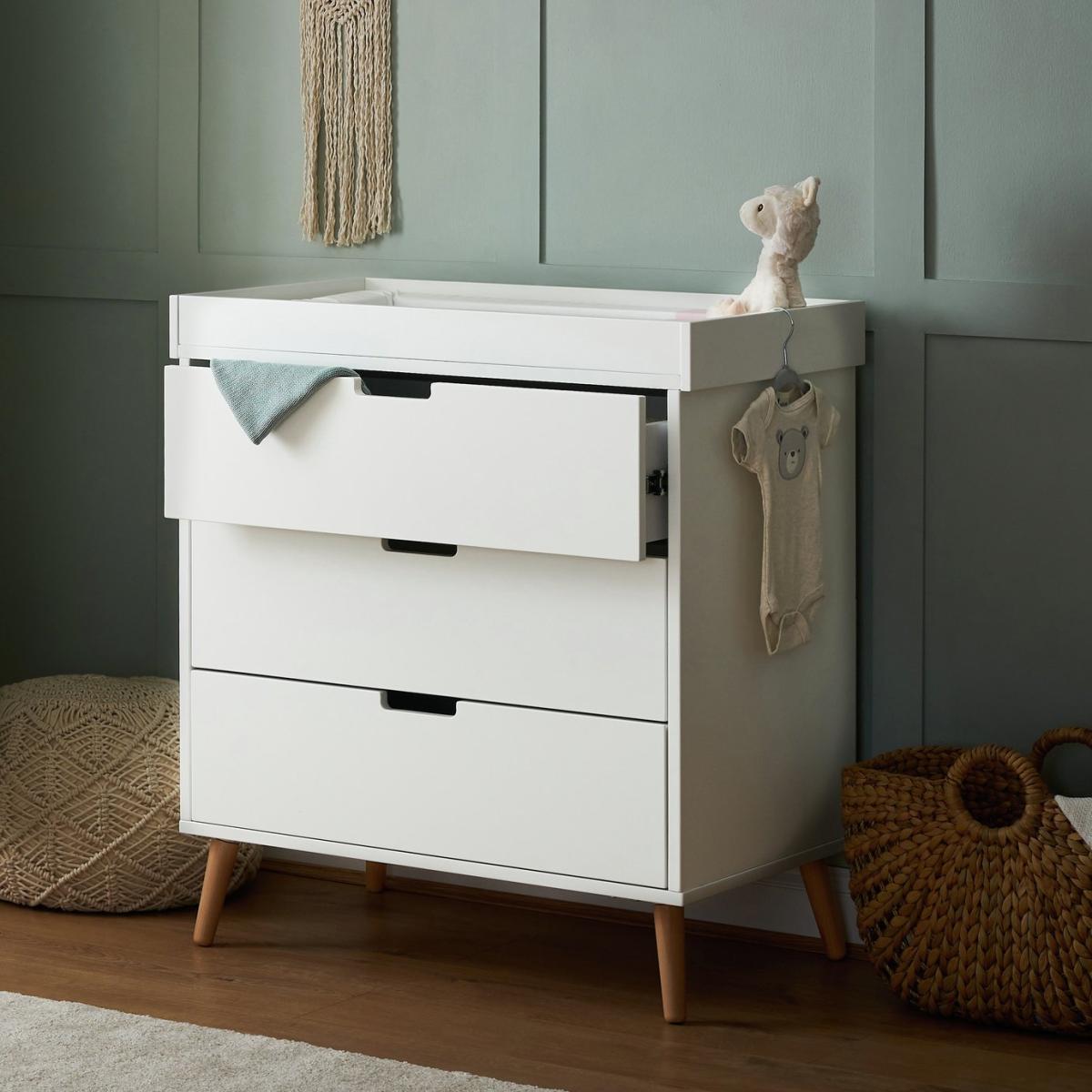 I love the Obaby Maya changing unit for its clean, contemporary look that blends effortlessly into both modern and Scandinavian-inspired nurseries. The combination of white and acacia wood details adds warmth and texture, making it versatile for various colour palettes. It's practical too, with spacious drawers for storage and a sturdy top suitable for changing mats. For styling tips, consider pairing it with soft pastel accessories or a textured rug to soften the overall look. Placing a few decorative storage baskets nearby can also help keep essentials organised, making this piece both functional and stylish in a nursery or kid’s room setting.