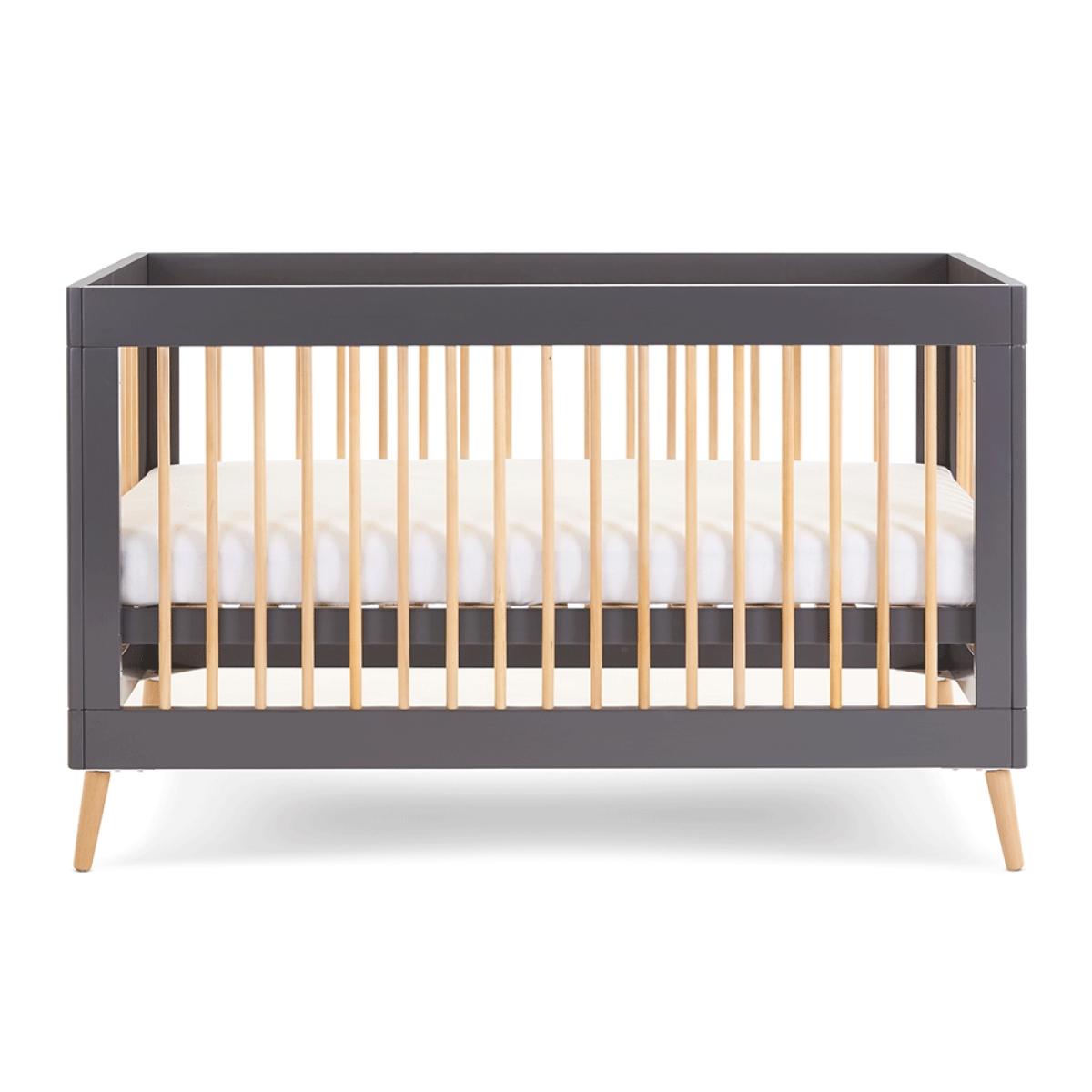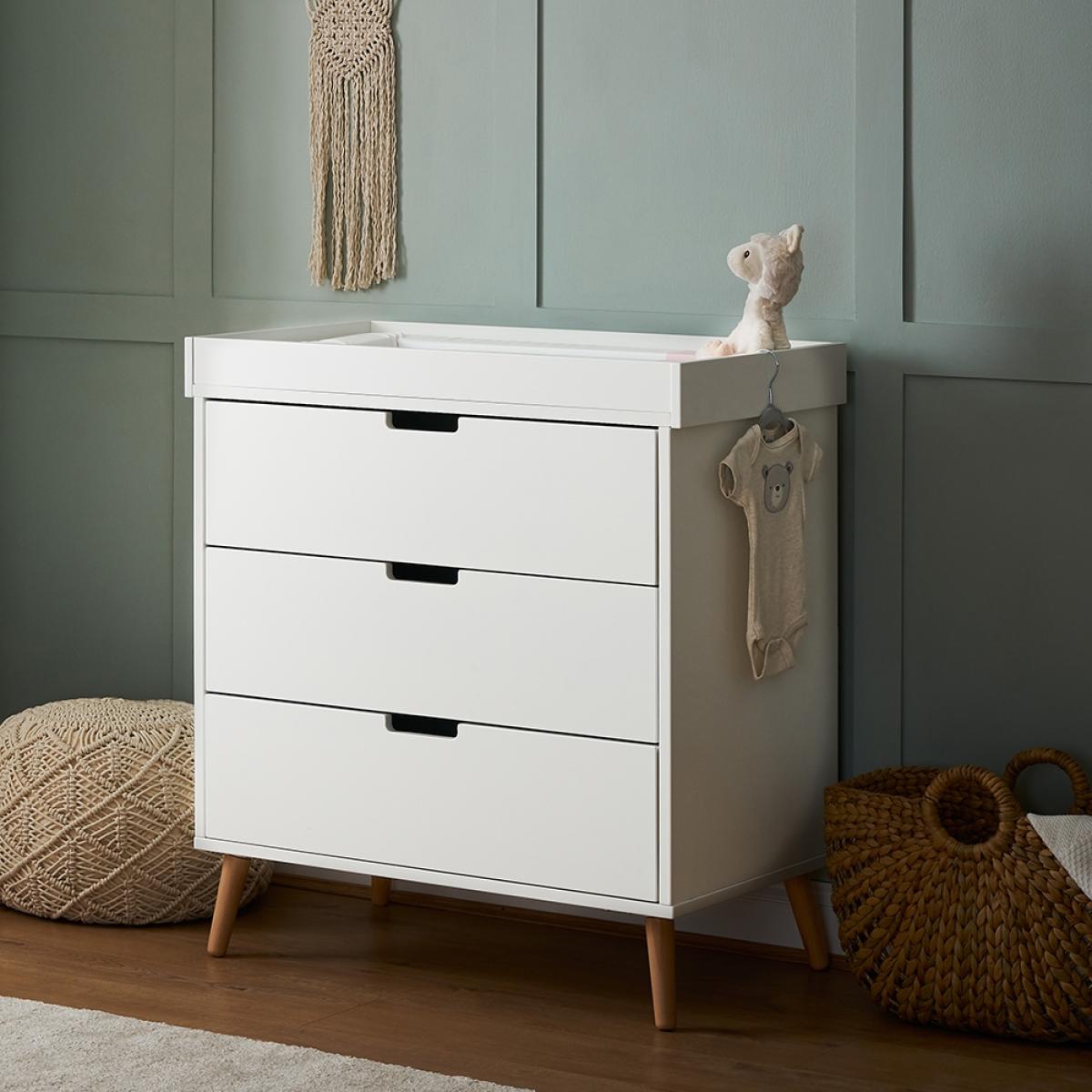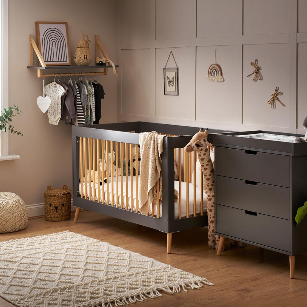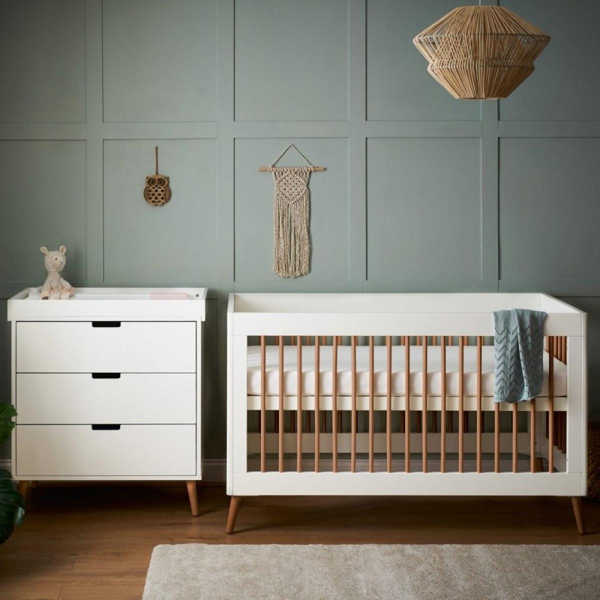 Looking for something a bit different for the nursery? Inspired by Scandi styles, the Obaby Maya Cot Bed 2 Piece Nursery Furniture Set would be the perfect choice! The full-size cot bed has lots of features, including a height adjustable base and a convertible frame. Save your back and start with the mattress in the top position and simply lower the height as your baby gains confidence. Designed to adapt to their needs, when your tot has outgrown their baby bed, easily remove the side and replace with the safety rails. It can even transform into a toddler bed and later to a day bed. Including a matching dresser; the removable changing top, recessed handles and 34. L drawers make it just as practical! Perfect for those night-time changes, have easy access to essentials and when they've outgrown the changing table, the chest of drawers can still be used for years to come! Why not add the matching shelf with clothes rail and utilise your wall space!.