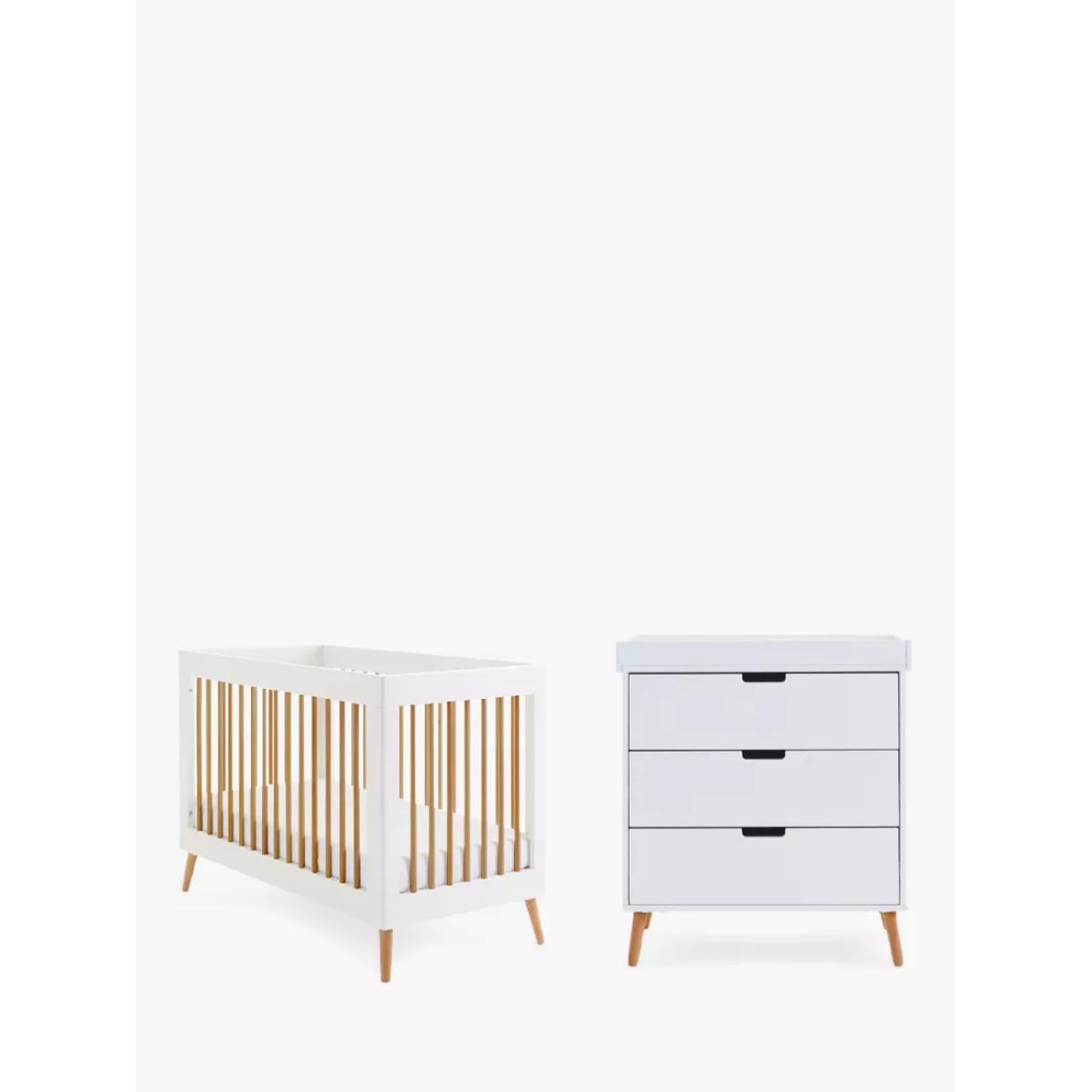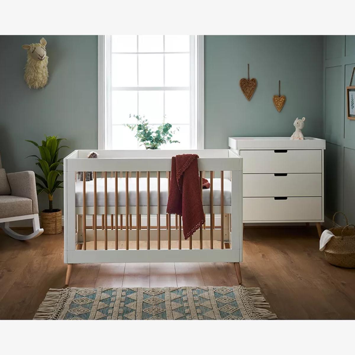The Maya range from Obaby is inspired by Scandinavian design, featuring a clean-cut finish and two-tone colourway, making it the perfect addition for families looking to create a modern and stylish nursery. The Maya Mini 2 piece room set consists of the Maya Mini cot bed and changing unit. Featuring the same aesthetic and high-quality finish as the regular-sized cot bed, the Maya Mini cot bed means families with a more compact nursery do not have to compromise when looking for a space-saving alternative. The top position of the three height-adjustable mattress base allows you to put down your baby with less pressure and strain applied to your back and as they develop and find their feet, you can maintain their safety by lowering the base. When your little one is ready to begin their transition, the included safety rail will provide reassurance and familiarity during an often daunting time and once they are used to their “big bed” this can be simply removed to create a stylish toddler bed. The Maya Mini cot bed requires an Obaby 120 x 60cm mattress, available separately. For this item, our supplier will provide delivery to a room of your choice.