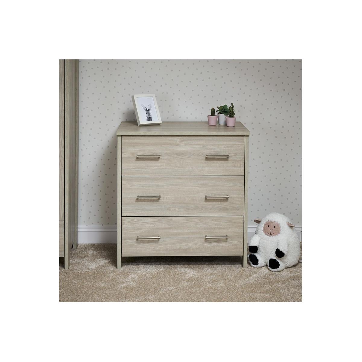 Dimensions H92 x W83 x D50cm Features. OBABY Nika Changing Unit Three full width drawers on gliding metal runners. Accommodates a changing mat up to 76 x 46cm. Coordinates with the Obaby Nika furniture range. Textured oak wood effect finish. Discreet spring pins allow the changing area to be removed when no longer required The Obaby Nika range offers a contemporary design due to its clean lines and textured oak effect finish that will fit perfectly in today’s modern nursery. The Nika changing unit is a piece of furniture that can be used for years to come. Three large full depth drawers offer plenty of space for changing essentials toys and your little one’s precious possessions. All three drawers feature two brushed metal handles and glide on smooth runners allowing you to easily open them with either hand. Discreet spring pins allow the changing area to be attached to the top of the unit without any unsightly screws showing it perfectly accommodates a changing mat up to 76 x 46cm and is set at a comfortable height for parents. When the changing area is no longer needed the frame can be easily removed to create a solid top chest of drawers. .