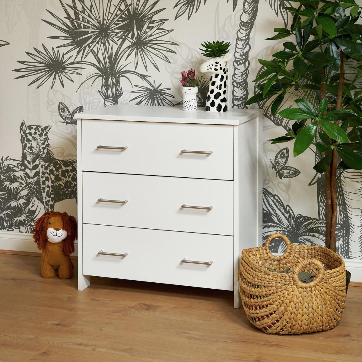 The Nika changing unit is a piece of furniture that can be used for years to come. Three large full depth 33. L capacity drawers offer plenty of space for changing essentials, toys and your little one's precious possessions. All three drawers feature two brushed metal handles and glide on smooth runners allowing you to easily open them with either hand. Part of the Nika collection. Size H92, W83, D50cm. Weight 48.15kg. Self-assembly. If this product is over 60cm high it must be securely attached to wall to prevent overturning. Package Dimensions: Package 1 dimensions: H93.5, W59, D14cm. Package 1 weight: 25.7kg. Package 2 dimensions: H90.5, W60.5, D13.5,. Package 2 weight: 27.85kg. General information: Manufacturer's 2 year guarantee.