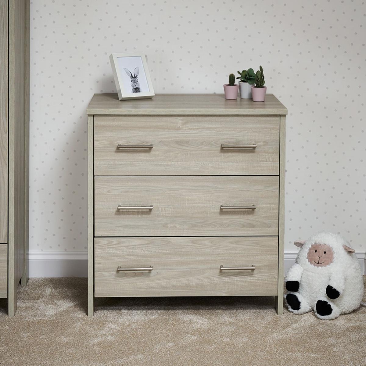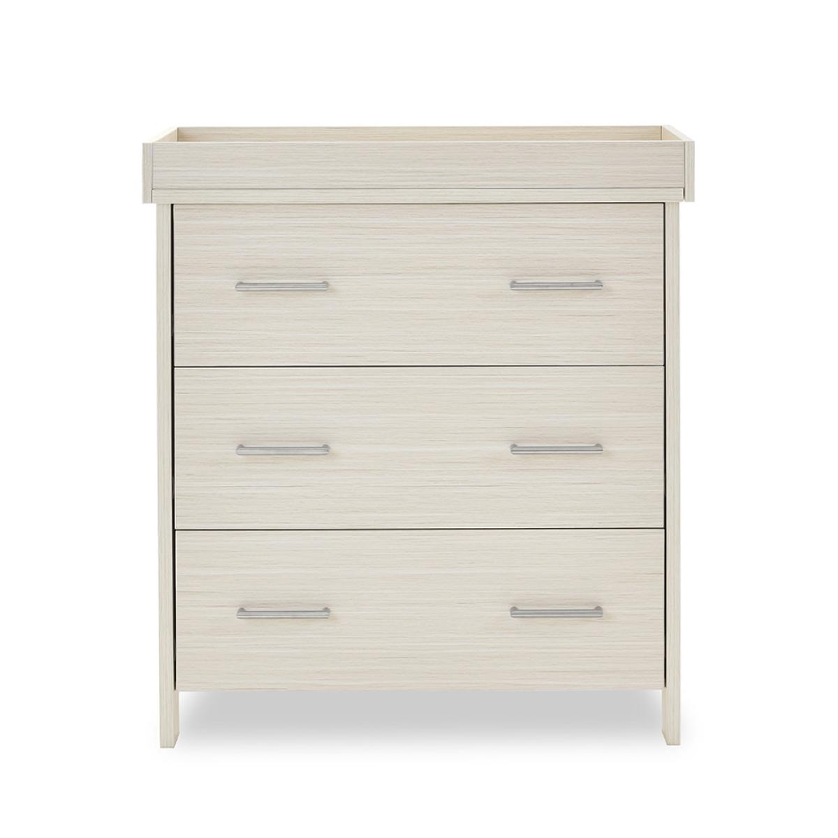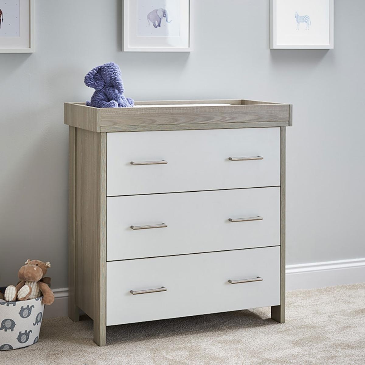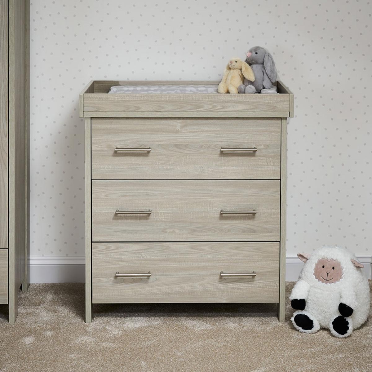 Designed to be paired with the matching cot bed and double wardrobe, the Obaby Nika Closed Changing Unit is just as gorgeous and practical!The main feature has got to be the removable changing table! There's plenty of space for a full sized changing mat and when your tot has outgrown it, simply remove and continue using this piece as a chest of drawers. Featuring 3 full length drawers with smooth gliding runners, store essentials and outfits away inside. Available in a choice of colours, each with stylish brushed metal handles and a textured oak wood effect finish, this changing unit will be perfect in their nursery and bedroom!.