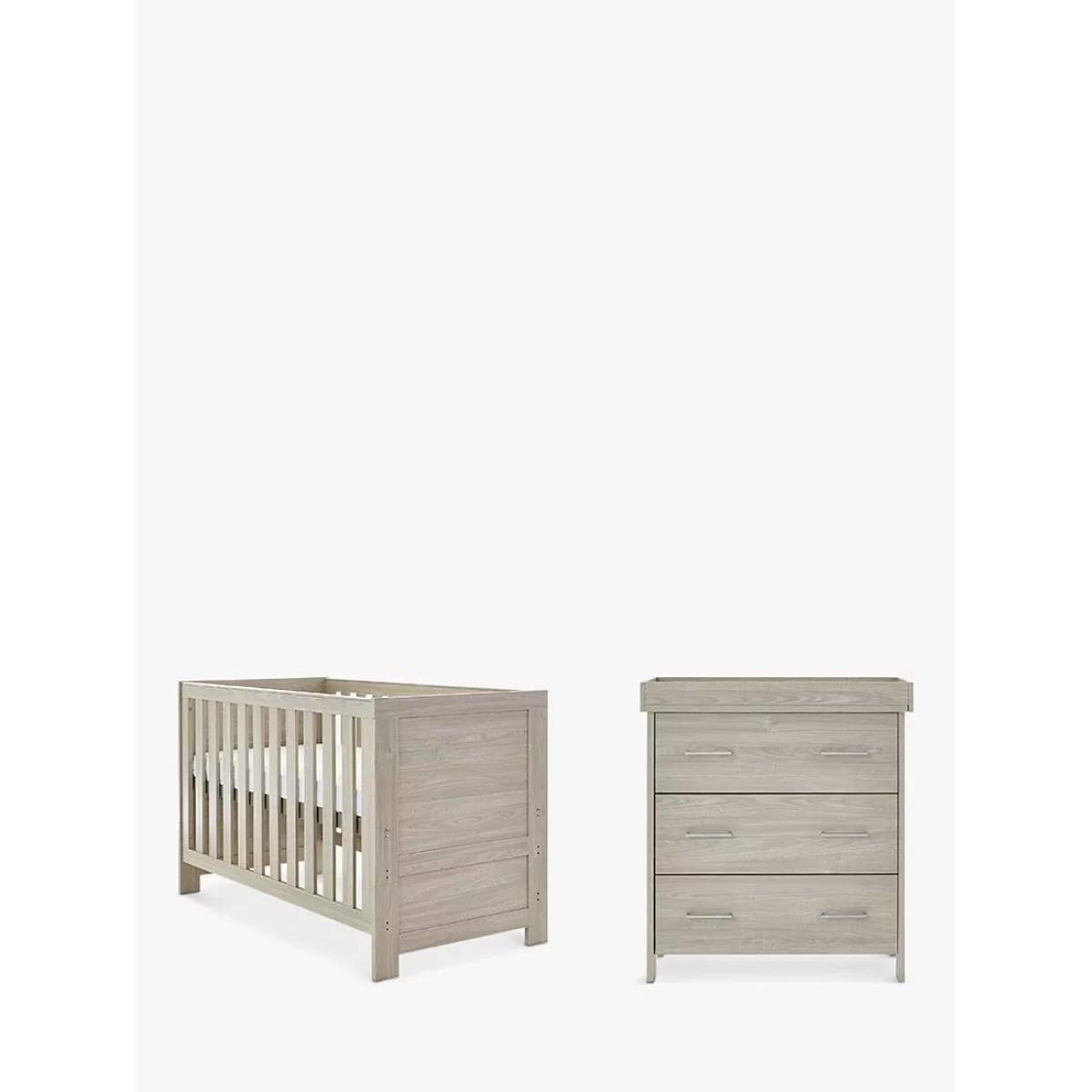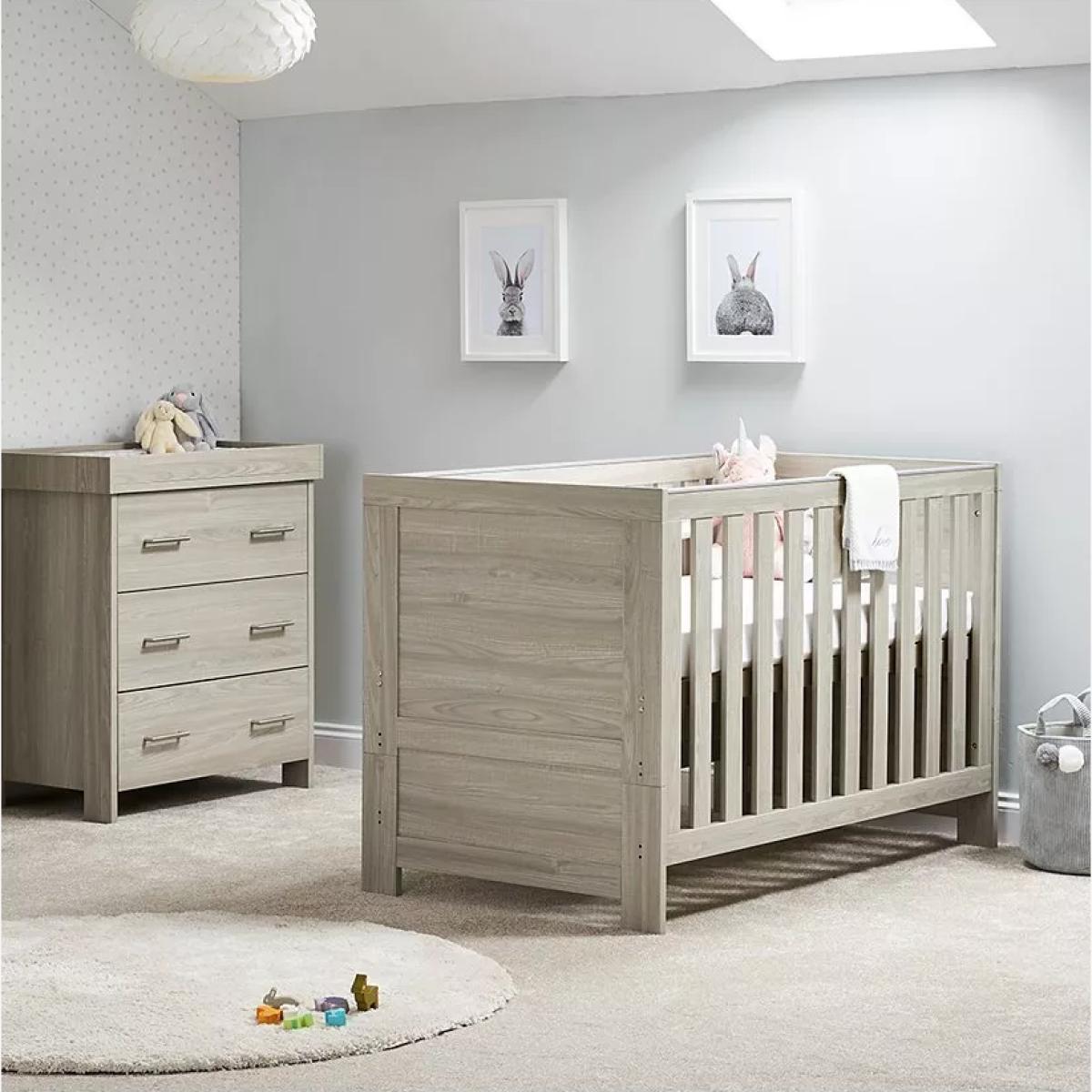 The Obaby Nika range offers a contemporary design, due to its clean lines and textured oak effect finish, that will fit perfectly in today’s modern nursery. This 2 piece room set consists of Nika cot bed and changing unit. The Nika cot bed has three mattress base positions, the highest allowing you to put down and pick up your newborn without straining your back through unnecessary bending. As your little one starts to develop and become more active, the mattress base can then be lowered by a further two positions keeping them safe and secure at all times while the teething rails protect their delicate first teeth. When your little one is standing confidently, the Nika can be easily transformed into a stylish toddler bed that still offers the familiarity they are used to and helps them to transition in an often-daunting time. Once transformed the toddler bed can be used until they are approximately four years old. This cot bed requires an Obaby 140 x 70cm mattress, sold separately. The Nika changing unit is a piece of furniture that can be used for years to come. Three large 32. L capacity, full-depth drawers offer plenty of space for changing essentials, toys and your little one’s precious possessions. All three drawers feature two brushed metal handles and glide on smooth runners allowing you to easily open them with either hand. Discreet spring pins allow the changing area to be attached to the top of the unit without any unsightly screws showing, it perfectly accommodates a changing mat up to 76 x 46cm and is set at a comfortable height for parents. When the changing area is no longer needed the frame can be easily removed to create a solid top chest of drawers. For this item, our supplier will provide delivery to a room of your choice.