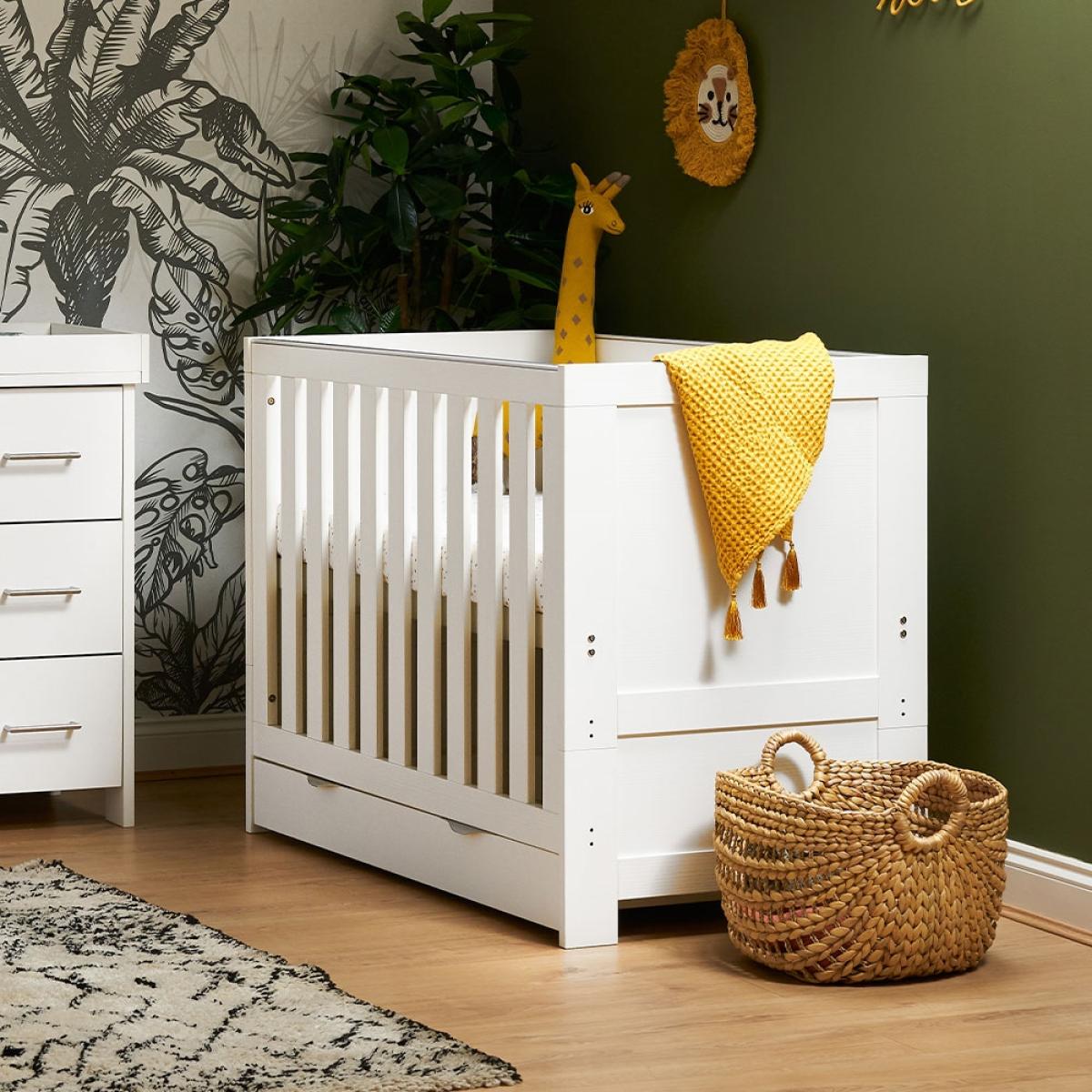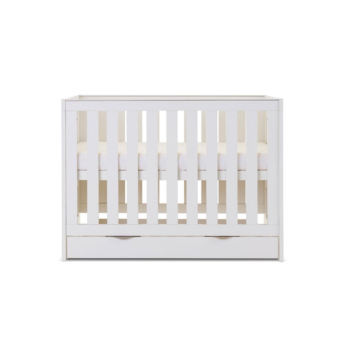 The compact Obaby Nika Mini Cot Bed & Underdrawer has everything you and your baby will need in a first bed! Designed to be used from birth up to 4 years of age, the adjustable frame adapts to suit every stage as they grow. Raise or lower the base height to suit their development. We'd recommending starting out with the mattress at the highest level and lowering once they've started supporting themselves. Protecting precious baby teeth - the teething rails ensure tots and the cot bed are kept safe whenever they feel the urge to chew! When the cot has been outgrown, transform into a toddler bed and continue using the gorgeous wooden frame for longer. The under bed storage drawer can be used with the cot and junior bed - that extra bit of storage will be a life-saver! Practical, stylish and safe, it's a great choice for your new arrival.