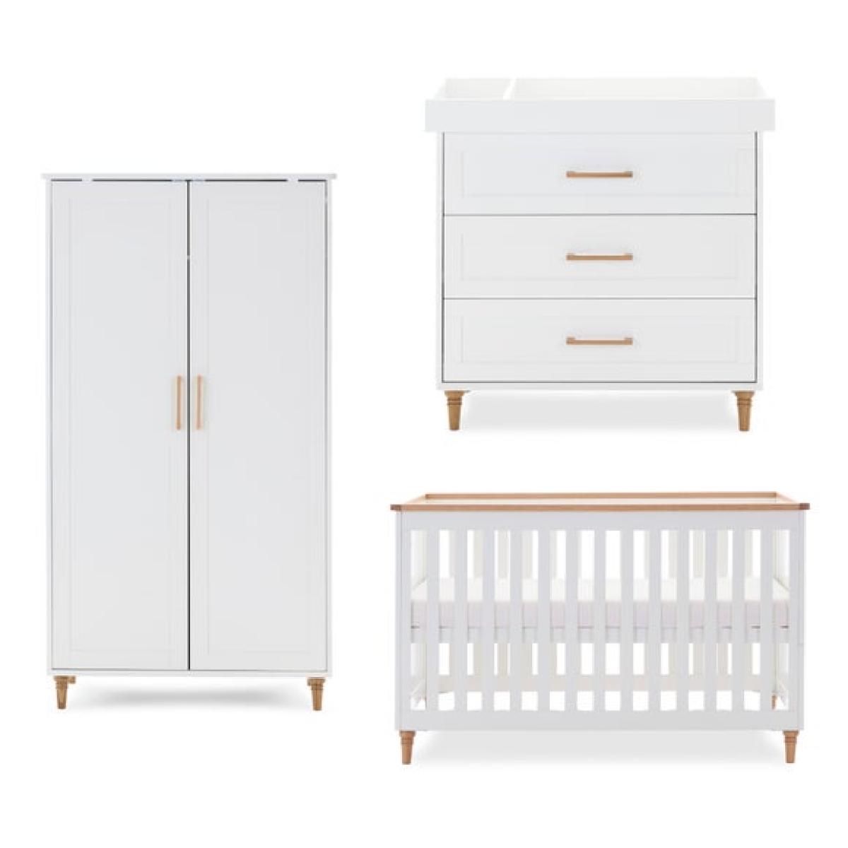 * Sleek nursery furniture set * Two-tone design * 1 x Double Wardrobe, 1 x Changing Unit and 1 x Cot Bed * Adjustable cot The Orla 3 piece nursery furniture set delivers a complete nursery solution with the Cot Bed, Changing Unit, and Double Wardrobe. Designed for longevity, the cot bed converts into a toddler bed, while the changing unit and wardrobe provide generous storage.
