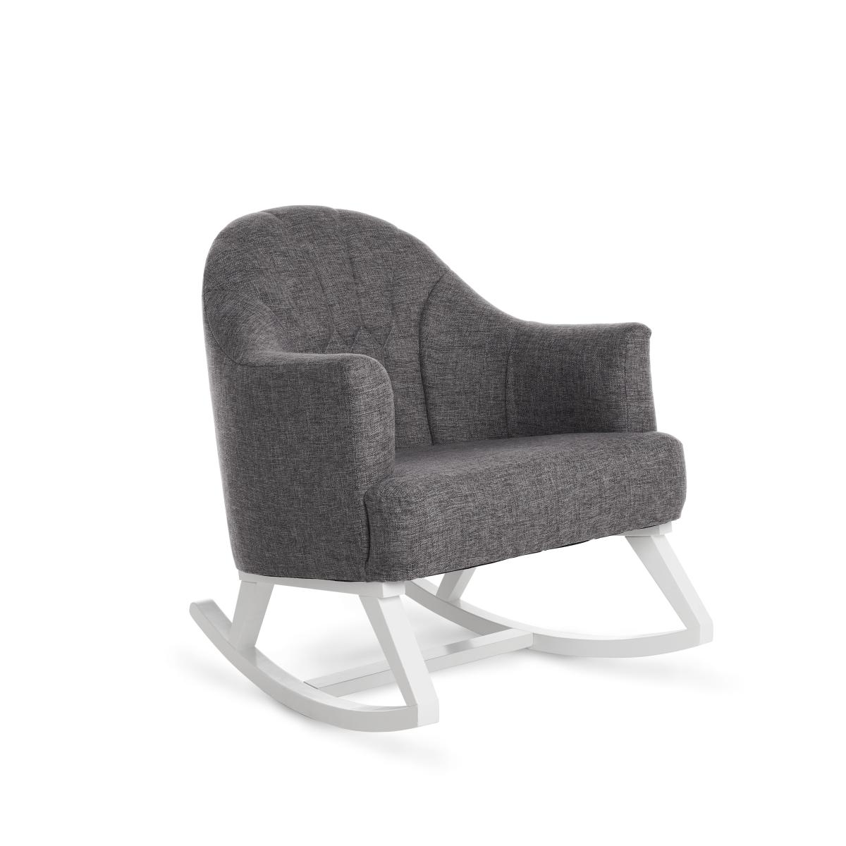 I’m a fan of this dark-grey rocker for its softly curved silhouette and solid white base - it feels both contemporary and inviting, especially in a nursery or snug reading corner. The neutral fabric adds texture without overwhelming a scheme, and the gentle glide makes it a practical choice for settling little ones or enjoying a quiet moment. For styling, drape a natural-tone sheepskin or slim cotton throw over the back and add a geometric monochrome cushion to introduce subtle contrast. Position it on a low-pile rug to define the spot, then flank with a petite side table or plant stand for essentials. It sits equally well against pastel, sage or off-white walls and pairs beautifully with pale woods and minimal accessories.