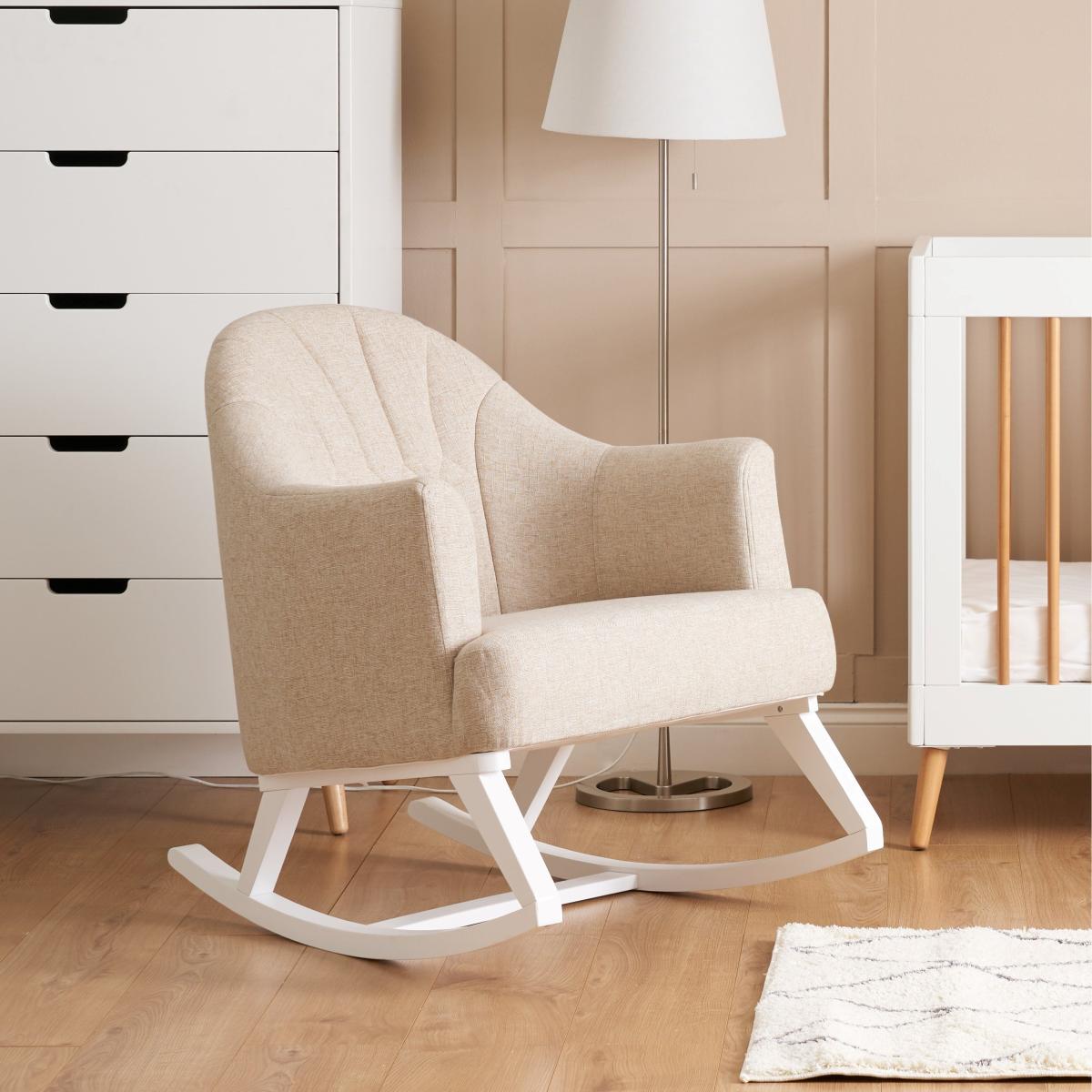 I’m a fan of this oat-coloured rocker for its streamlined silhouette and softly contoured back - it’s comfortable enough for long reads or bedtime routines and the neutral boucle-style fabric feels both tactile and hard-wearing. The white wooden runners lift it visually, so it never feels too bulky in a smaller room. It works well in Scandi-inspired nurseries or calm, contemporary living spaces. To style it, add a simple knitted throw draped casually over the arm and tuck a small bolster cushion into the back for extra support. Position it next to a slimline floor lamp or floating shelf to create a cosy corner without overcrowding the floor.