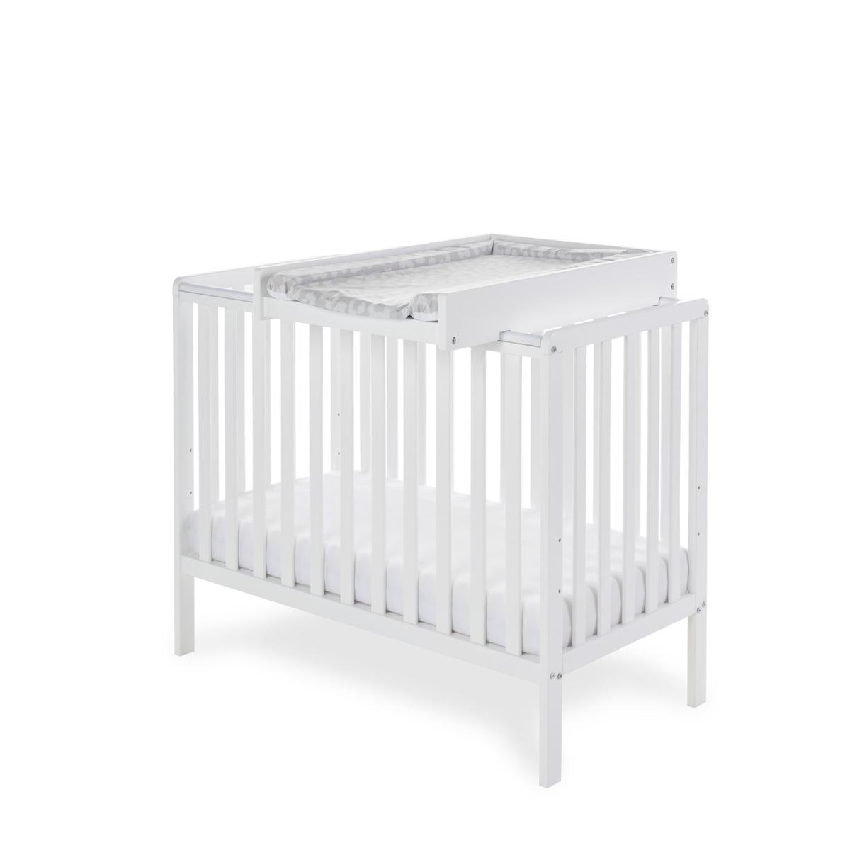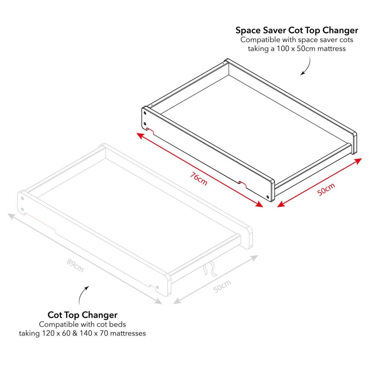 Dimensions H10.5 x W50 x D76cm Features. OBABY Space Saver Cot Top Changer. Suitable from birth up to 12 months. Simple Velcro securing straps attach the unit. Easy to clean surfaces. Facilitate a baby changing mat up to 76 x 46cm. Designed specifically for space saver cots with an external top width of 55.5 - 57.5cm The Obaby cot top changer carefully considers space and design to be the perfect addition to a nursery that needs an alternative changing solution. Thoughtfully set at a comfortable height for parents the cot top changer can fit on most cots and cot beds between 62cm to 76cm wide so will be compatible with most standard 120 x 60cm and 140 x 70cm variations. The cot top changer suitable from birth up to approximately 12 months and is fitted by using a simple and secure Velcro strap. The space used is cleverly modelled to facilitate the use of a baby changing mat up to 76 x 46cm while smooth surfaces have been utilised throughout to ensure the unit is a breeze to wipe clean. Alternatively the Obaby space saver cot top changer carefully considers space and design to be the perfect addition to the smaller nursery requiring an alternative changing solution to a full-sized changing unit. This cot top changer is designed specifically to fit on Obaby’s range of space saver cots. .