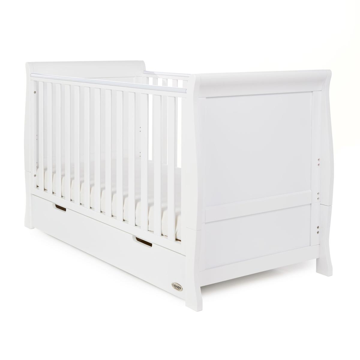 Dimensions Cot Bed H91 x W76 x D154cm Changing Unit H91 x W90 x D50 Features. OBABY Stamford Classic Sleigh 2 Piece Room Set. Includes Stamford Classic cot bed with under drawer and closed changing unit. Adjustable three-position mattress height Bed ends split to transform into toddler bed. Comes in a classic white colour. Changing unit has a combination of three full depth drawers and full height cupboard with shelf. Table top accommodates a changing mat up to 76 x 46cm. Suitable from birth to approximately four years old Under drawer included for extra storage The Obaby Stamford furniture range offers families the perfect combination of style quality and practicality. The Stamford Classic 2 piece room set consists of the beautiful Stamford Classic cot bed with under drawer and closed changing unit. Both pieces feature the same elegant sleigh design that flows throughout the Stamford range. At the heart of the range is the beautiful Stamford Classic sleigh cot bed with its elegant sleigh design offering traditional styling with a contemporary finish. Teething rails protect your child’s delicate teeth and the slatted sides ensure you can watch over your little one during their most peaceful times. The Stamford Classic offers an adjustable mattress base the top position allowing you to put down your newborn without unnecessary bending and as your child grows learning to sit and stand the base can be lowered by two further positions to ensure your little one is safe and secure at all times. Once your child is old enough the Stamford Classic can be transformed into a stylish toddler bed to provide the perfect night’s sleep up until they are approximately four years old. Requires a 140 x 70cm mattress. The included matching under drawer has a generous 70. L capacity offering parent’s that much needed extra storage space for their little one’s belongings without taking up valuable space elsewhere. Durable wheels ensure that the drawer opens and closes smoothly on any floor surface and recessed handles make sure that there are no protruding handles to catch. The second piece is the Stamford closed changing unit. The combination of three spacious 13. L capacity drawers and full height cupboard with adjustable shelf and soft close door provide plenty of storage options for little one’s precious belongings whilst the cleverly recessed section on the top of the changing unit perfectly accommodates a changing mat up to 76 x 46cm. .