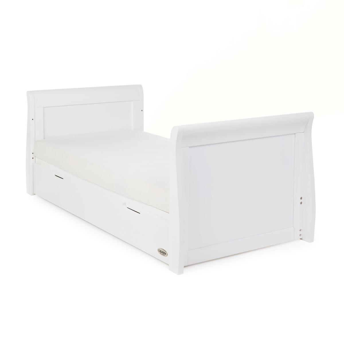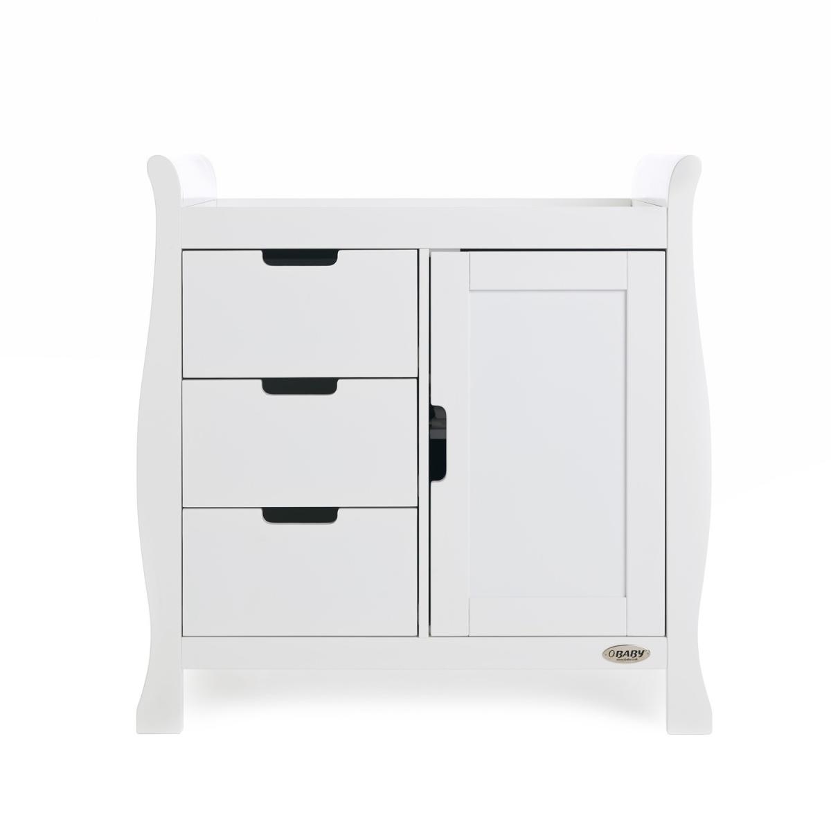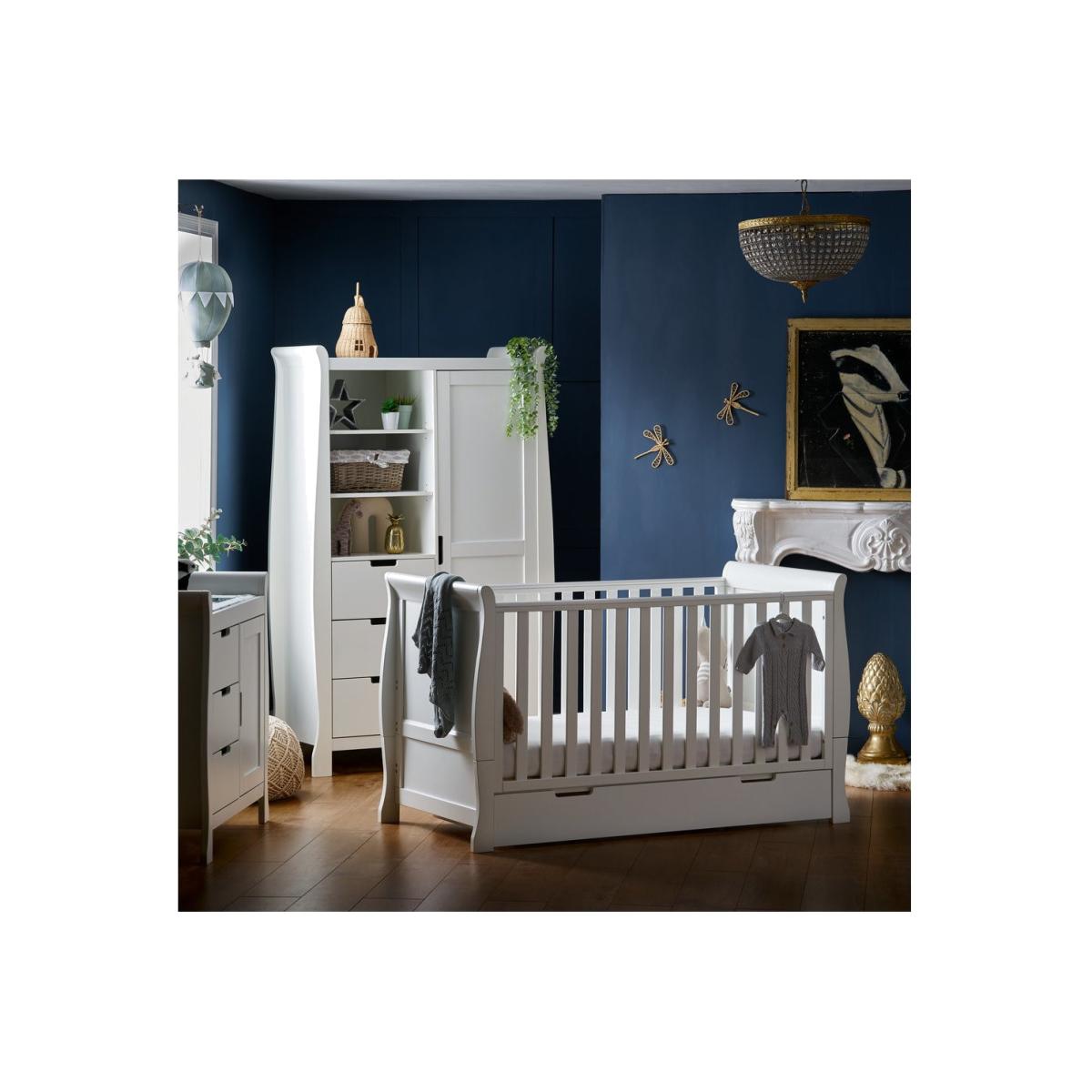 Dimensions Cot Bed H91 x W76 x D154cm Changing Unit H91 x W90 x D50cm Wardrobe H175 x W111 x D50cm Features. OBABY Stamford Classic Sleigh 3 Piece Room Set. Adjustable three-position mattress height Bed ends split to transform into toddler bed. Comes in a classic white colour Table top accommodates a changing mat up to 76 x 46cm. Suitable from birth to approximately four years old Under drawer included for extra storage. Includes cot bed with under drawer closed changing unit and double wardrobe The Obaby Stamford furniture range offers families the perfect combination of style quality and practicality. The Stamford Classic 3 piece room set consists of the beautiful Stamford Classic cot bed with under drawer closed changing unit and double wardrobe. All pieces feature the same elegant sleigh design that flows throughout the Stamford range. At the heart of the range is the beautiful Stamford Classic sleigh cot bed with its elegant sleigh design offering traditional styling with a contemporary finish. Teething rails protect your child’s delicate teeth and the slatted sides ensure you can watch over your little one during their most peaceful times. The Stamford Classic offers an adjustable mattress base the top position allowing you to put down your newborn without unnecessary bending and as your child grows learning to sit and stand the base can be lowered by two further positions to ensure your little one is safe and secure at all times. Once your child is old enough the Stamford Classic can be transformed into a stylish toddler bed to provide the perfect night’s sleep up until they are approximately four years old. Requires a 140 x 70cm mattress. The included matching under drawer has a generous 70. L capacity offering parent’s that much needed extra storage space for their little one’s belongings without taking up valuable space elsewhere. Durable wheels ensure that the drawer opens and closes smoothly on any floor surface and recessed handles make sure that there are no protruding handles to catch. The second piece is the Stamford closed changing unit. The combination of three spacious 13. L capacity drawers and full height cupboard with adjustable shelf and soft close door provide plenty of storage options for little one’s precious belongings whilst the cleverly recessed section on the top of the changing unit perfectly accommodates a changing mat up to 76 x 46cm. Completing the set is the Stamford double wardrobe. The quality of the design is complimented perfectly by the generous storage options available. A full height soft close door encloses the main cupboard section with two hanging rails for storing little one’s beautiful clothing. For the smaller belongings the left-hand side of the wardrobe is divided between three height adjustable shelves and three spacious 21. L capacity drawers ensuring that there’s always a perfect place for storing or displaying any precious possessions. .