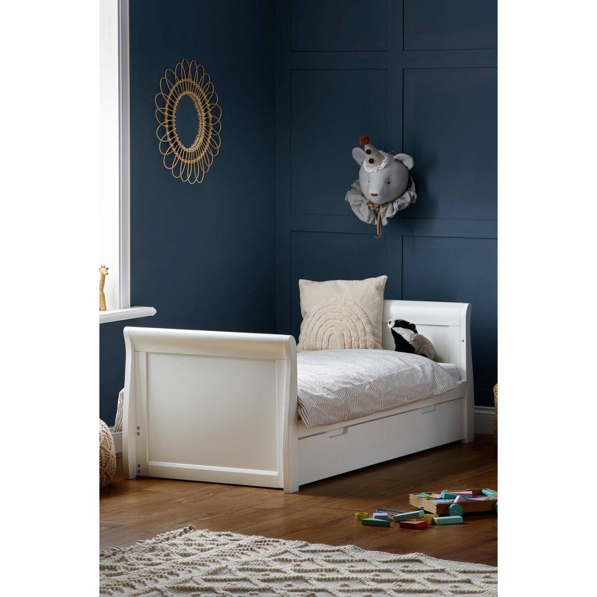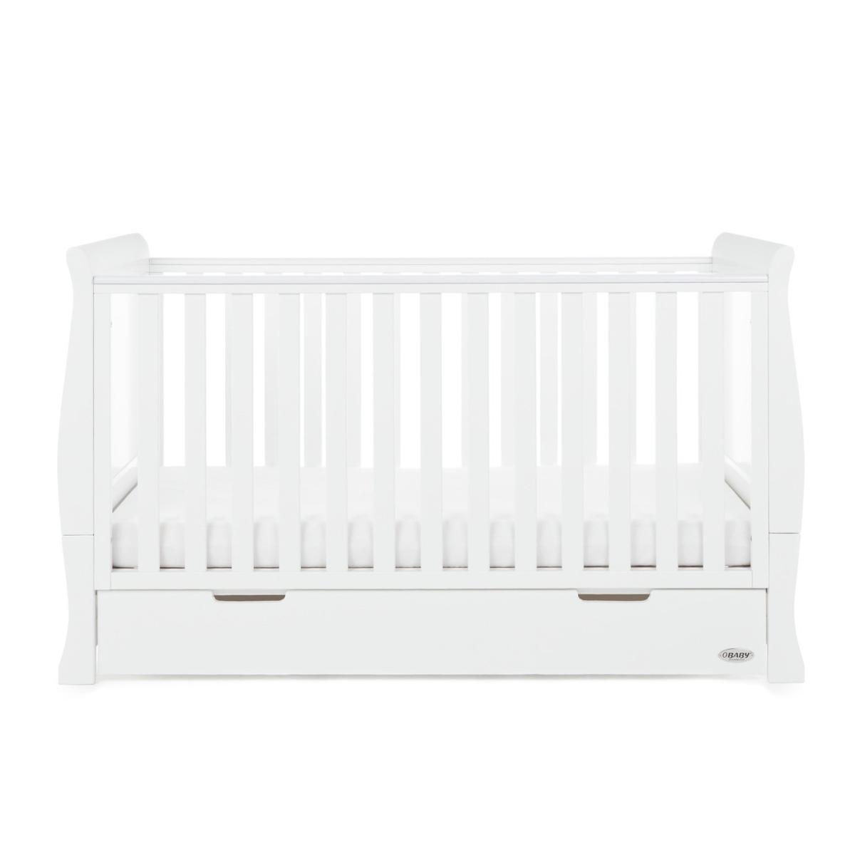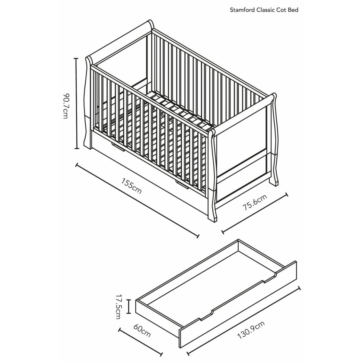 Part of the Obaby Stamford range, this beautifully crafted classic sleigh cot bed features an elegant scroll design. As your child grows, the mattress base can be lowered, with three base heights available in total, providing extra reassurance. Further to this the cot bed converts seamlessly from a cot bed of the highest quality into a cosy and stylish junior bed that is suitable for a child up to four years old. Includes a 70. L capacity under drawer for convenient storage. Part of the Stamford collection. Suitable from birth to 4 years. Suitable for babies up to 25kg. Made from wood. Self-assembly. Cot Features Size L154, W76, H91cm. Weight 37kg. Teething rails - protects your baby's gums once they are teething and have started to chew. 3 position adjustable mattress base - allows you to lower the height of the mattress as your baby learns to sit and stand. Mattress base adjustable height 52.5cm, 38cm, 23cm. Under cot drawer included. Under cot drawer internal H10, W119.5,D57.5cm. Converts to toddler bed. Mattress Features Mattress size L140, W70,. Mattress not included.