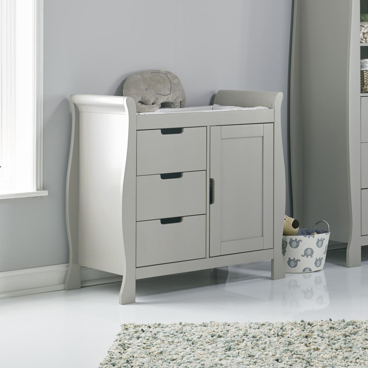 Prepare your nursery for those regular nappy changes with the stylish and functional Stamford Closed Changing Unit. Designed with a large cupboard section with a soft close door and adjustable shelf so you can stock your nappies, towels and other essentials, it also features three half width, full depth drawers each with an impressive 13 Litre capacity so you can organise creams and ointments, spare changes of clothes, toys and other essentials which are easy to locate and closed off from little wandering hands. The space on top allows a good level and easy positioning for you to complete your change and the area is designed to fit a changing mat up to a size of 76 x 45cm. Great for pairing with other products in the Obaby Stamford range, this changing unit has the iconic curvy sleigh design and is available in a white or warm grey colourway.