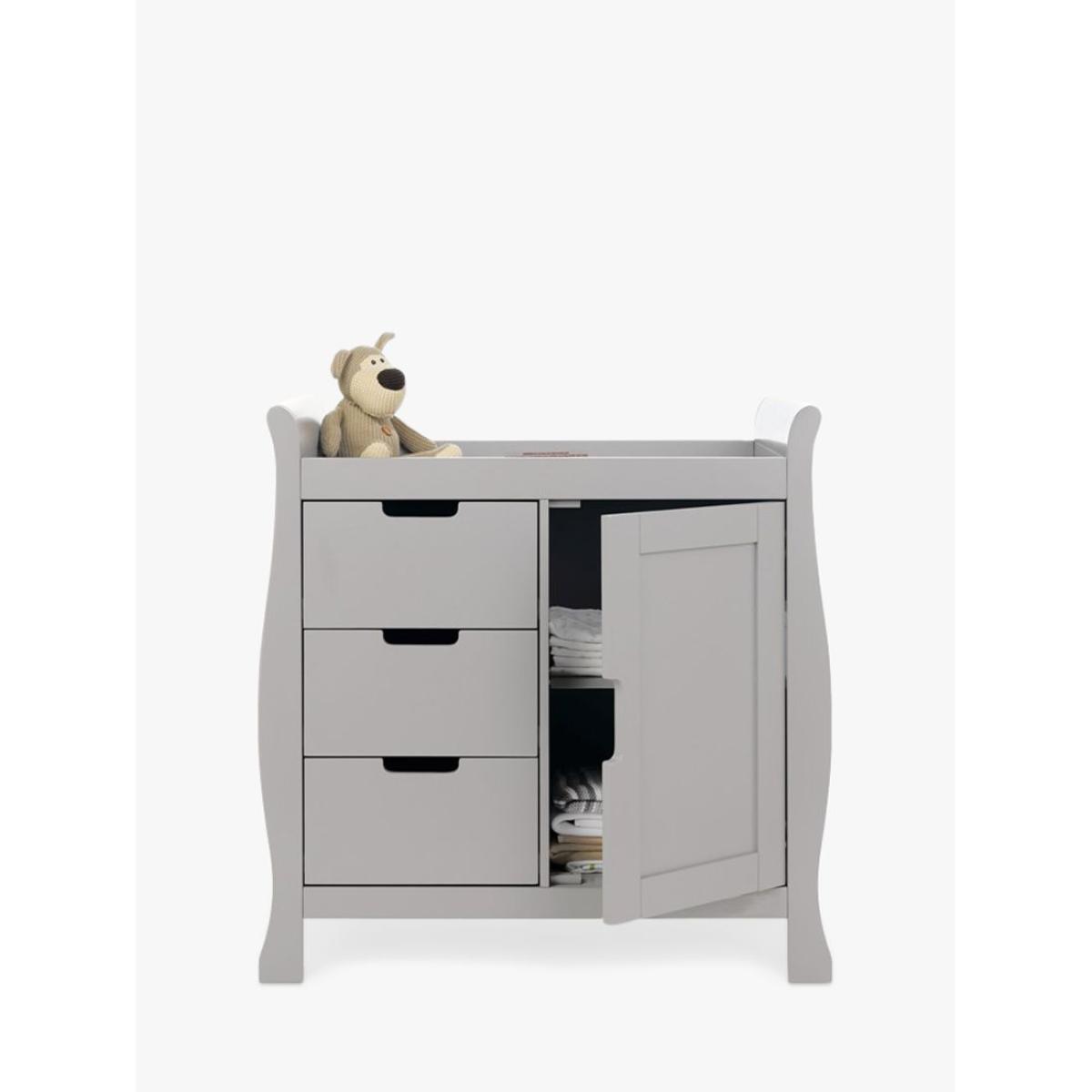 The Obaby Stamford furniture range offers families the perfect combination of style, quality and practicality. The Changing unit is the ideal choice for parents looking for perfect design, without compromising on features. This beautiful closed changing unit features the same elegant sleigh design that flows through the rest of the Stamford range. Sleek lines and recessed handles create a stylish and uncluttered look, whilst ensuring it is simple to use. Its combination of three spacious 13. L capacity drawers and full height cupboard with adjustable shelf and soft close door provide plenty of storage options. Whilst the cleverly recessed section on the top of the changing unit perfectly accommodates a changing mat up to 76 x 46cm. For this item, our supplier can deliver to your doorstep, but the drivers cannot enter your property. If you live in a flat, the delivery driver will be able to bring the boxes to the main entrance of the building, but they will not be able to take them up to the door of your flat. Therefore, we recommend having someone with you who can take in the boxes.