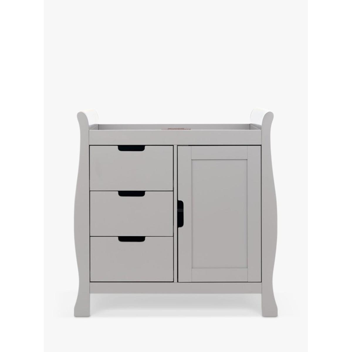 The Obaby Stamford furniture range offers families the perfect combination of style, quality and practicality. The Changing unit is the ideal choice for parents looking for perfect design, without compromising on features. This beautiful closed changing unit features the same elegant sleigh design that flows through the rest of the Stamford range. Sleek lines and recessed handles create a stylish and uncluttered look, whilst ensuring it is simple to use. Its combination of three spacious 13. L capacity drawers and full height cupboard with adjustable shelf and soft close door provide plenty of storage options. Whilst the cleverly recessed section on the top of the changing unit perfectly accommodates a changing mat up to 76 x 46cm. For this item, our supplier can deliver to your doorstep, but the drivers cannot enter your property. If you live in a flat, the delivery driver will be able to bring the boxes to the main entrance of the building, but they will not be able to take them up to the door of your flat. Therefore, we recommend having someone with you who can take in the boxes.