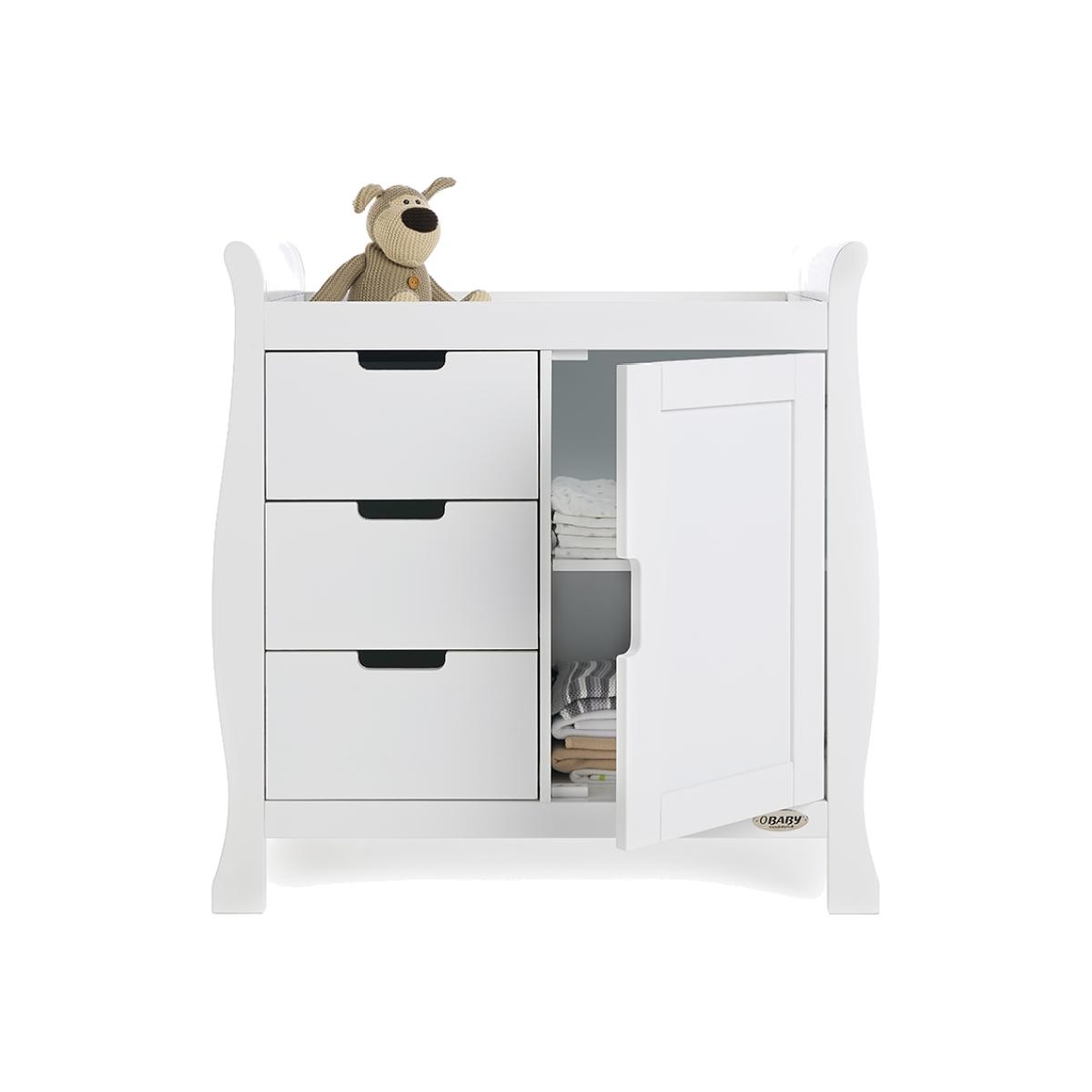 The Stamford collection from Obaby offers a beautifully elegant touch to your Baby's nursery and this Baby Changing Unit is no exception. The classically crafted dresser is made from solid wood and has 3 drawers on the left, with a full length cupboard on the right with an adjustable shelf, giving generous storage for all baby's essentials. An integrated top provides a cleverly modelled area to fit a changing mat giving snug protection and a simplistic look. Recessed handles utilise a seamless and snag free design and the stylish curved roll top design gives an instant vintage feel yet meeting all the requirements for modern day storage needs. Available in a choice of colours - so there's something for every little person's room. The Stamford Changing Unit and Wardrobes can be purchased as separate items or available as a complete room set including a cot - all available here at Cuckooland.