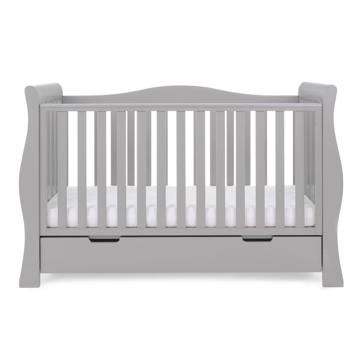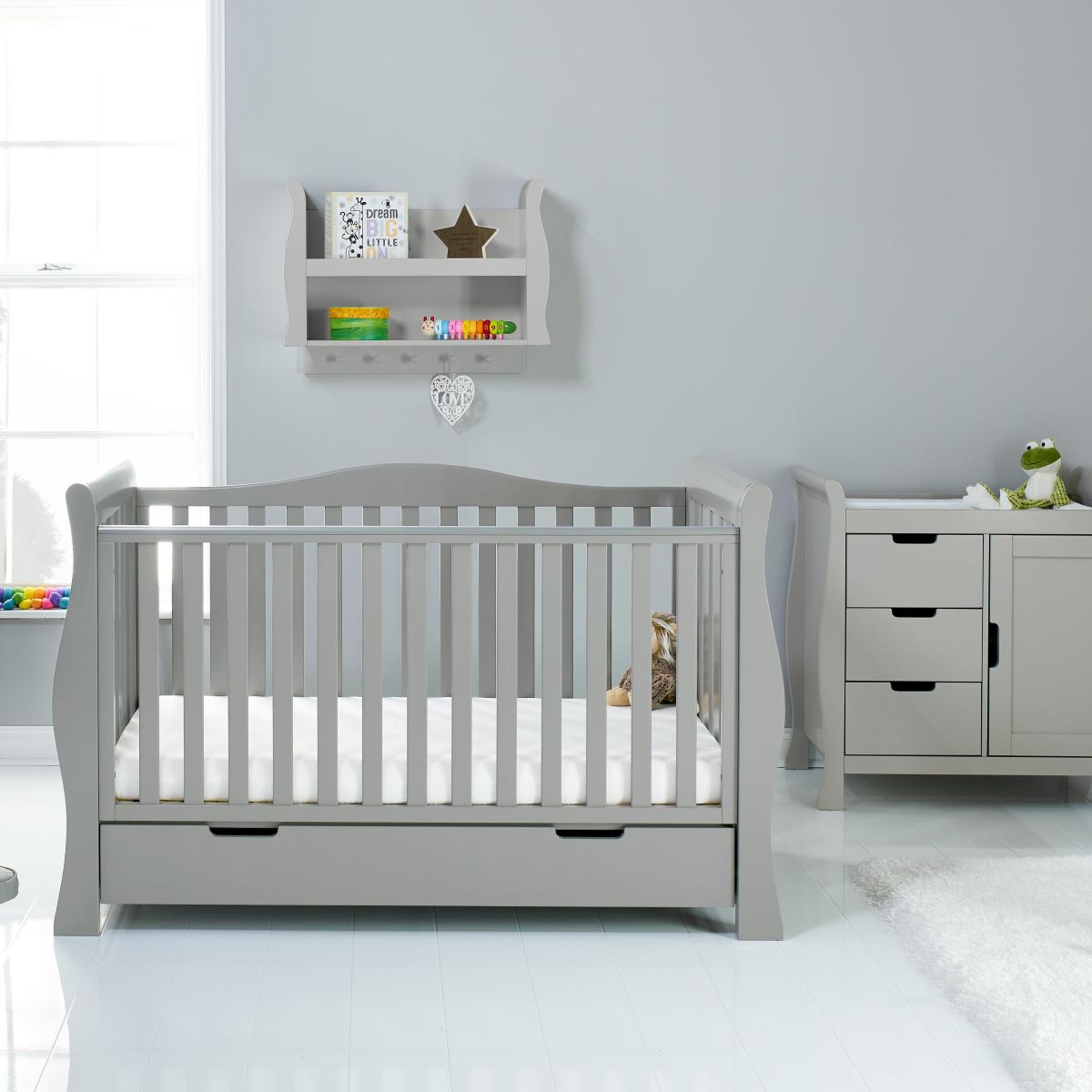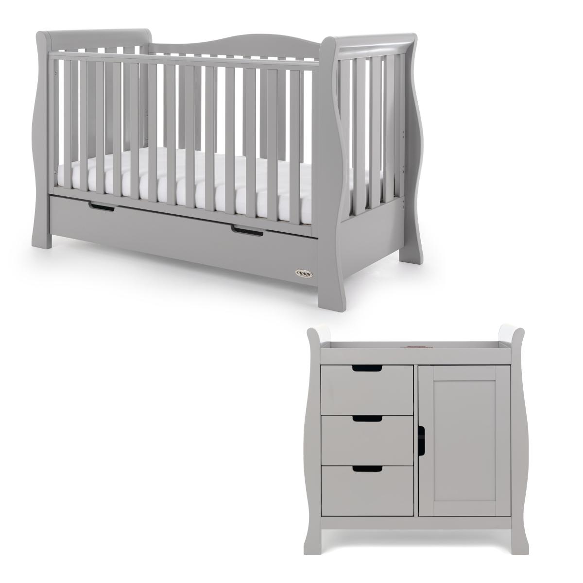This Stamford Luxe 2 piece set is perfect for getting your nursery ready for the arrival of your little one. The set includes a cot bed that has a large under drawer, perfect for discreetly stashing away some baby essentials. The 3 half drawer and cupboard changing unit can not only store your regular nappy changing essentials away, but also has the top to fit a changing mat on! Chose between a warm grey or white colourway and pick the best colourway to best suit your nursery theme. Cot Bed As your child begins growing during their first years of life, this cot bed caters for them up until they are around 4 years of age. As your baby grows, you can lower the mattress base to accommodate their changes. When they are old enough, you can remove the sides to transform the cot into a toddler bed. A 77. L under drawer provides a large space for storing your baby essentials. Changing Unit Prepare your nursery for those regular nappy changes with the stylish and functional Stamford Closed Changing Unit. Designed with a large cupboard section with a soft close door and adjustable shelf so you can stock your nappies, towels and other essentials, it also features three half width, full depth drawers each with an impressive 13 Litre capacity so you can organise creams and ointments, spare changes of clothes, toys and other essentials which are easy to locate and closed off from little wandering hands. The space on top allows a good level and easy positioning for you to complete your change and the area is designed to fit a changing mat up to a size of 76 x 45cm.