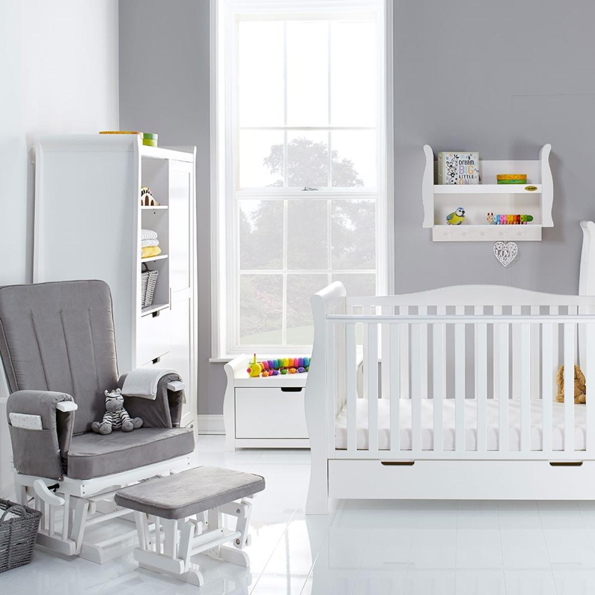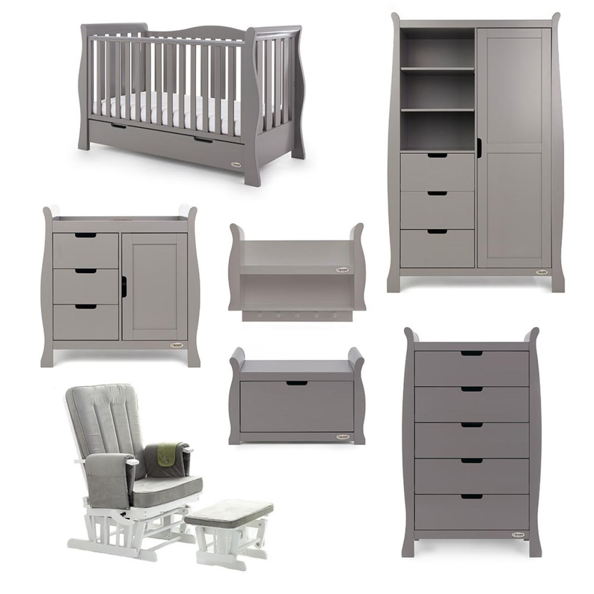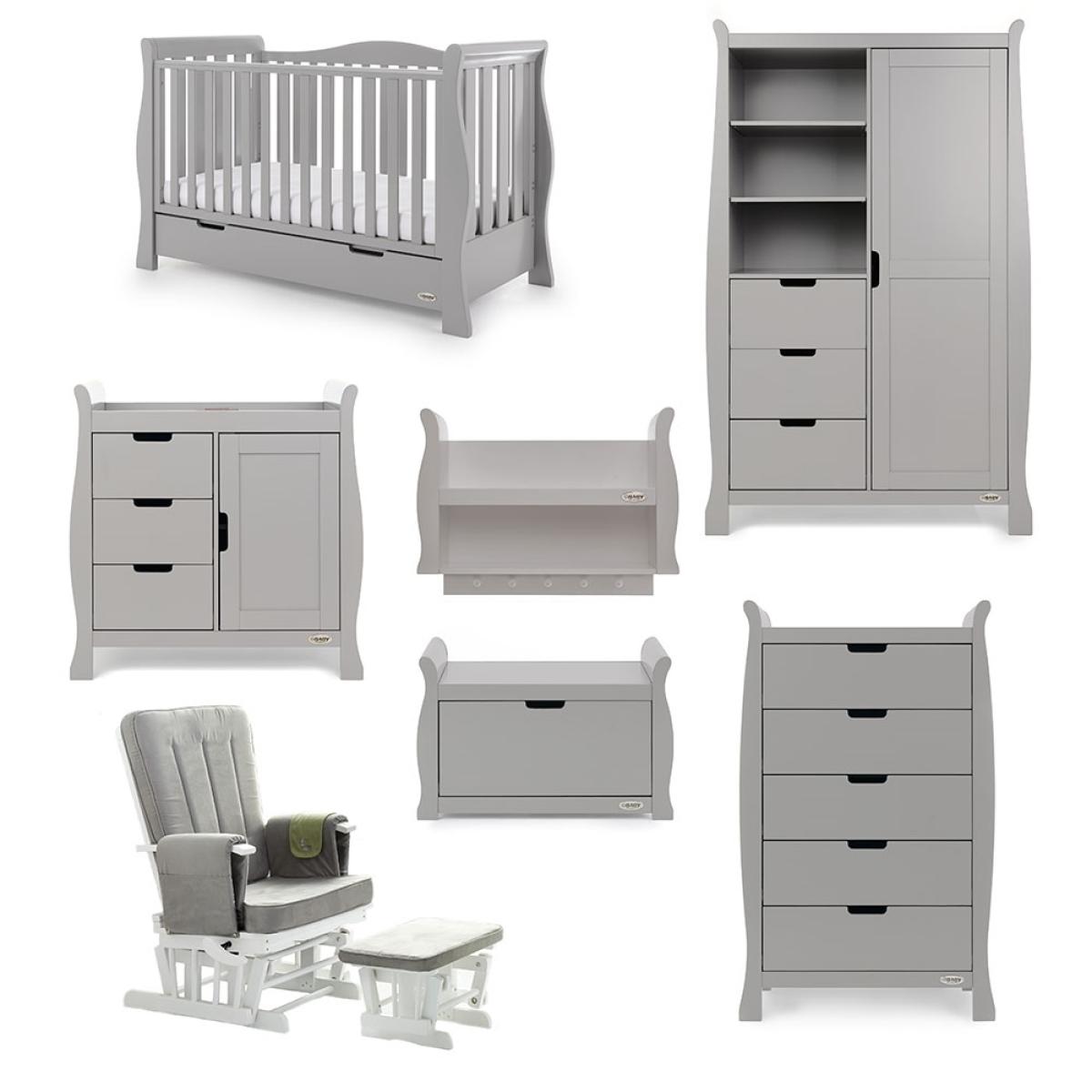 Suitable from birth to 4 years, the stylish 4-in-1 Obaby Stamford Luxe Cot Bed 7 Piece Nursery Furniture Set can be adjusted to suit the needs of your little one as they continue to grow! The sleigh cot bed features 3 height settings, so when your baby starts sitting and standing independently, the mattress base can be lowered, ensuring they are safe and secure at all times. When they've outgrown their baby bed, remove the sides and convert the frame from a cot to a junior bed with bed guards, and then into a day bed and continue using this gorgeous design for years to come! Boasting a spacious under-bed drawer, bedding and toys can be kept neat and tidy. Including a deluxe reclining nursing chair and footstool, the gentle rocking motion soothes baby and helps you relax. Including thick cushions with handy storage compartments, whether it's feeding time or story time, both you and baby will love this glider chair! Toys, books and decorations can be stored on the shelf; including 5 hooks, coats, outfits and baby blankets can be hung up out of the way. And with a toy box, their bedroom will be the epitome of organised! Suited to storing clothing, nappies and nursery essentials; the matching tall dresser includes 5 deep drawers while the changing unit provides three extra drawers and a full length cupboard with an adjustable shelf and an elegant top to hold changing mats in place. Including a stunning double wardrobe with additional storage drawers and adjustable shelves, store baby clothes in the full length cupboard with two hanging rails. All drawers open and close smoothly and the recessed handles prevent trapped fingers! Perfect for little hands! With more than enough storage, the nursery will be stress and clutter-free! With other colours to choose from, you are sure to find the ideal set for you and your little bundle!.
