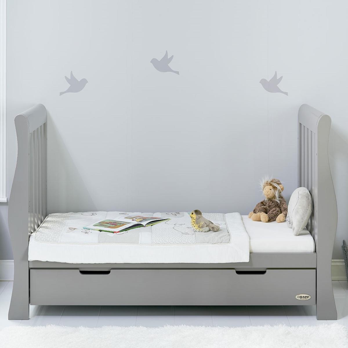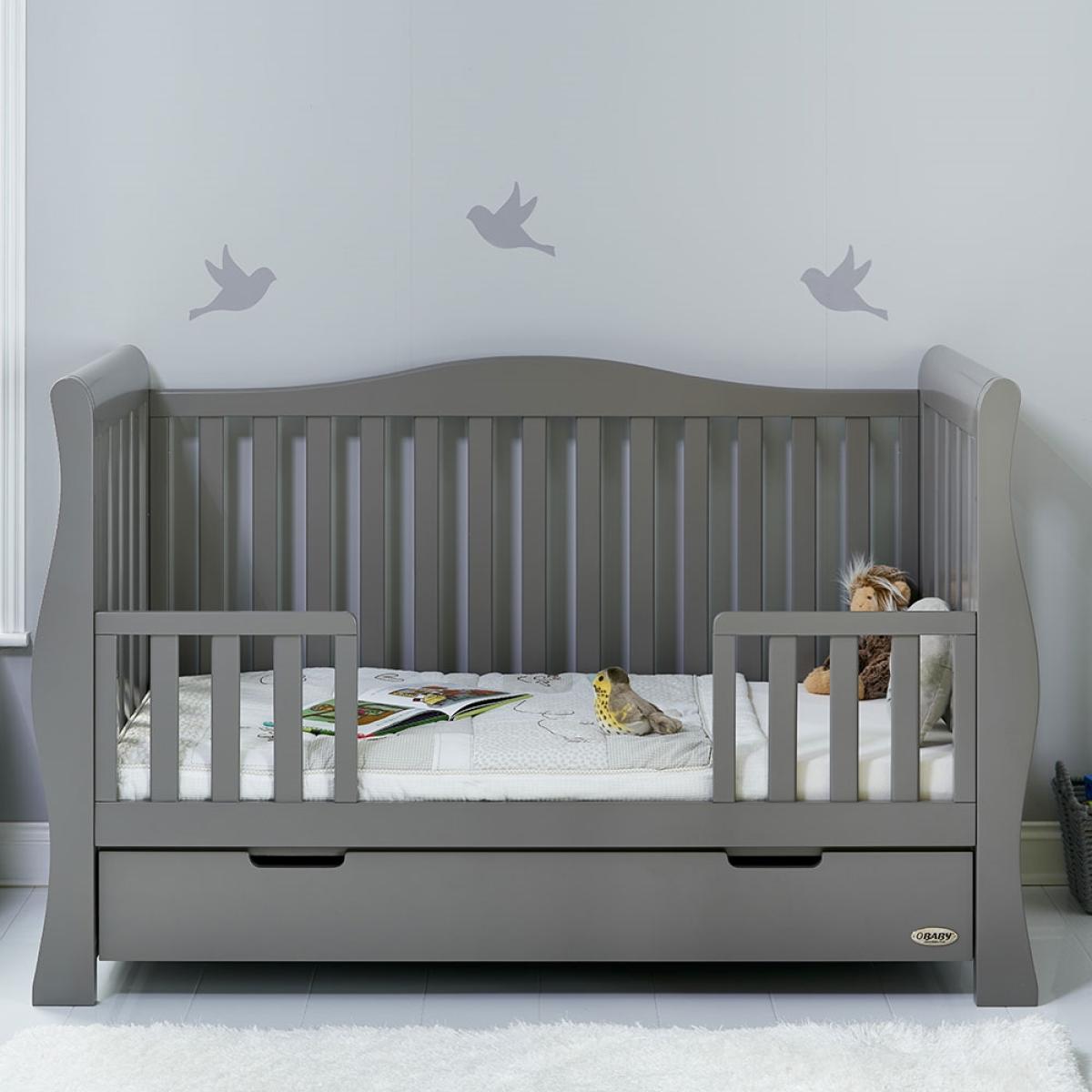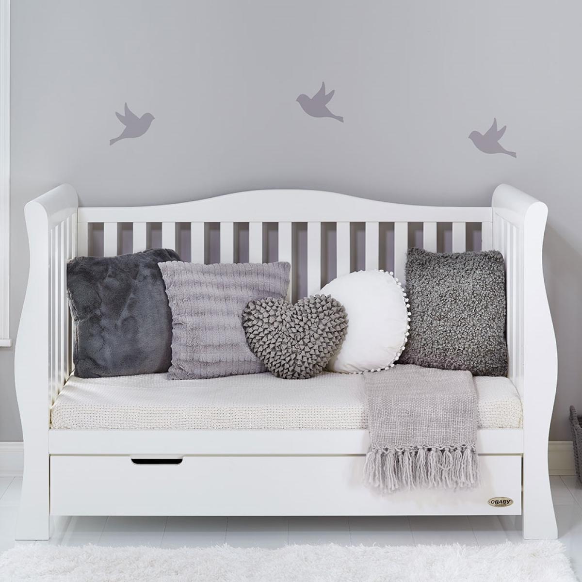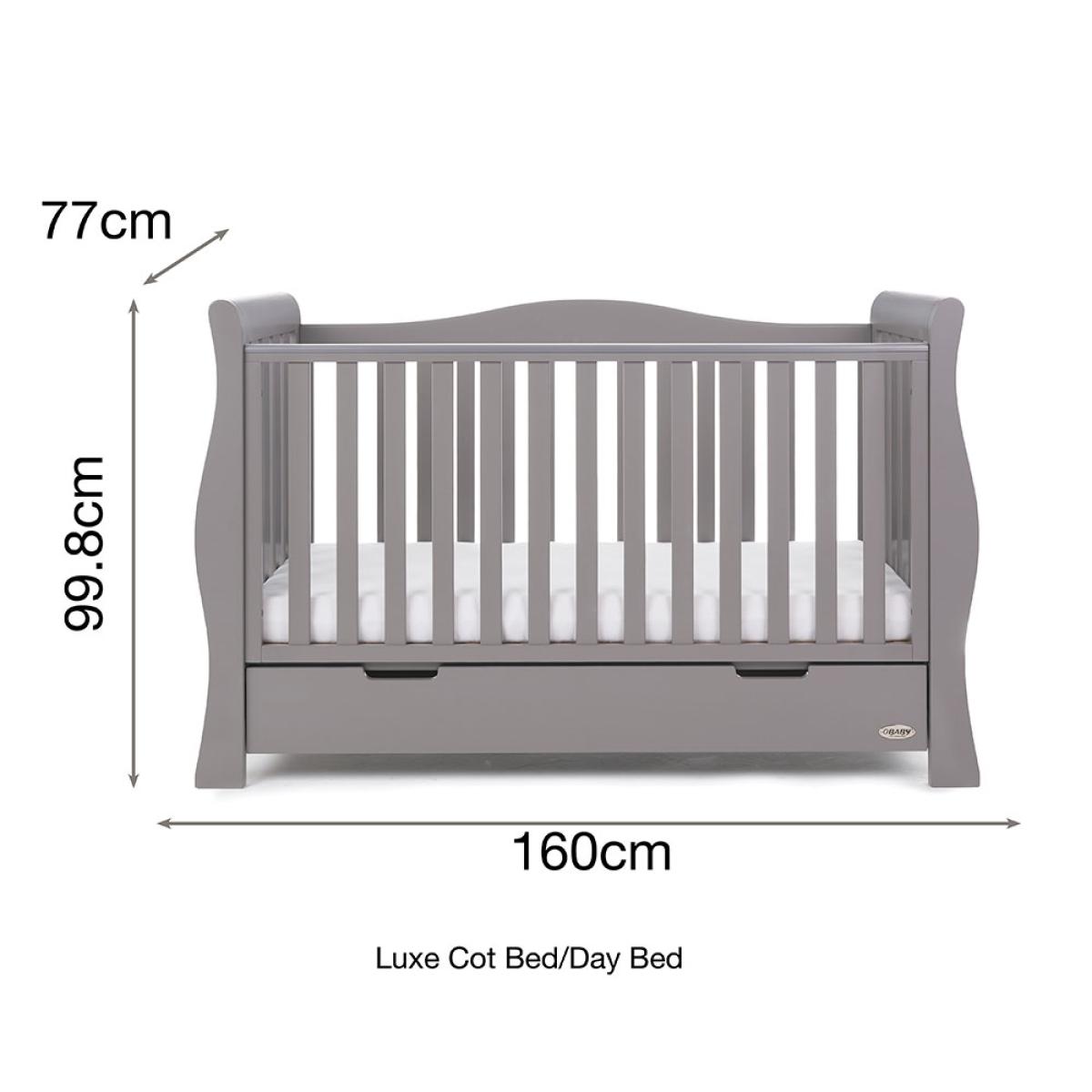 Suitable from birth to 4 years, the stylish 4-in-1 Obaby Stamford Luxe Cot Bed 7 Piece Nursery Furniture Set can be adjusted to suit the needs of your little one as they continue to grow! The sleigh cot bed features 3 height settings, so when your baby starts sitting and standing independently, the mattress base can be lowered, ensuring they are safe and secure at all times. When they've outgrown their baby bed, remove the sides and convert the frame from a cot to a junior bed with bed guards, and then into a day bed and continue using this gorgeous design for years to come! Boasting a spacious under-bed drawer, bedding and toys can be kept neat and tidy. Including a deluxe reclining nursing chair and footstool, the gentle rocking motion soothes baby and helps you relax. Including thick cushions with handy storage compartments, whether it's feeding time or story time, both you and baby will love this glider chair! Toys, books and decorations can be stored on the shelf; including 5 hooks, coats, outfits and baby blankets can be hung up out of the way. And with a toy box, their bedroom will be the epitome of organised! Suited to storing clothing, nappies and nursery essentials; the matching tall dresser includes 5 deep drawers while the changing unit provides three extra drawers and a full length cupboard with an adjustable shelf and an elegant top to hold changing mats in place. Including a stunning double wardrobe with additional storage drawers and adjustable shelves, store baby clothes in the full length cupboard with two hanging rails. All drawers open and close smoothly and the recessed handles prevent trapped fingers! Perfect for little hands! With more than enough storage, the nursery will be stress and clutter-free! With other colours to choose from, you are sure to find the ideal set for you and your little bundle!.