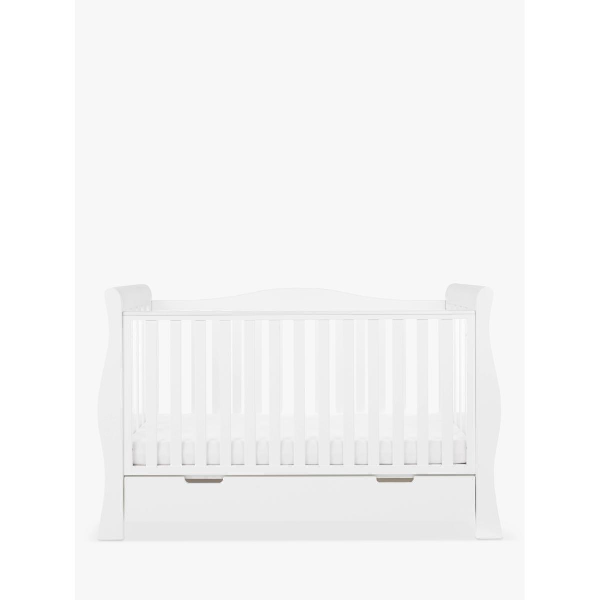 Obaby’s Stamford furniture range offers families the perfect combination of style, quality and practicality. Standing proud at the top of the range is the beautiful Stamford Luxe sleigh cot bed, crafted from thick, solid pine and featuring deluxe hand-carved ends that flow perfectly into the curved rear side rail creating a unique look that truly sets the Luxe apart from other sleigh cot beds. The Luxe cot bed can adapt to suit every stage of your little one’s early development. Starting as a cot, the Luxe features an adjustable mattress base; the top position allows parents to put down their new-born without unnecessary bending and as your baby learns to sit and stand, the base can be lowered by two further positions to ensure that they are safe and secure at all times while the presence of a teething rail helps to protect their delicate first teeth. Once your child is old enough to progress to a toddler bed, both side rails can be removed to create a toddler bed that can be used up until approximately four years old. Alternatively, if this is too large a step, use the included safety rail for familiarity and reassurance during an often-daunting transition until they get used to their big bed. And finally, when they outgrow this, the Luxe can become a useful day bed for lounging and relaxing. This cotbed requires an Obaby 140 x 70cm mattress, sold separately. The integrated under drawer smoothly glides on runners, fitting neatly under the cot bed. With a huge 77. L capacity there is plenty of storage for your child’s precious belongings and clothes. Recessed handles create a stylish and uncluttered look, whilst ensuring it remains snag free and simple to use. For this item, our supplier can deliver to your doorstep, but the drivers cannot enter your property. If you live in a flat, the delivery driver will be able to bring the boxes to the main entrance of the building, but they will not be able to take them up to the door of your flat. Therefore, we recommend having someone with you who can take in the boxes.