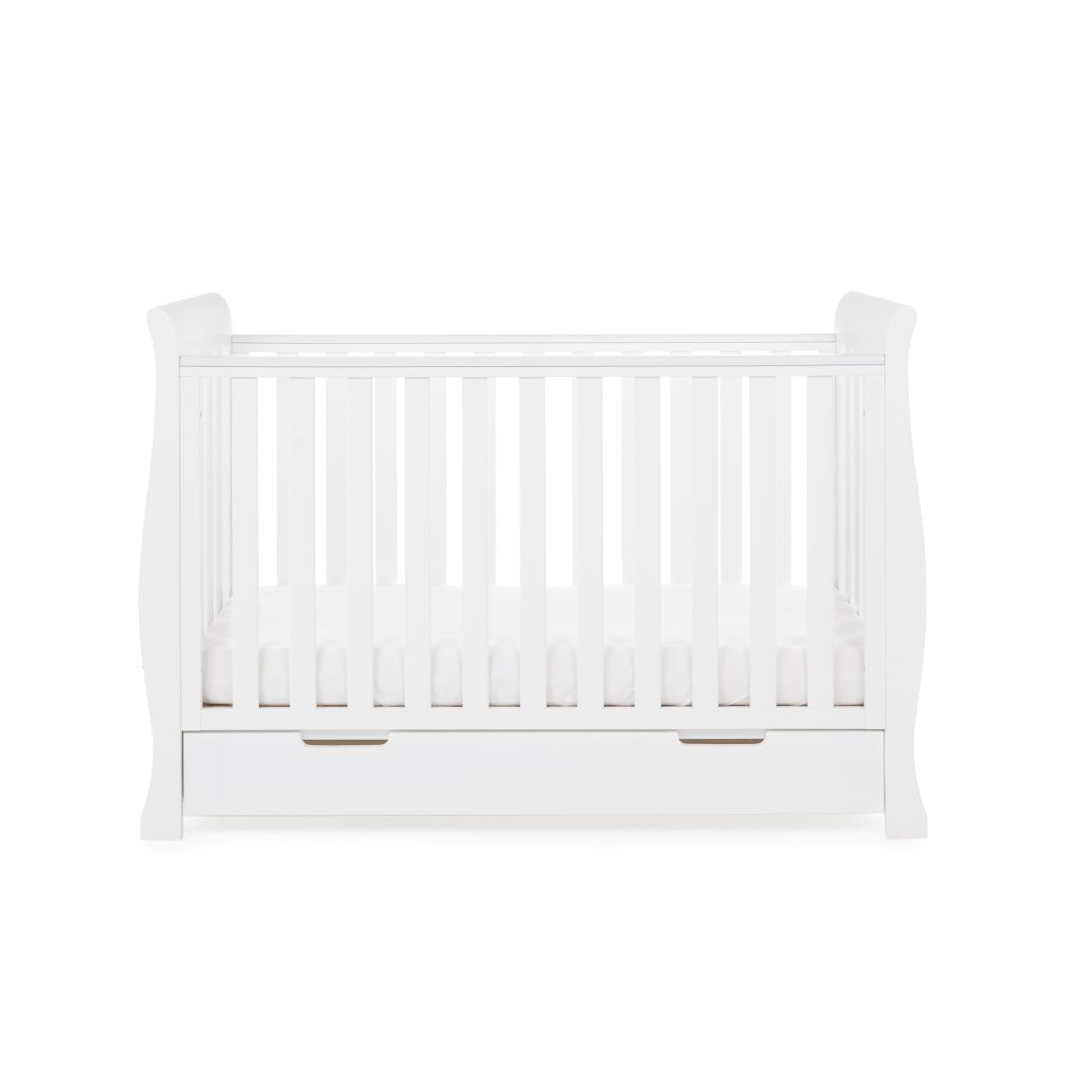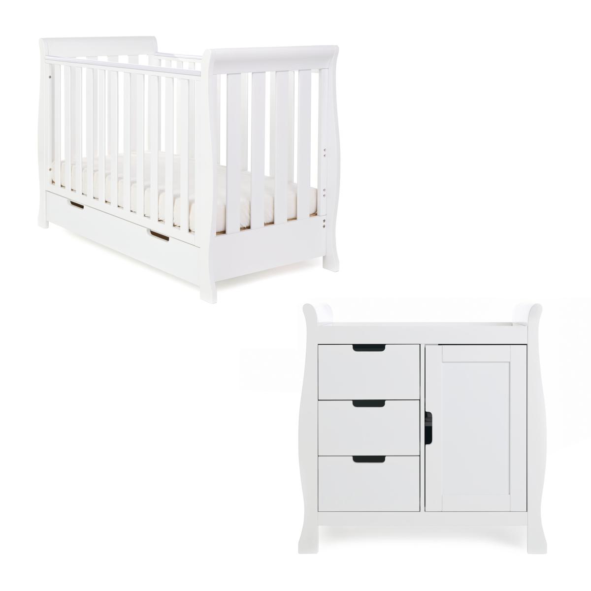 Give your nursery a stylish design while giving your little one a place to sleep, a place to change them and some extra storage. The Stamford mini 2 piece nursery set includes a mini cot bed and a changing unit. With a compact design and an under drawer, the cot bed is perfect for a compact living space. The 3 drawer changing unit has plenty of storage space for your little one's clothing and toys. The white sleigh design will look great with any nursery theme you have chosen. Cot Bed The cot includes an under drawer that provides you with extra storage space for your baby essentials. As your baby grows, you can lower the mattress base to accommodate their changes. When they are old enough, you can remove the sides to transform the cot into a toddler bed. Changing Unit Prepare your nursery for those regular nappy changes with the stylish and functional Stamford Closed Changing Unit. Designed with a large cupboard section with a soft close door and adjustable shelf so you can stock your nappies, towels and other essentials, it also features three half width, full depth drawers each with an impressive 13 Litre capacity so you can organise creams and ointments, spare changes of clothes, toys and other essentials which are easy to locate and closed off from little wandering hands. The space on top allows a good level and easy positioning for you to complete your change and the area is designed to fit a changing mat up to a size of 76 x 45cm.