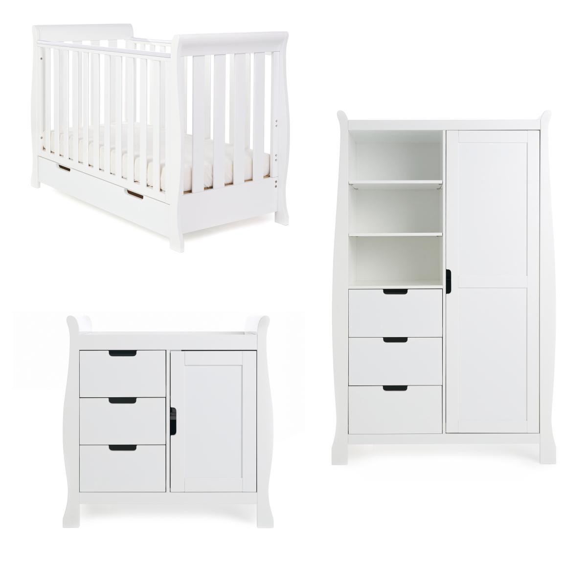Give your nursery a stylish design while giving your little one a place to sleep, a place to change them and some extra storage. The Stamford mini 3 piece nursery set includes a mini cot bed, a changing unit and a double wardrobe. With a compact design and an under drawer, the cot bed is perfect for a compact living space. The 3 drawer changing unit has plenty of storage space for your little one's regular nappy changing essentials. The double wardrobe is perfect for storing an toys and clothes your little one may have. The white sleigh design will look great with any nursery theme you have chosen. Cot Bed The cot includes an under drawer that provides you with extra storage space for your baby essentials. As your baby grows, you can lower the mattress base to accommodate their changes. When they are old enough, you can remove the sides to transform the cot into a toddler bed. Changing Unit Prepare your nursery for those regular nappy changes with the stylish and functional Stamford Closed Changing Unit. Designed with a large cupboard section with a soft close door and adjustable shelf so you can stock your nappies, towels and other essentials, it also features three half width, full depth drawers each with an impressive 13 Litre capacity so you can organise creams and ointments, spare changes of clothes, toys and other essentials which are easy to locate and closed off from little wandering hands. The space on top allows a good level and easy positioning for you to complete your change and the area is designed to fit a changing mat up to a size of 76 x 45cm. Wardrobe Designed with a curvy sleigh shape and a full length soft close door, this piece maximises storage potential with 3 half width open shelves to display memorabilia, sentimental objects or quick access clothing as well as 3 drawers below, each with a 21 Litre capacity for excellent visibility and organising potential.