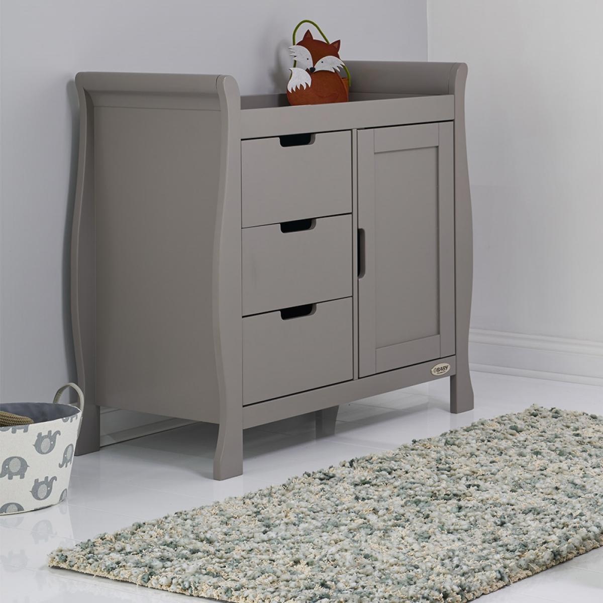 This stunning 2 piece Nursery Set by Obaby is in Taupe Grey and will add a touch of class to your baby's bedroom. For those looking for all of the great features of a full size cot bed but with limited space, the Stamford Mini Sleigh Cot Bed is the perfect addition to any nursery. The Mini Cot Bed is constructed from solid wood and once your child is old enough to progress to a bed, the fixed sides can be removed to create a timeless day bed providing you with extra use for years to come. The Stamford mini cot bed also features a matching under drawer which slides neatly under the cot bed and offers parents that much needed extra storage without taking up valuable space elsewhere. The matching Changing Unit provides three generous drawers and a full length cupboard with an adjustable shelf. The double wardrobe consists of three adjustable shelves, three drawers, a full length cupboard and two hanging rails. Recessed handles have been cleverly utilised on all pieces to create a stylish and uncluttered look and ensure the units are snag free and simple to use. The Obaby Stamford Mini 2 Piece Nursery Furniture Set strikes the perfect balance between modern and traditional aesthetics, represents great value and is available in a range of colour options - meaning that there is a Stamford range for any style of nursery.