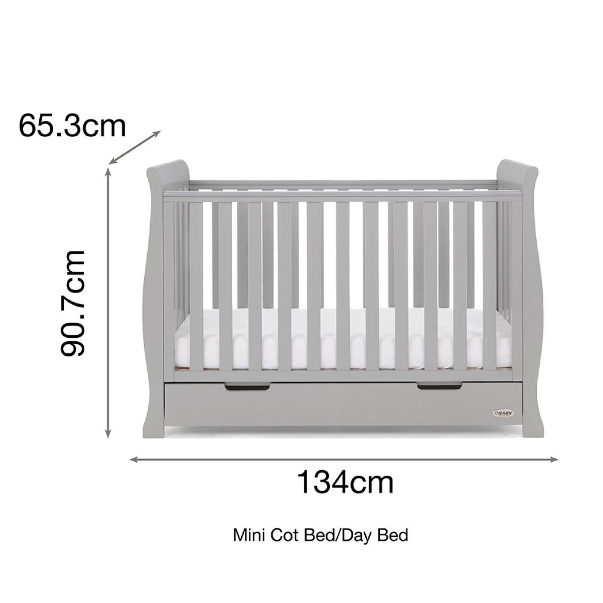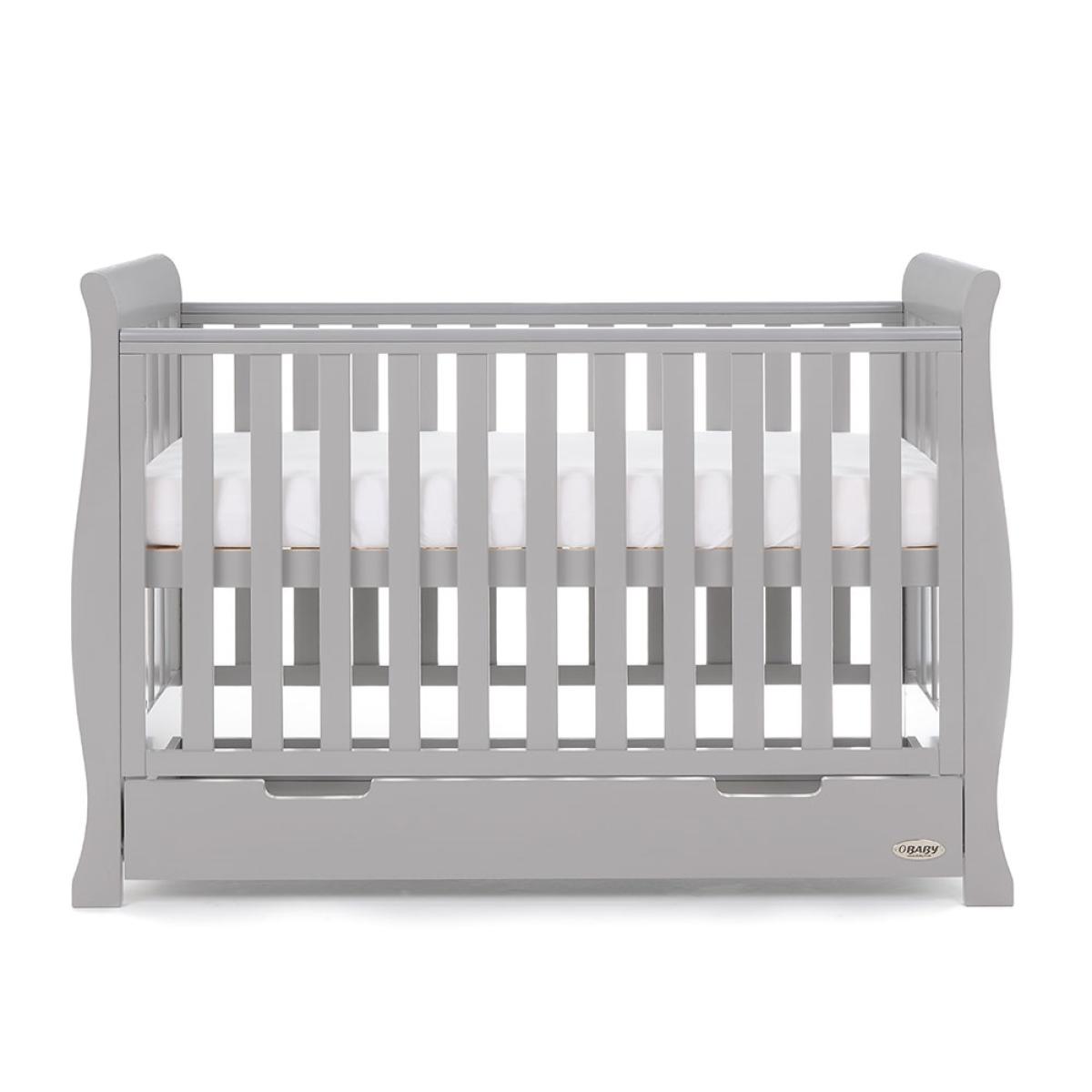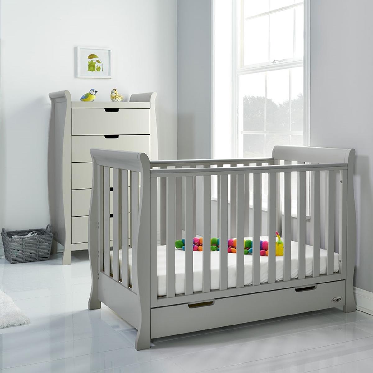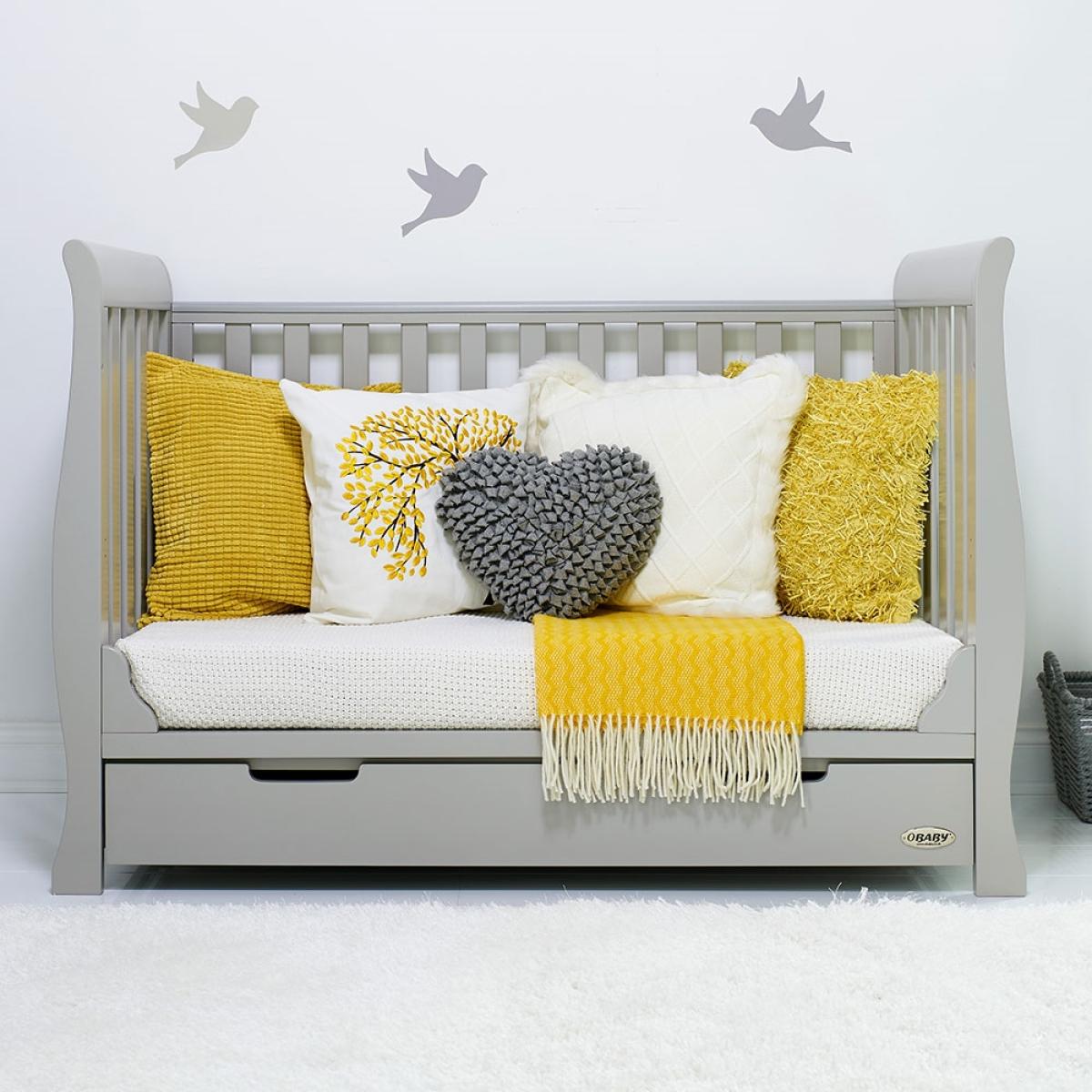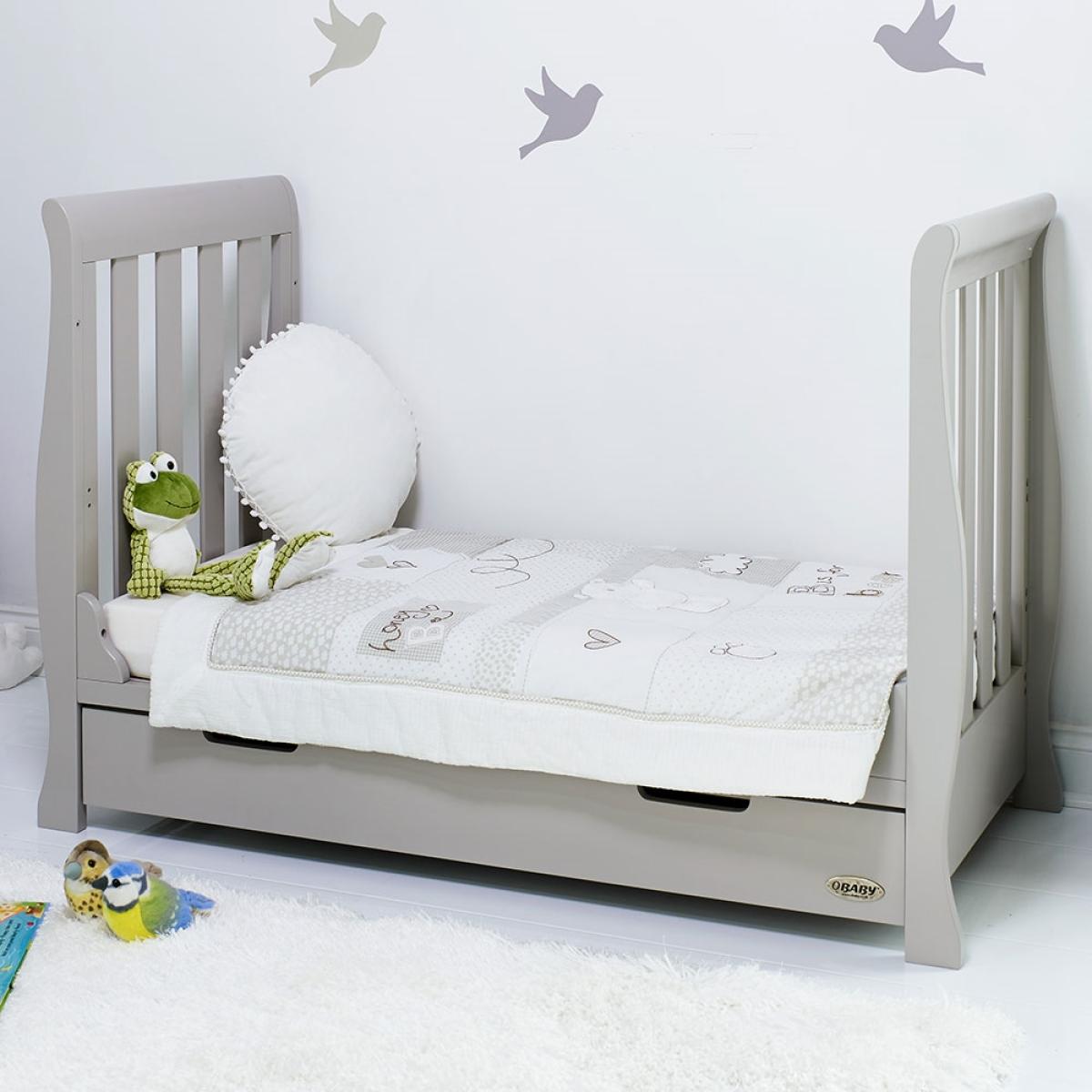 The Stamford Mini Sleigh Cot Bed in Warm Grey is a beautiful piece of nursery furniture featuring a matching under drawer which slides neatly under the cotbed and offers parents that much needed extra storage space. As your little bean grows, so does this fabulous cot bed! The sidescan be removed and transformed to create a perfectly sized toddler bed; there is no need to buy new furniture when you canadapt this luxury bedroom furniture instead. Don't turf out the old and buy new, simply adapt and transform this cot bed into somethingentirely different! For the ultimate in Nursery chic, the Stamford is also available at Cuckooland as a complete room set - a beautiful range at great value. Also available in a range of other gorgeous colours!.
