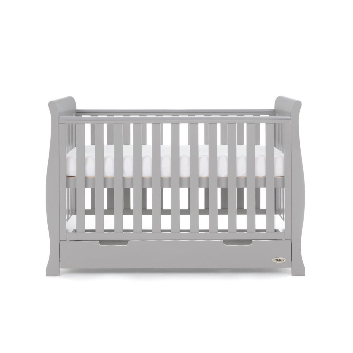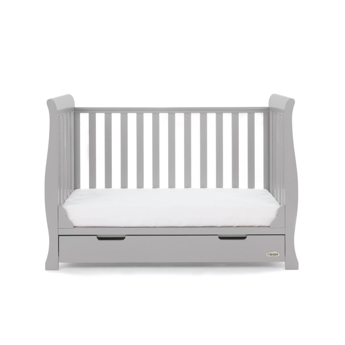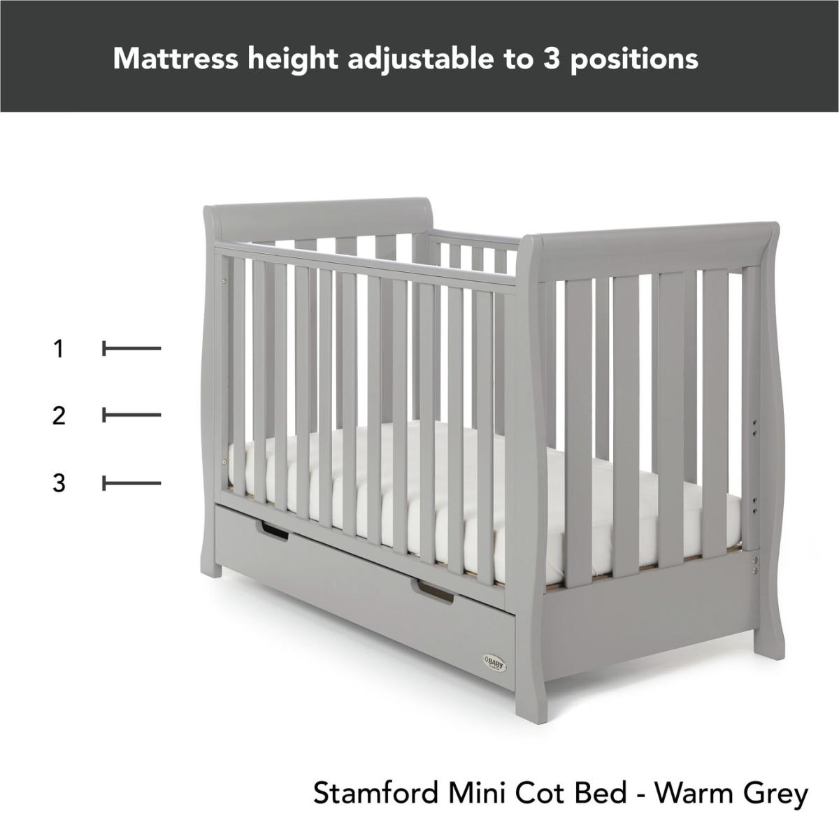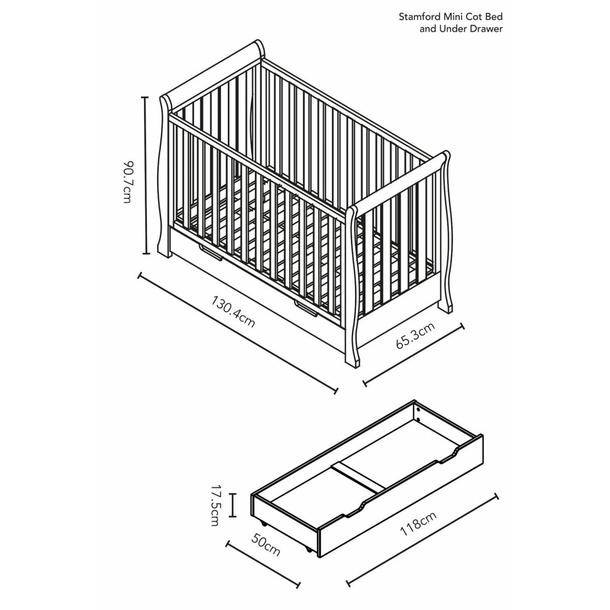 Part of the Obaby Stamford range, this beautifully crafted mini cot bed features an elegant sleigh design and is perfect for those with limited space. As your child grows, the mattress base can be lowered, with three base heights available in total, providing extra reassurance. The cot bed can be converted twice, firstly into a cosy junior bed that is suitable for a child up to three years old and secondly into a stylish day bed, offering great value for years to come. Includes a 26. L capacity under drawer for convenient storage. Part of the Obaby Stamford collection. Suitable from birth to 3 years. Suitable for babies up to 20kg. Made from wood. Self-assembly. Cot Features Size L134, W66, H90cm. Weight 26kg. Teething rails - protects your baby's gums once they are teething and have started to chew. 3 position adjustable mattress base - allows you to lower the height of the mattress as your baby learns to sit and stand. Mattress base adjustable height 47.5cm, 38cm, 23cm. Height under cot 16.5cm. Under cot drawer included. Under cot drawer internal H8.5, W114,D48cm. Converts to toddler bed. to 3 years. Mattress Features Mattress size L120, W60,. Mattress not included.