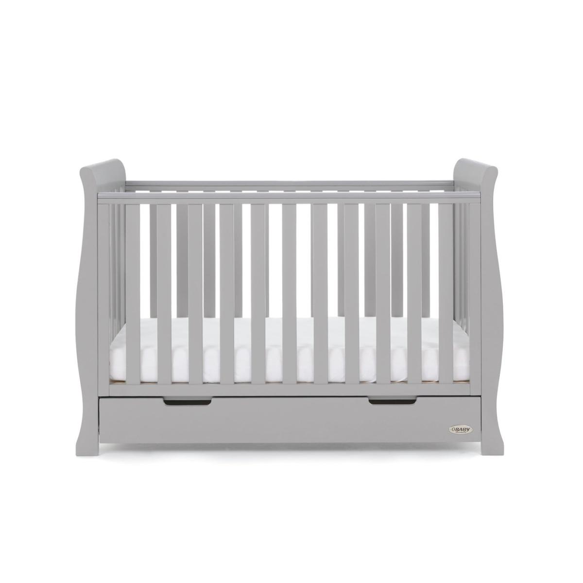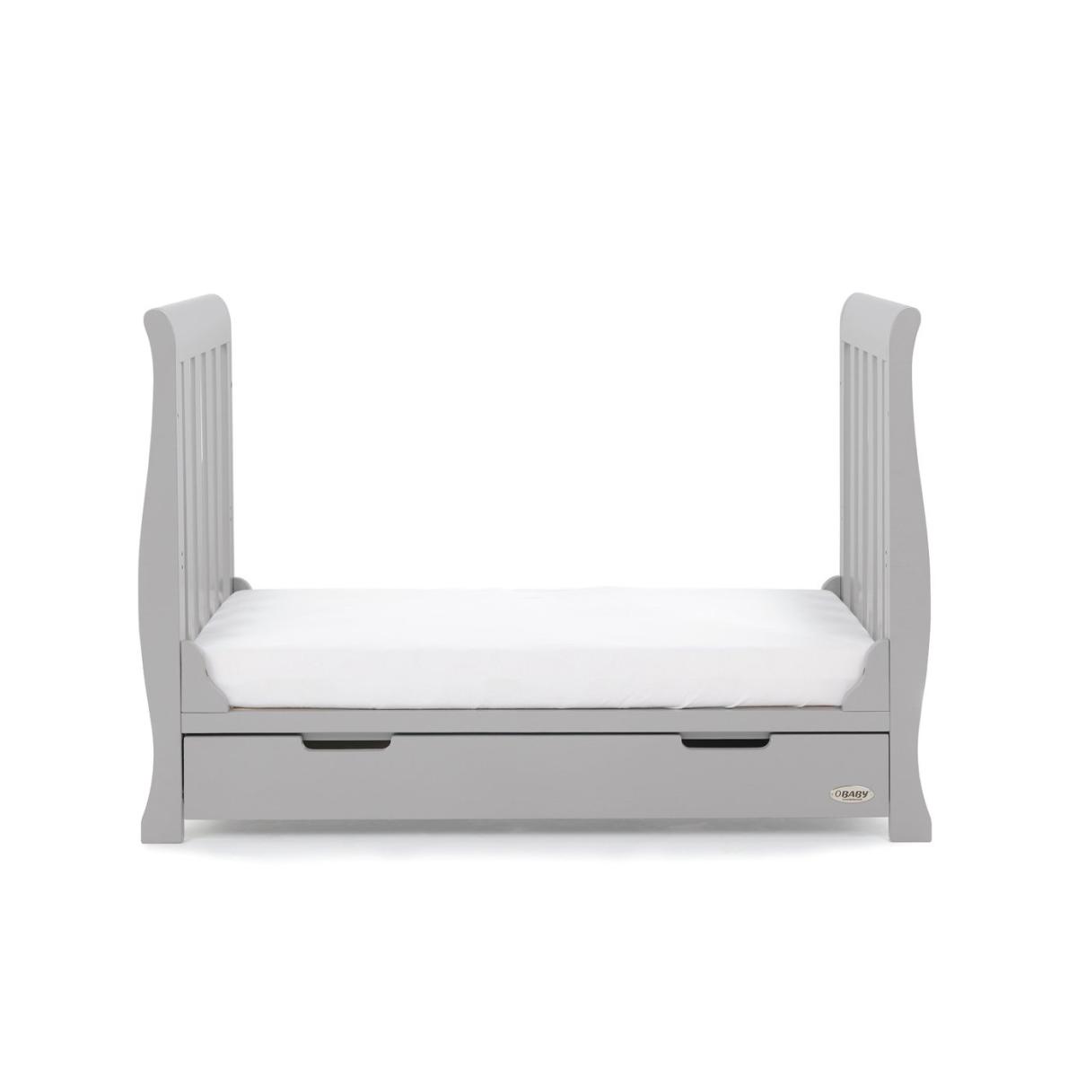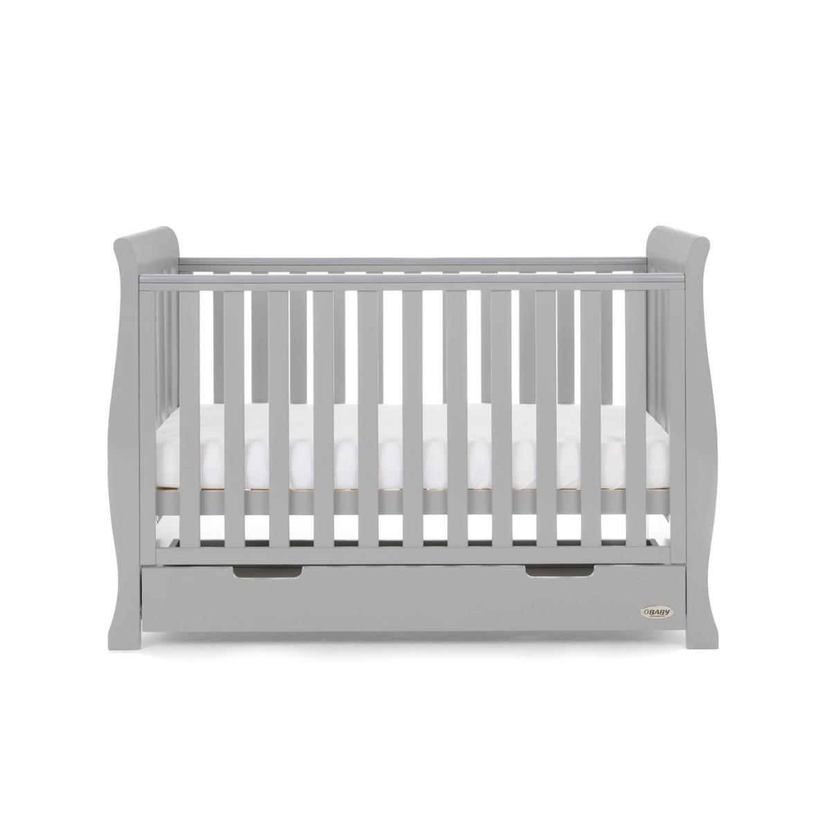 Part of the Obaby Stamford range, this beautifully crafted mini cot bed features an elegant sleigh design and is perfect for those with limited space. As your child grows, the mattress base can be lowered, with three base heights available in total, providing extra reassurance. The cot bed can be converted twice, firstly into a cosy junior bed that is suitable for a child up to three years old and secondly into a stylish day bed, offering great value for years to come. Includes a 26. L capacity under drawer for convenient storage. Part of the Obaby Stamford collection. Suitable from birth to 3 years. Suitable for babies up to 20kg. Made from wood. Self-assembly. Cot Features Size L134, W66, H90cm. Weight 26kg. Teething rails - protects your baby's gums once they are teething and have started to chew. 3 position adjustable mattress base - allows you to lower the height of the mattress as your baby learns to sit and stand. Mattress base adjustable height 47.5cm, 38cm, 23cm. Height under cot 16.5cm. Under cot drawer included. Under cot drawer internal H8.5, W114,D48cm. Converts to toddler bed. to 3 years. Mattress Features Mattress size L120, W60,. Mattress not included.