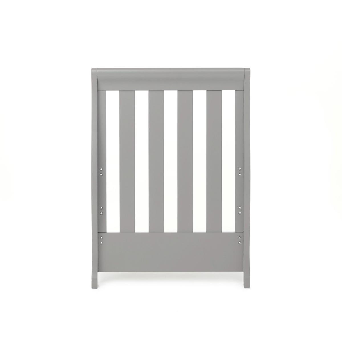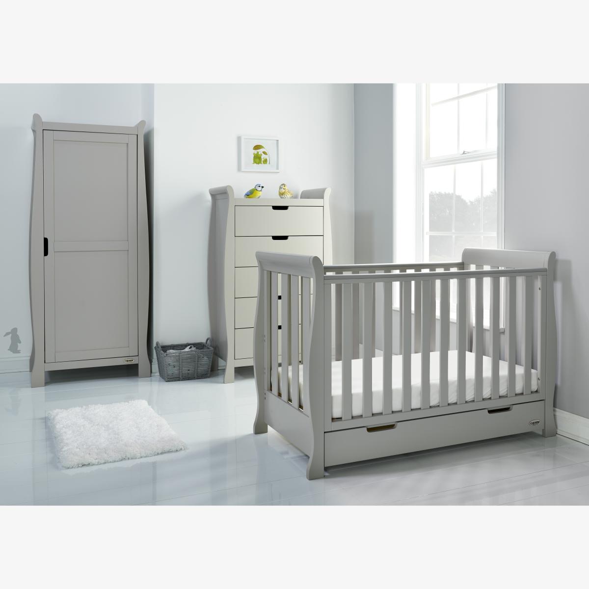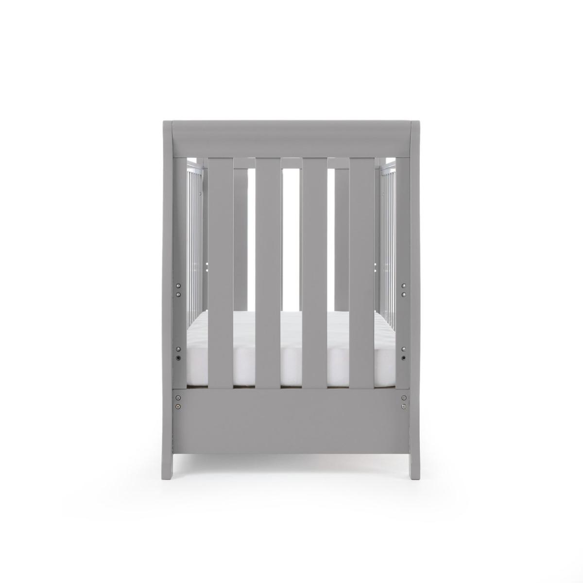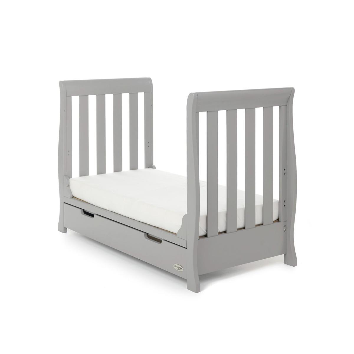 Part of the Obaby Stamford range, this beautifully crafted mini cot bed features an elegant sleigh design and is perfect for those with limited space. As your child grows, the mattress base can be lowered, with three base heights available in total, providing extra reassurance. The cot bed can be converted twice, firstly into a cosy junior bed that is suitable for a child up to three years old and secondly into a stylish day bed, offering great value for years to come. Includes a 26. L capacity under drawer for convenient storage. Part of the Obaby Stamford collection. Suitable from birth to 3 years. Suitable for babies up to 20kg. Made from wood. Self-assembly. Cot Features Size L134, W66, H90cm. Weight 26kg. Teething rails - protects your baby's gums once they are teething and have started to chew. 3 position adjustable mattress base - allows you to lower the height of the mattress as your baby learns to sit and stand. Mattress base adjustable height 47.5cm, 38cm, 23cm. Height under cot 16.5cm. Under cot drawer included. Under cot drawer internal H8.5, W114,D48cm. Converts to toddler bed. to 3 years. Mattress Features Mattress size L120, W60,. Mattress not included.