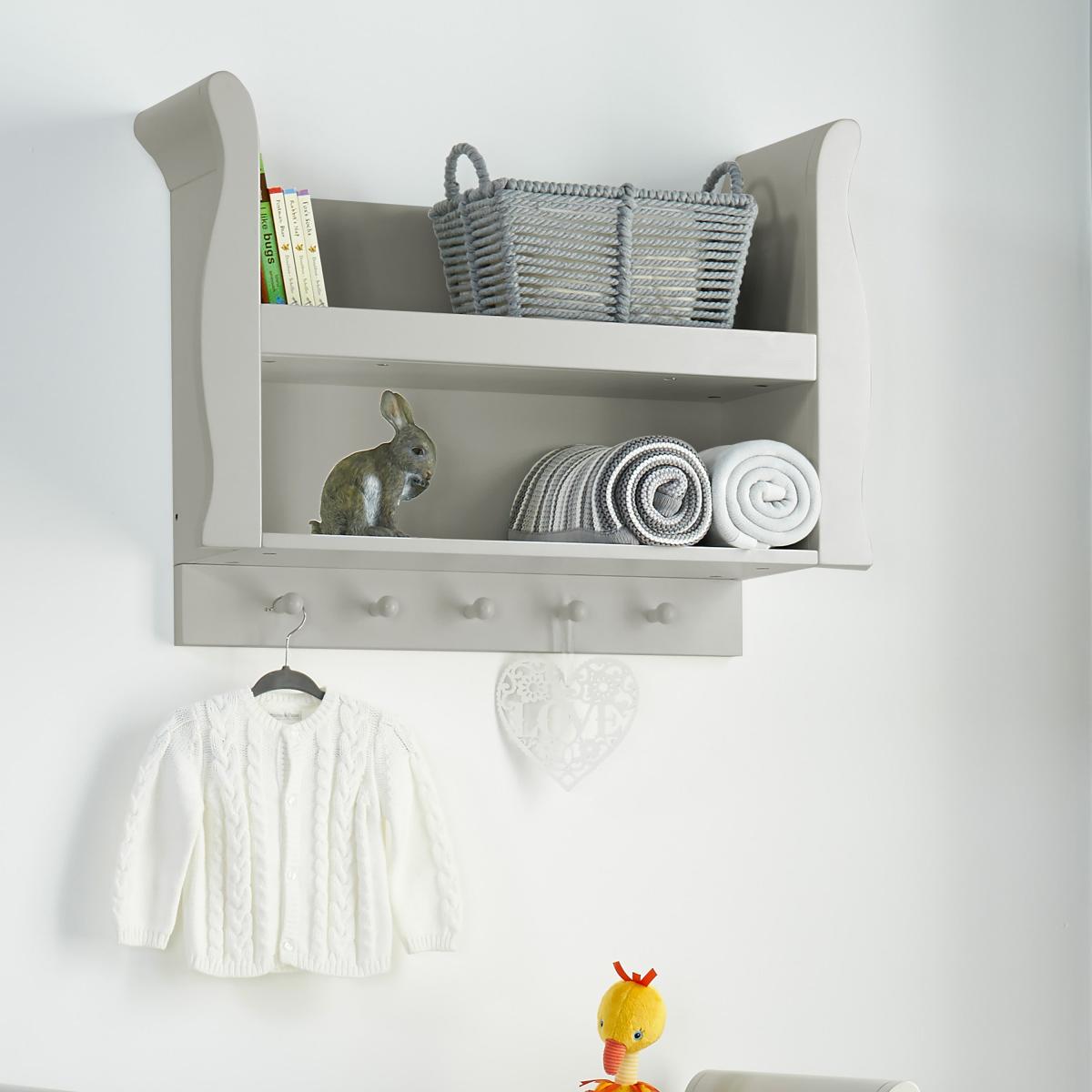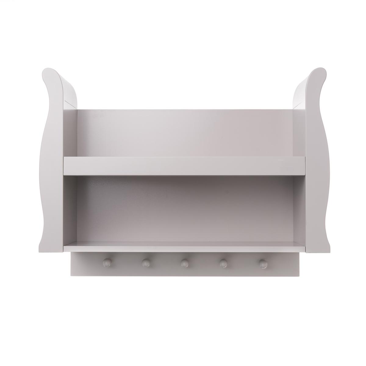 * Two shelves for extra storage* Top lip prevents items from falling* Five pegs for additional hanging storage* Elegant sleigh design* Full assembly required Are you running out of room for your little one's belongings? This shelf comes with two shelves and bonus hanging pegs below! So add this to your nursery for that easy storage solution. The elegant sleigh design will also look great.
