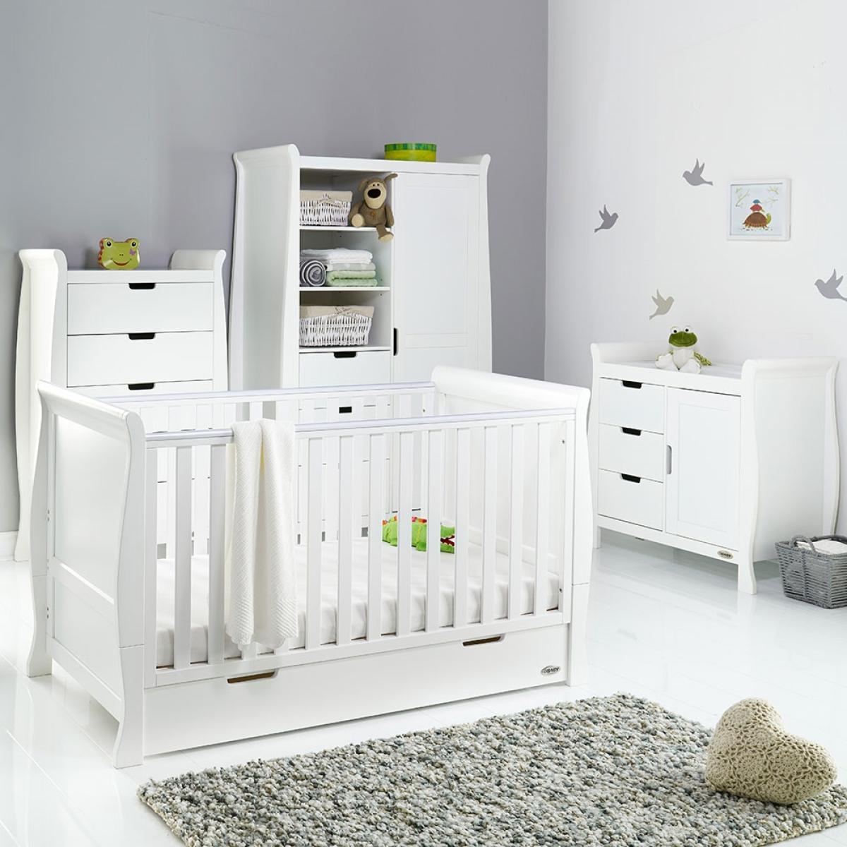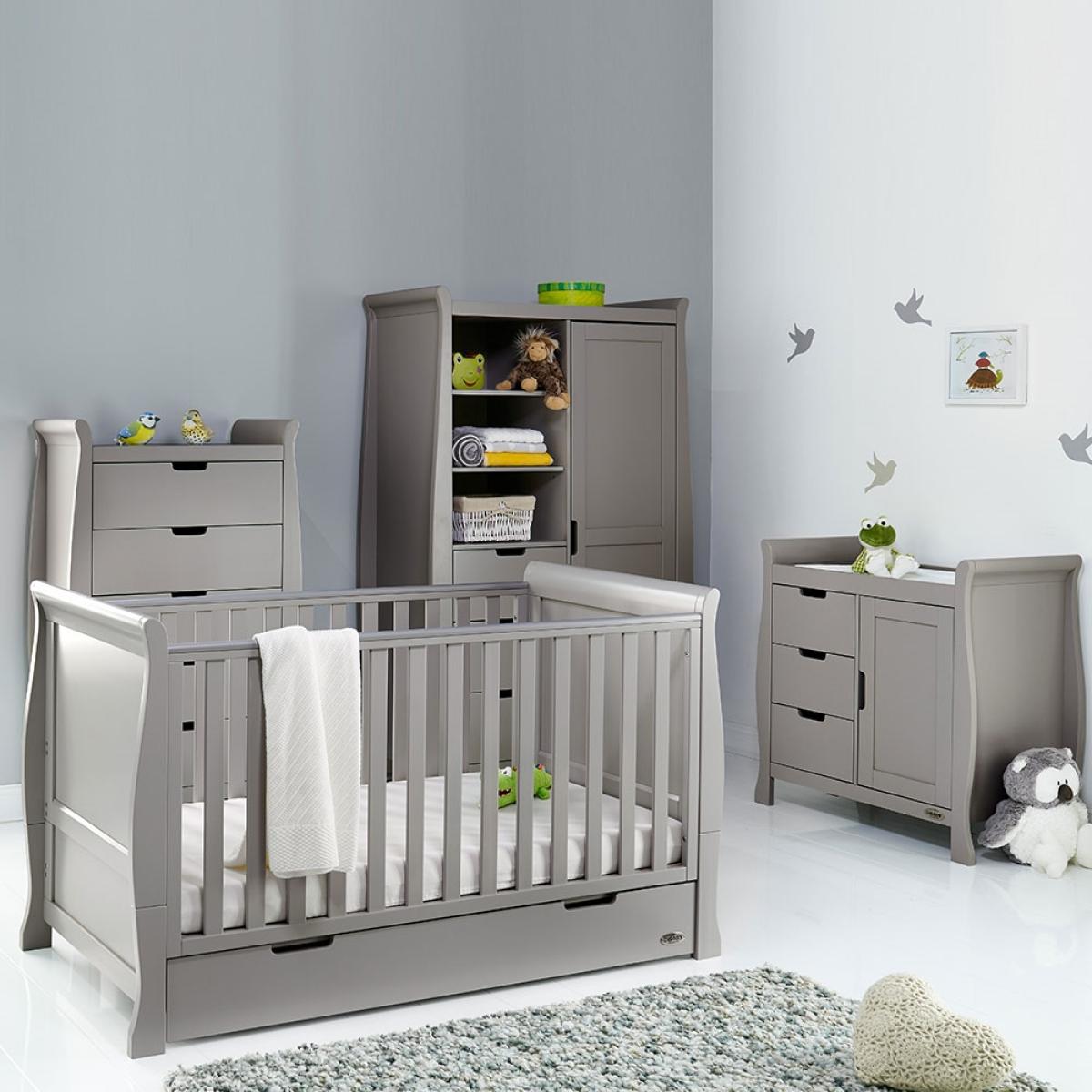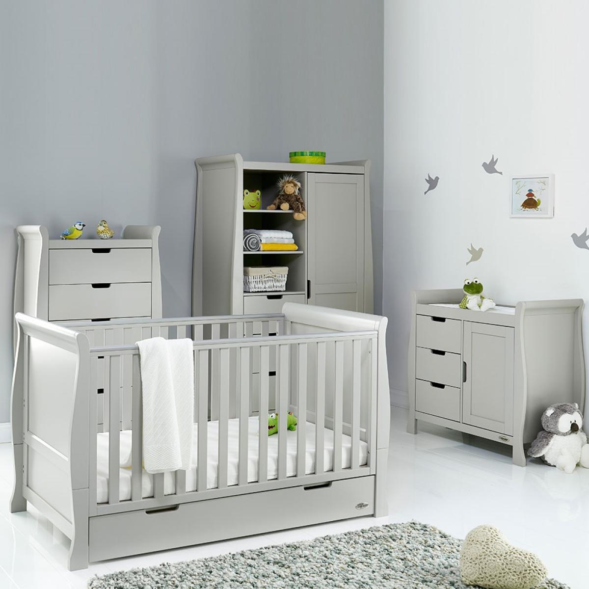 Suitable from birth to 4 years, the stylish Obaby Stamford Sleigh Cot Bed 4 Piece Nursery Furniture Set can be adjusted to suit the needs of your little one as they continue to grow! The sleigh cot bed features 3 height settings, so when your baby starts sitting and standing independently, the mattress base can be lowered, ensuring they are safe and secure at all times. When they've outgrown their baby bed, remove the sides and convert the frame from a cot to a junior bed and continue using this gorgeous design for years to come! Boasting a spacious under-bed drawer, bedding and toys can be kept neat and tidy. Suited to storing clothing, nappies and nursery essentials; the matching tall dresser includes 5 deep drawers while the changing unit provides three extra drawers and a full length cupboard with an adjustable shelf and an elegant top to hold changing mats in place. Including a stunning double wardrobe with additional storage drawers and adjustable shelves, store baby clothes in the full length cupboard with two hanging rails. All drawers open and close smoothly and the recessed handles prevent trapped fingers! Perfect for little hands! With more than enough storage, the nursery will be stress and clutter-free! With other colours to choose from, you are sure to find the ideal set for you and your little bundle!.