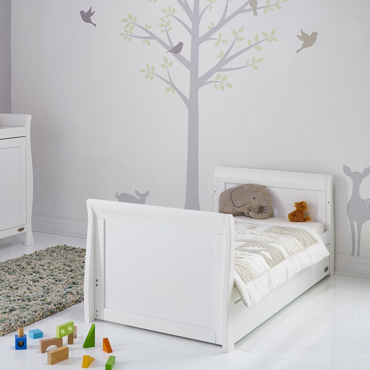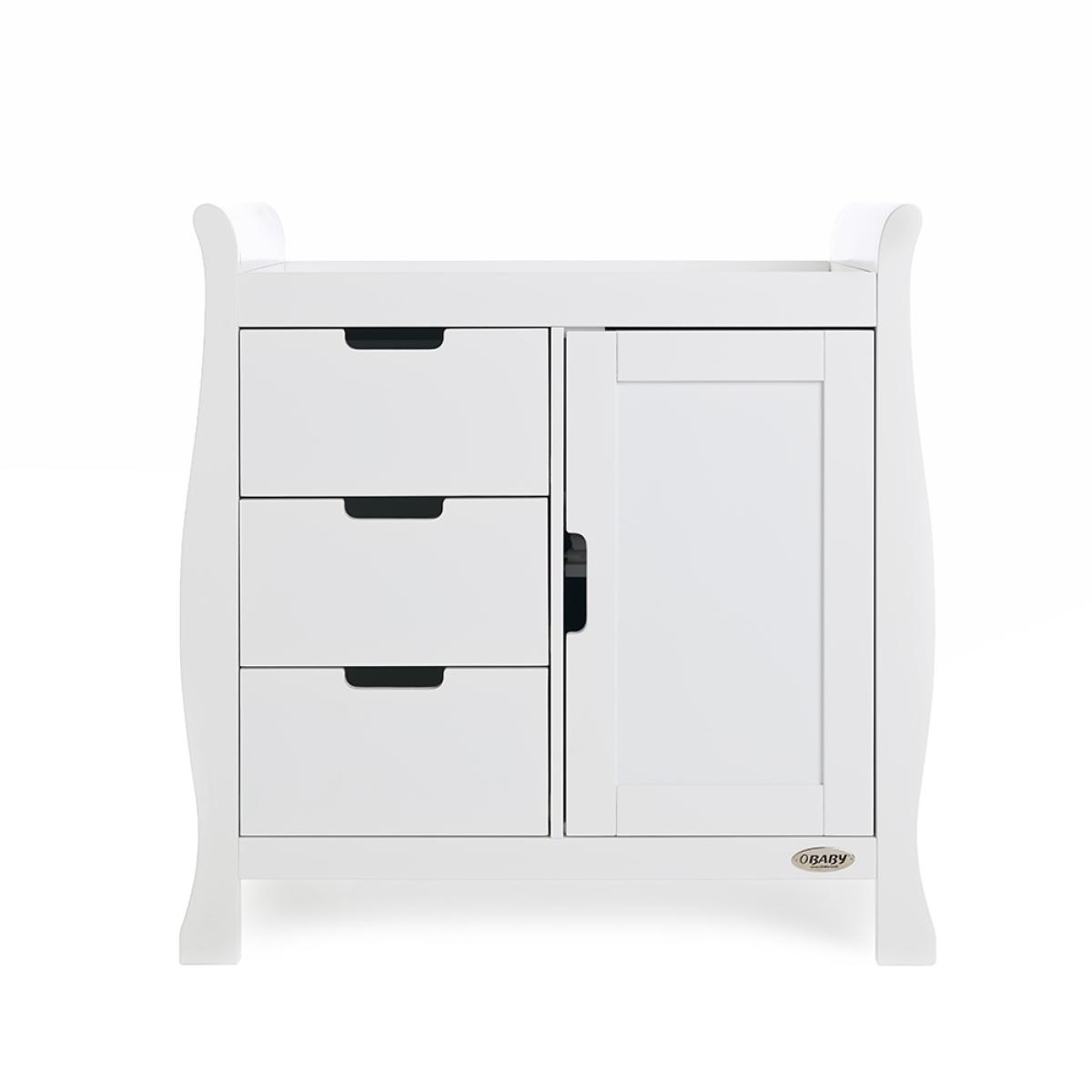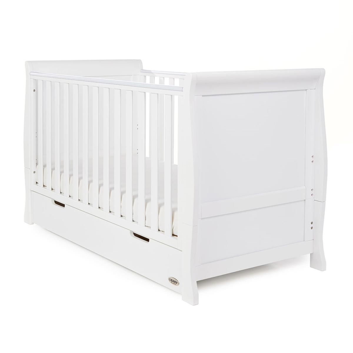 Suitable from birth to 4 years, the stylish Obaby Stamford Sleigh Cot Bed 4 Piece Nursery Furniture Set can be adjusted to suit the needs of your little one as they continue to grow! The sleigh cot bed features 3 height settings, so when your baby starts sitting and standing independently, the mattress base can be lowered, ensuring they are safe and secure at all times. When they've outgrown their baby bed, remove the sides and convert the frame from a cot to a junior bed and continue using this gorgeous design for years to come! Boasting a spacious under-bed drawer, bedding and toys can be kept neat and tidy. Suited to storing clothing, nappies and nursery essentials; the matching tall dresser includes 5 deep drawers while the changing unit provides three extra drawers and a full length cupboard with an adjustable shelf and an elegant top to hold changing mats in place. Including a stunning double wardrobe with additional storage drawers and adjustable shelves, store baby clothes in the full length cupboard with two hanging rails. All drawers open and close smoothly and the recessed handles prevent trapped fingers! Perfect for little hands! With more than enough storage, the nursery will be stress and clutter-free! With other colours to choose from, you are sure to find the ideal set for you and your little bundle!.