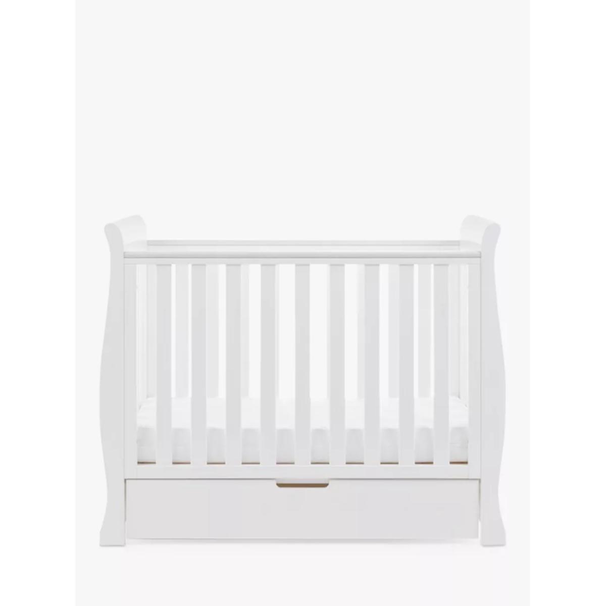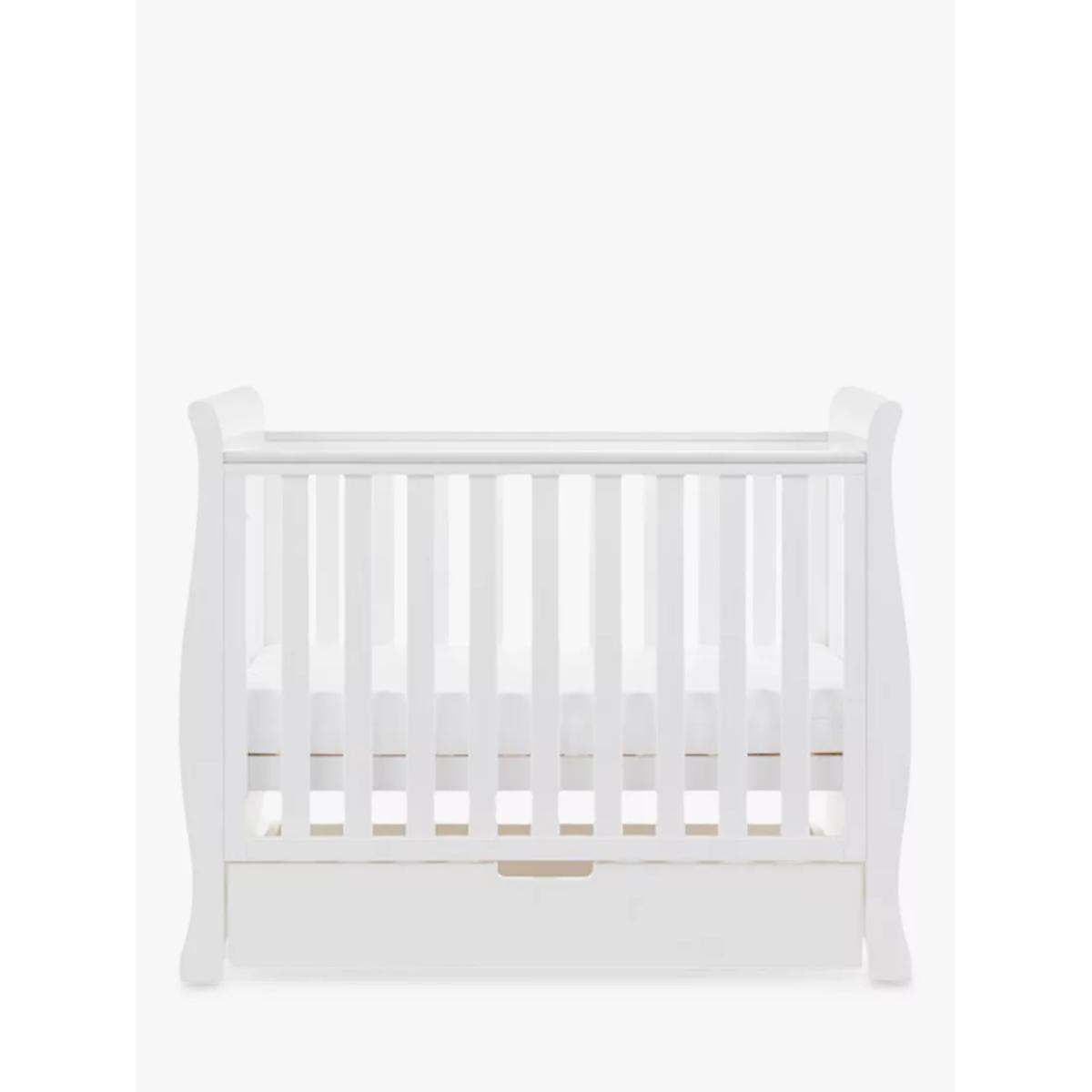The Obaby Stamford furniture range offers families the perfect combination of style, quality and practicality. For those who require the features of a full-size cot but have limited space, the Stamford Space Saver cot is the perfect solution. Needing less space than the Stamford Mini cot bed, the Space Saver cot features the same elegant sleigh design as the rest of the collection, teething rails to protect your little ones delicate first teeth and a three-position adjustable mattress base. The top position allows your newborn to be put down and taken out of the cot easily without unnecessary bending, then as your child grows, learning to sit and stand, the base can be lowered by a further two positions providing extra security and reassurance all the way up to approximately 18 months old. This cotbed requires an Obaby 100 x 50cm mattress, sold separately. The included matching under drawer has a generous 35. L capacity offering parents that much needed extra storage space for their little one’s belongings. Durable wheels ensure that the drawer opens and closes smoothly on any floor surface and recessed handles make sure that there are no protruding handles to catch. For this item, our supplier can deliver to your doorstep, but the drivers cannot enter your property. If you live in a flat, the delivery driver will be able to bring the boxes to the main entrance of the building, but they will not be able to take them up to the door of your flat. Therefore, we recommend having someone with you who can take in the boxes.